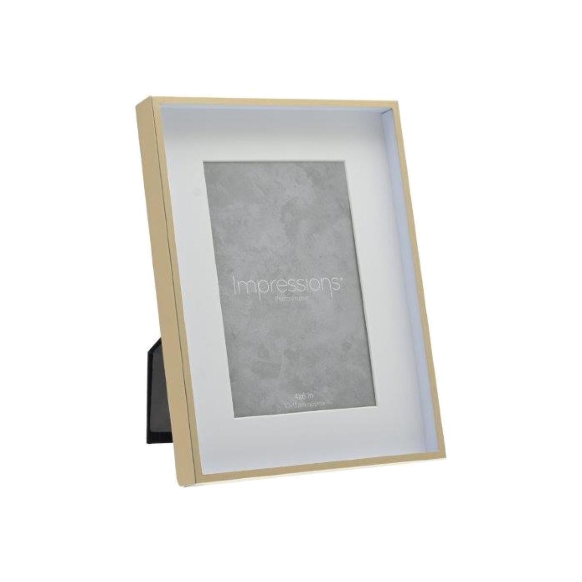 A gold shadow photo frame by IMPRESSIONS. This classic frame complements traditional and modern home decors in equal measure. The aluminium box frame features a gold-coloured border, complete with white mount and black velveteen standing strut. It is designed for either portrait or landscape display using its attached strut. *Packaged in an Impressions box * Gold shadow effect *Aluminium box frame