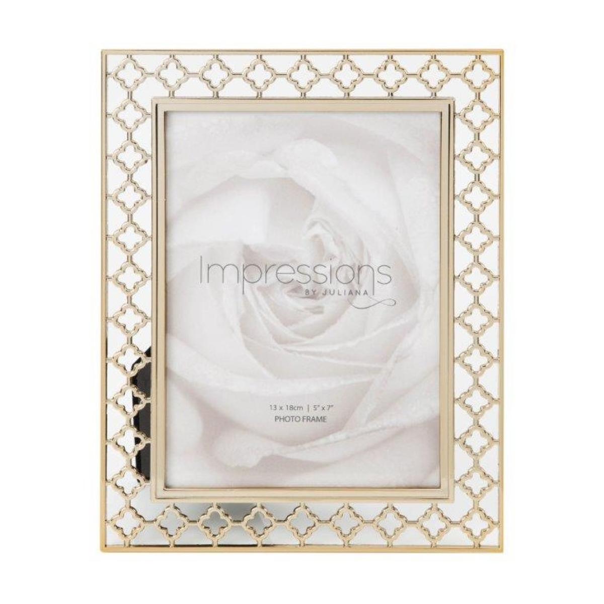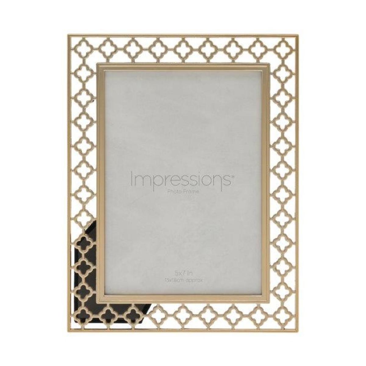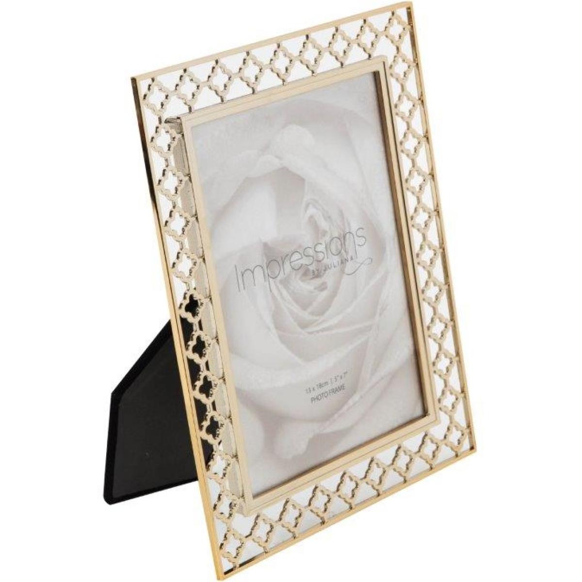An ornate champagne gold metal plated lattice cut photo frame. From IMPRESSIONS - letting your photos speak their thousands words. Inspired by the Moroccan interior trend this is the perfect place for a precious picture. Complete with luxury black velveteen standing strut and signature IMPRESSIONS box. Size - 5" x 7" Gold metal plated Lattice cut style