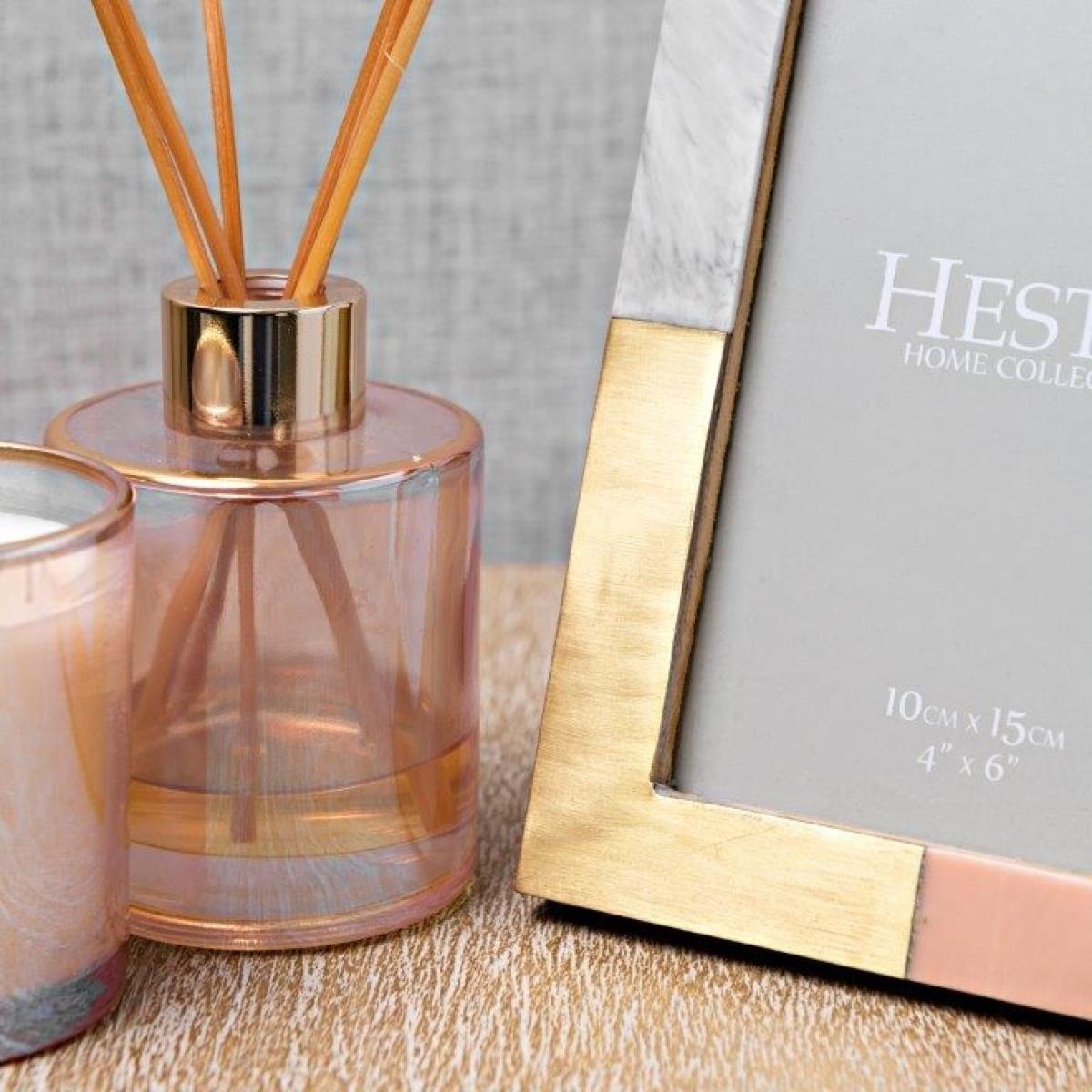 Hestia Refined Glamour White, Grey & Pink Photo Frame with Brass Inlay. A beautifully unique photo frame combining three colours in one enhanced with brass inlays from the HESTIA Refined Glamour Collection. A perfect fusion of Art Deco radiance and that signature HESTIA elegance. Features: Resin photo frame Brass inlay Single aperture White, grey and pink design FSC wood