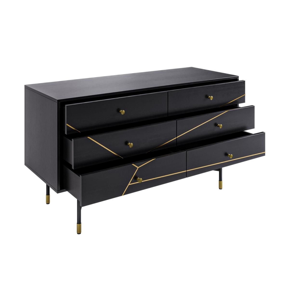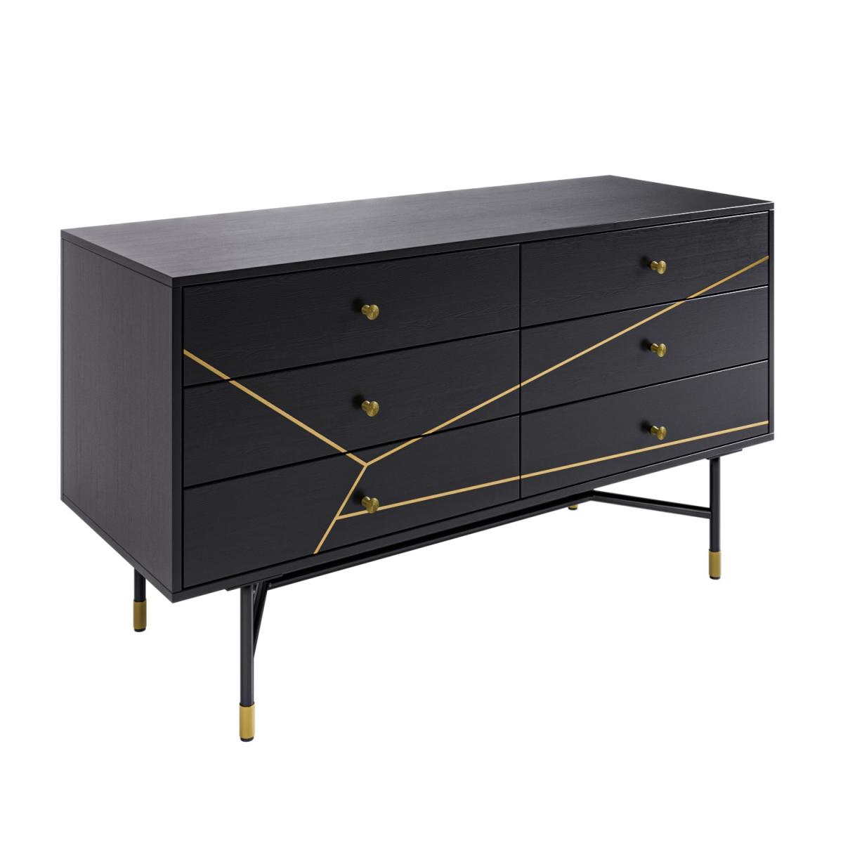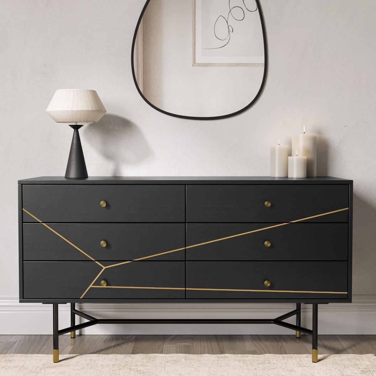 All about me Elevate your bedroom with this stunning large chest of drawers. The sleek woodgrain finish is timeless, and the contrasting gold brass geometric inlay across the front gives it a modern edge. There's plenty of storage space to store clothing and other bedroom essentials, and the top is perfect for creating a personal space with photos, ornaments, or even a mirror. Plus, it would look great in the main living space as a sideboard or dresser. Need to know Product dimensions: W130 x D49 x H74 cm Base to floor height: 25cm Inner drawer dimensions:W57 x D38 x H10 cm Product weight: 55.5kg Number of drawers: 6 Colour:Black and gold (inlay, handles and leg tips) Finish: Lacquered (wood), powder coated (legs and handles) and brass (inlay) Material: Solid mango wood, iron (legs, handles), MDF and metal (runners) Assembly required: No Packaging dimensions: W138 x D58 x H84 cm Packaging weights: 67kg