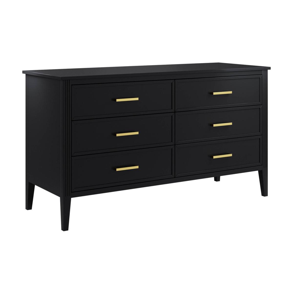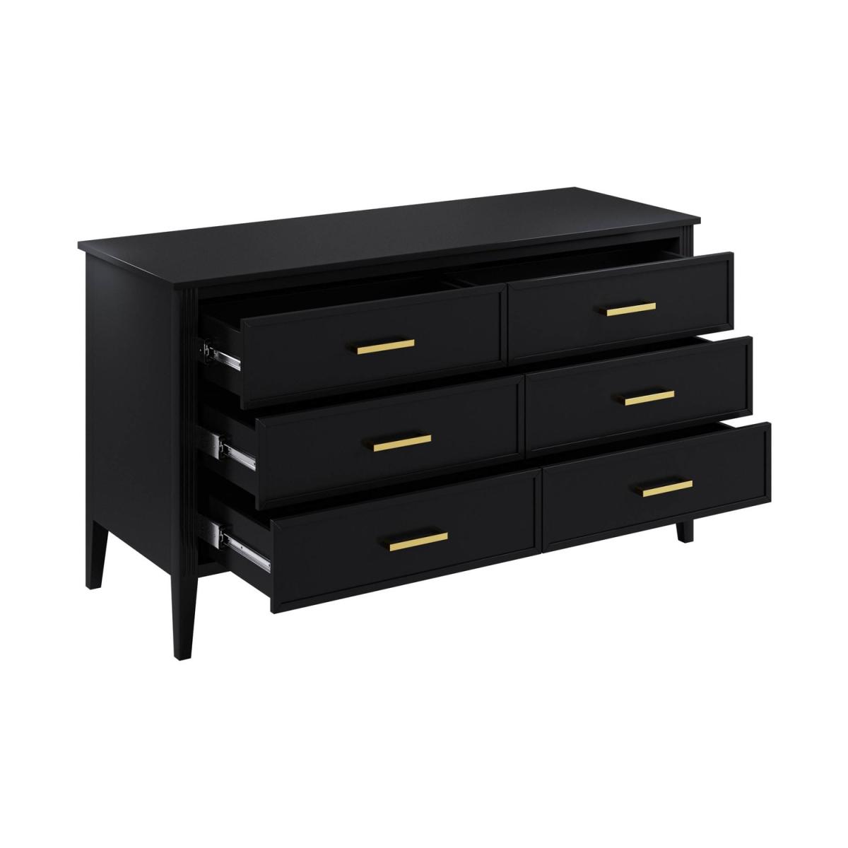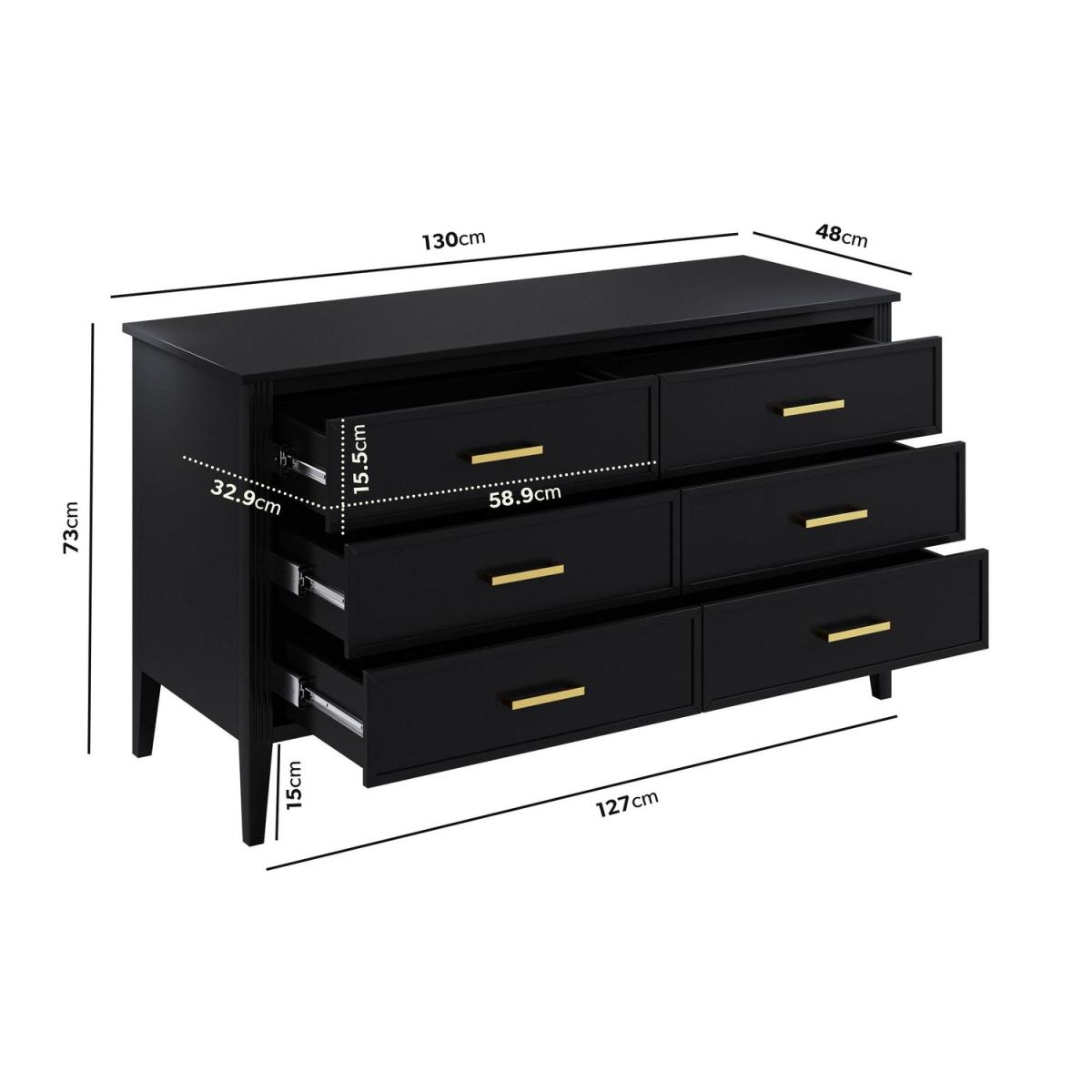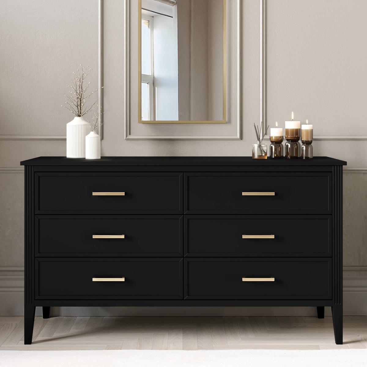 The matt black finish gives a modern and minimalist vibe and blends effortlessly with various colour schemes. Classic charm meets modern sophistication with fluted side details and golden accents. Offers lasting stability and elegant style while keeping the space feeling open and airy. Perfect for both traditional and contemporary interiors. 6 spacious drawers provide a stylish and practical way to organise your clothing and accessories. The Wide Delilah Chest of Drawers is a stylish addition to your bedroom. This timeless piece is a modern twist on a usually classic design. Providing ample storage for your clothes, this chest comes with 6 spacious drawers, complete with elegant brass handles. Crafted with solid pine, this nightstand is built to last. Dimensions: W130 x D48 x H73 cm Base to floor height: 15 cm Inner drawer dimensions:W53.1 x D32.9 x H9.8 cm Weight: 40.5kg Number of drawers: 6 Colour: Black Finish: Matt Material: Solid pine & MDF Assembly required: Yes Packaging dimensions: Box 1: W63 x D140 x H17.4 cm