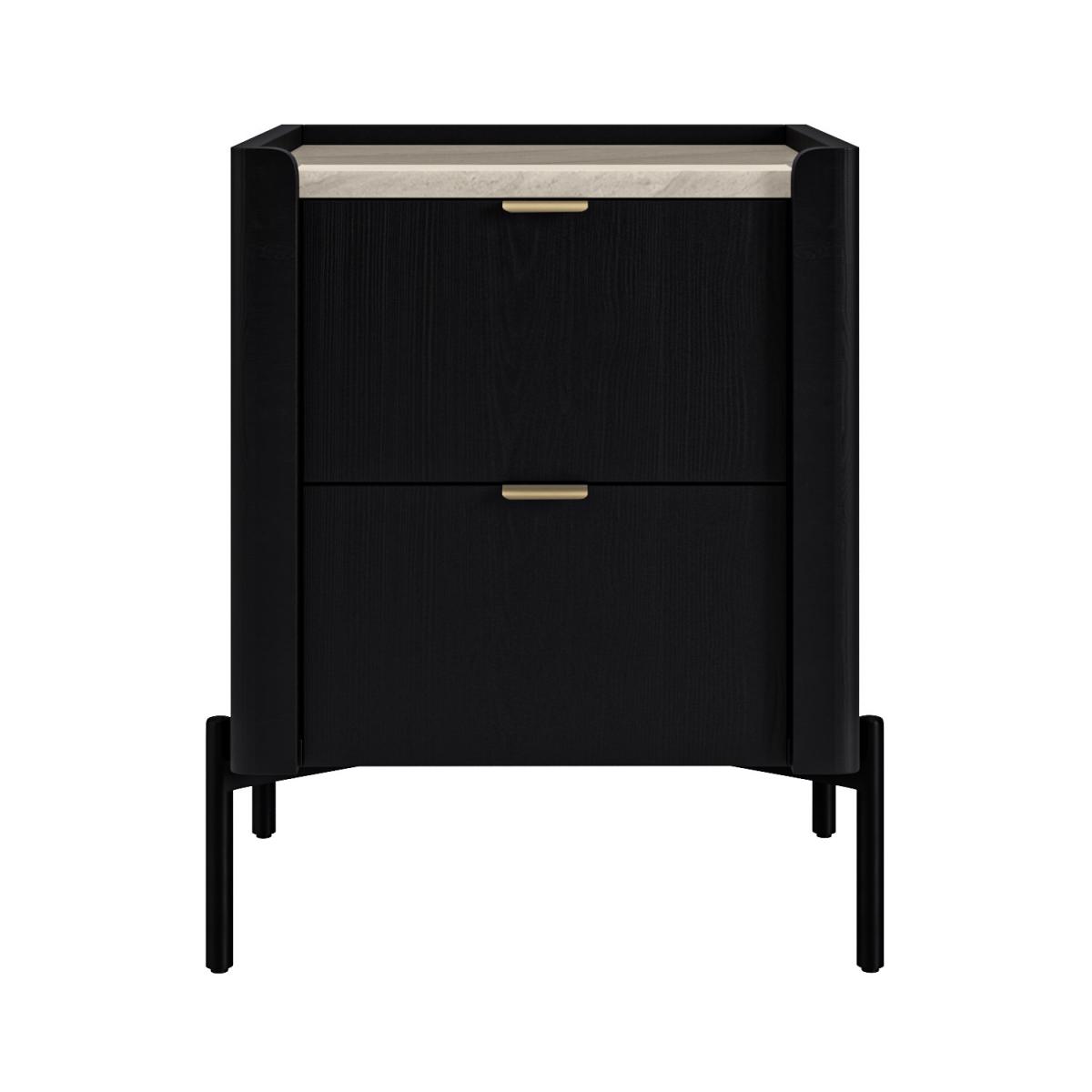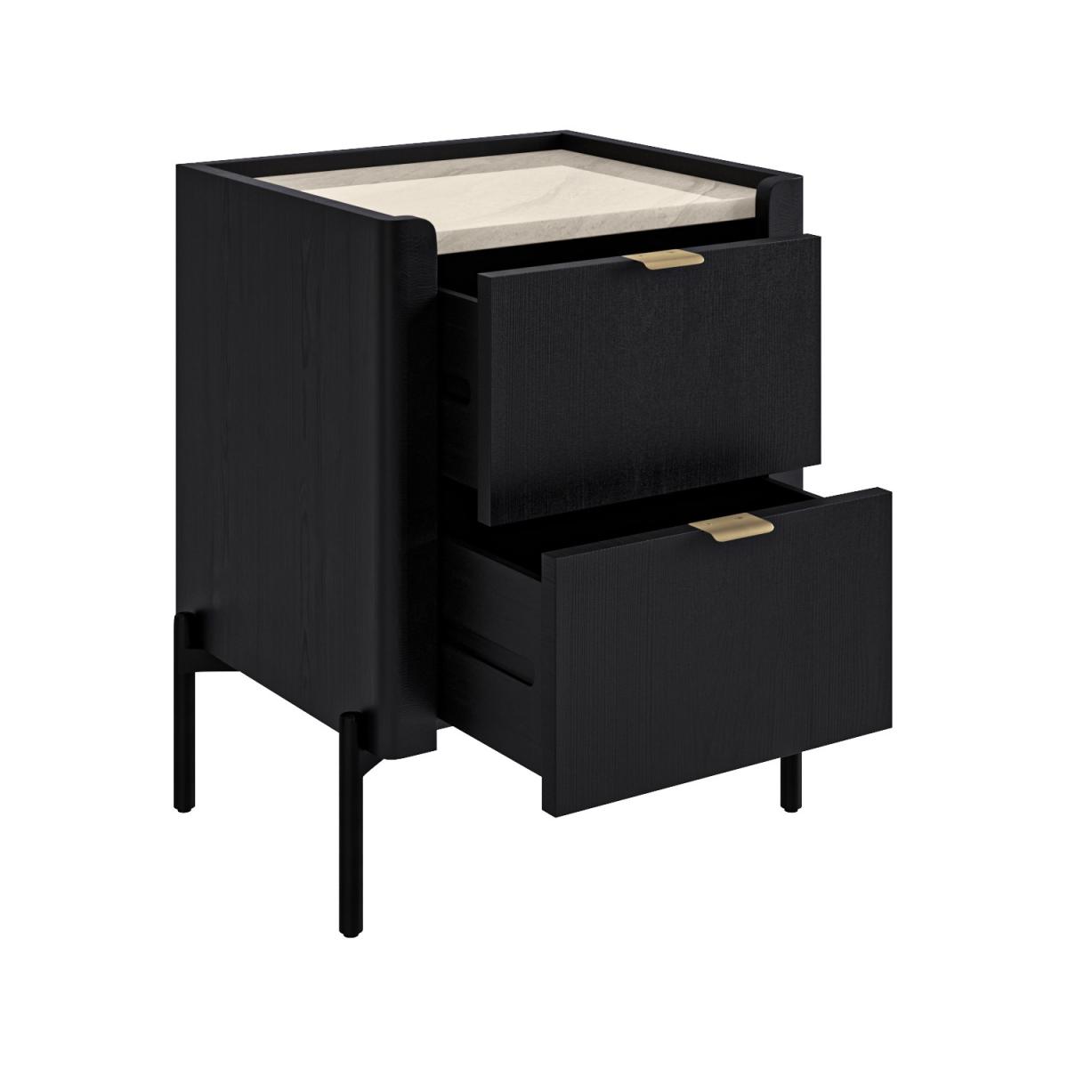 All about me Add a touch of style to your bedroom with the Gio nightstand. The two drawers feature wooden drawer runners for a smooth opening and are perfect for stowing away any night-time essentials. Made with solid oak and oak wood veneer with stag legs, it's built to last. The gold handles complement the black lacquered finish beautifully. Need to know Dimensions:W50 x D40 x H60 cm Drawer dimensions:W32.8 x D28.8 x H14.5 cm Number of drawers: 2 Weight: 19.5 kg Colour:Black, cream/beige top, and gold handles Finish: Lacquered, marble effect top and powder-coated handles Material: Solid oak, oak wood veneer, concrete top, and metal handles Runners: Wooden Assembly required: Yes – just attach the legs Packed dimensions: W54 x D48 x H56 cm