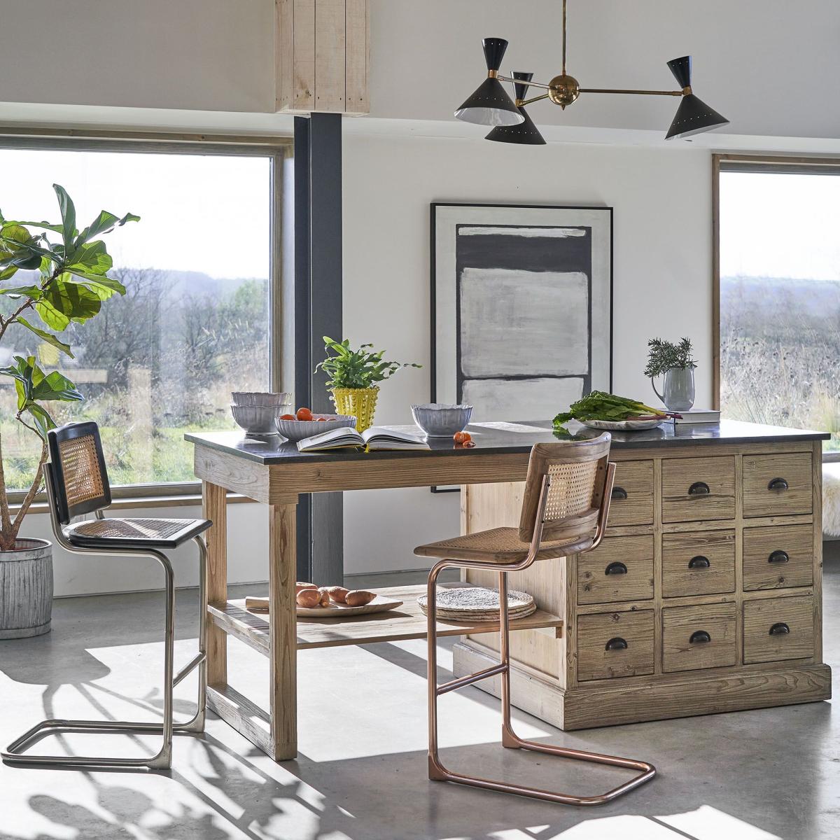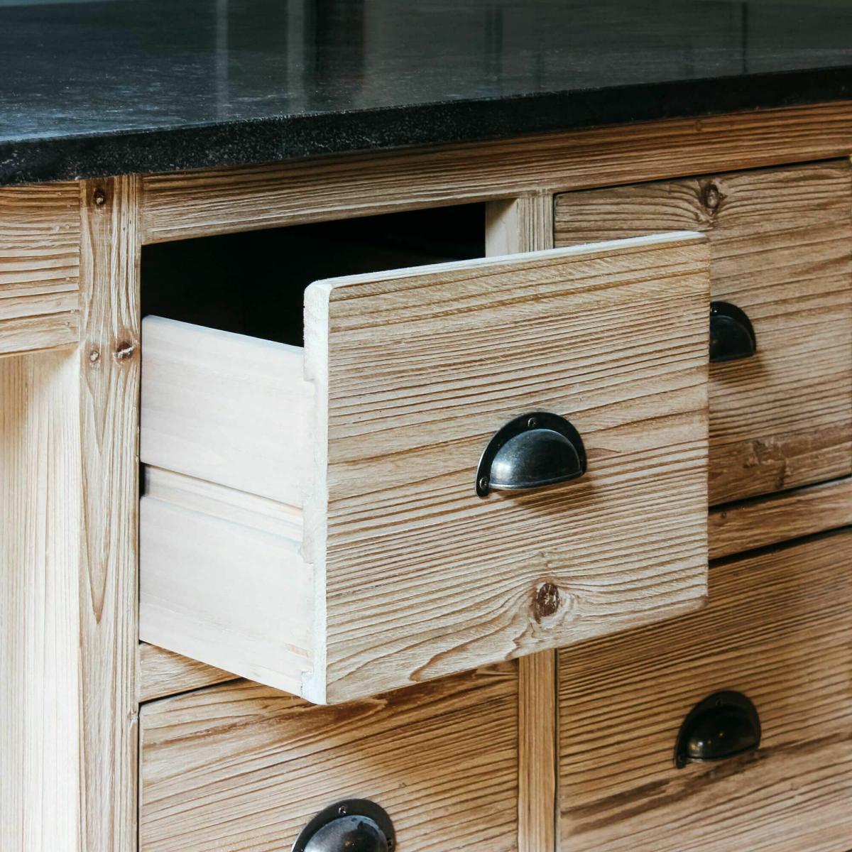 The most organised way to store and display your kitchen essentials. This rustic kitchen island features a stoneware top, a distressed finish and nine handy drawers to collate utensils or your growing spice collection. Psst,. To download our handy guide to check if your new furniture will fit correctly into your space before you order. Due to the size and weight of this item, additional charges may be applied for delivery to floors above ground level, and also to spaces with restricted access. Please contact our. Customer Services. Team for more information.