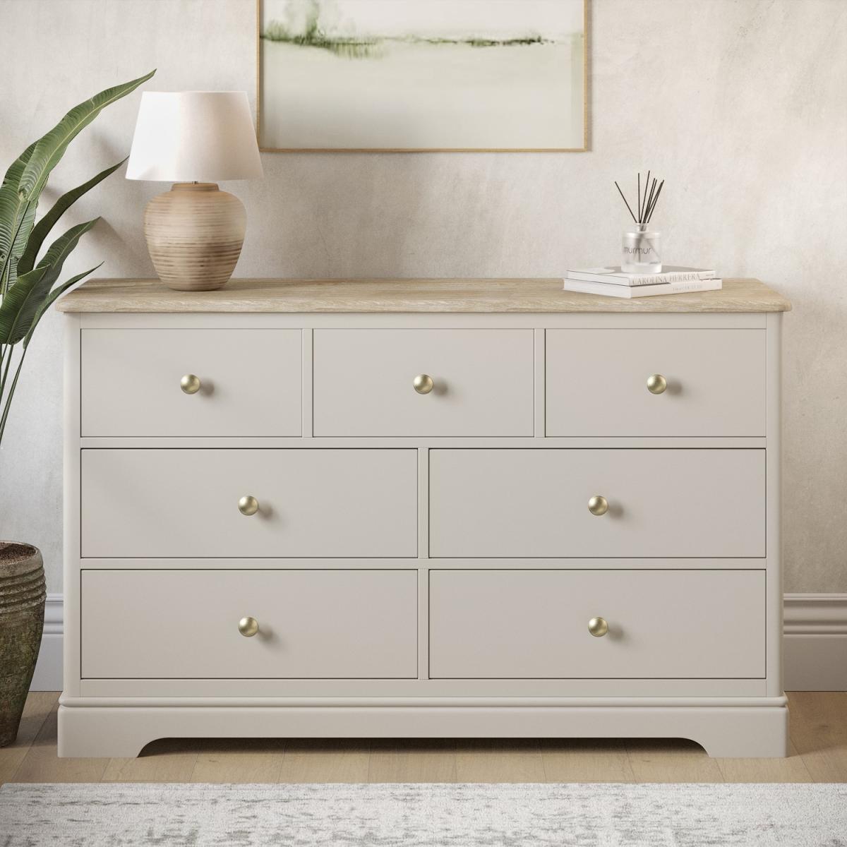 All about me Elevate your bedroom with this modern farmhouse chest of seven drawers. With its beautiful oak top and cream painted finish, it's sure to complement any bedroom decor. There's plenty of storage options, and at 130cm long, this double chest of drawers is perfect for holding a large mirror or even a TV. Made with solid oak and pine wood, it's so durable. Style it with the other pieces from the Alexander bedroom furniture to complete the look. Need to know Product dimensions:W130 x D40 x H80 cm Small drawer dimensions:W36.1 x D28.8 x H16.8 cm Large drawer dimensions:W56.4 x D28.8 x H16.8 cm Product weight: 44.5kg Number of drawers: 7 (3 small, 4 large) Colour: Cream and natural oak Finish: Painted and brushed nickel (handles) Material:Solid oak top, solid pine wood (frame), MDF (painted sections), wooden runners and metal (handles) Assembly required: No Packaging dimensions: W138 x D48 x H90 cm Packaging weights: 53kg