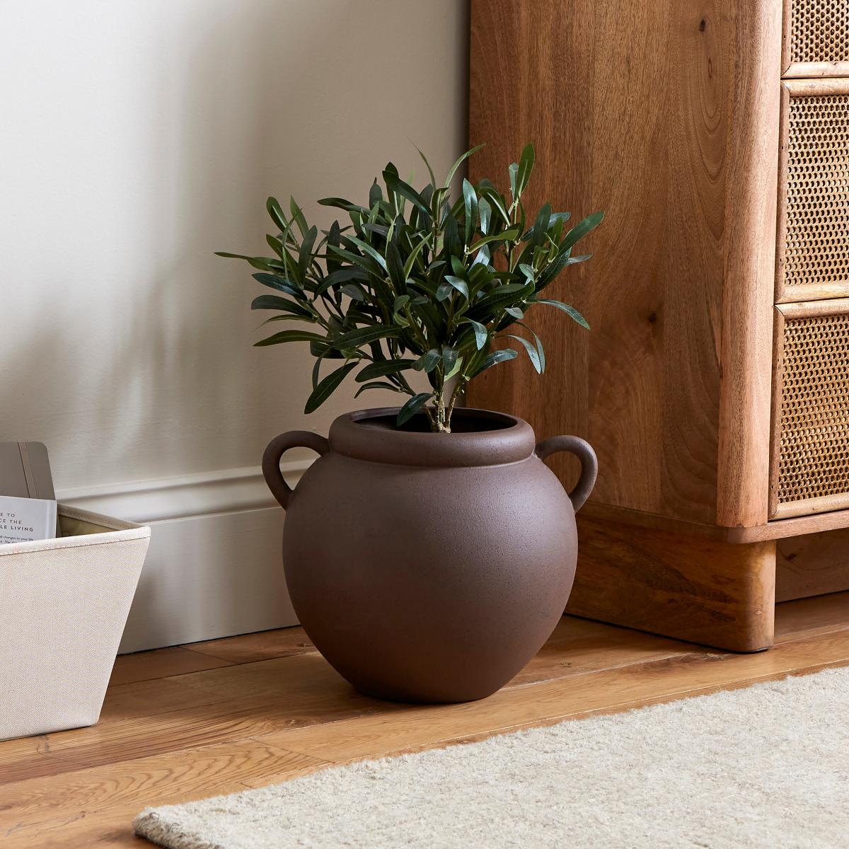 The wide stone vase with handles in a rich bitter chocolate tone is a versatile piece that adds warmth and depth to various interiors. I love how its substantial, tactile form works well in both modern and rustic schemes, especially when paired with natural textures like timber, linen, or greenery. It’s perfect for centrepieces on dining tables or consoles, and you can style it with fresh flowers, dried botanicals, or even leave it empty for a minimalist statement. Practical tip: use it as a focal point in neutral palettes to introduce contrast without overwhelming the space. Its substantial size and colour make it a great investment piece that grounds a room and complements both contemporary and classic settings.
