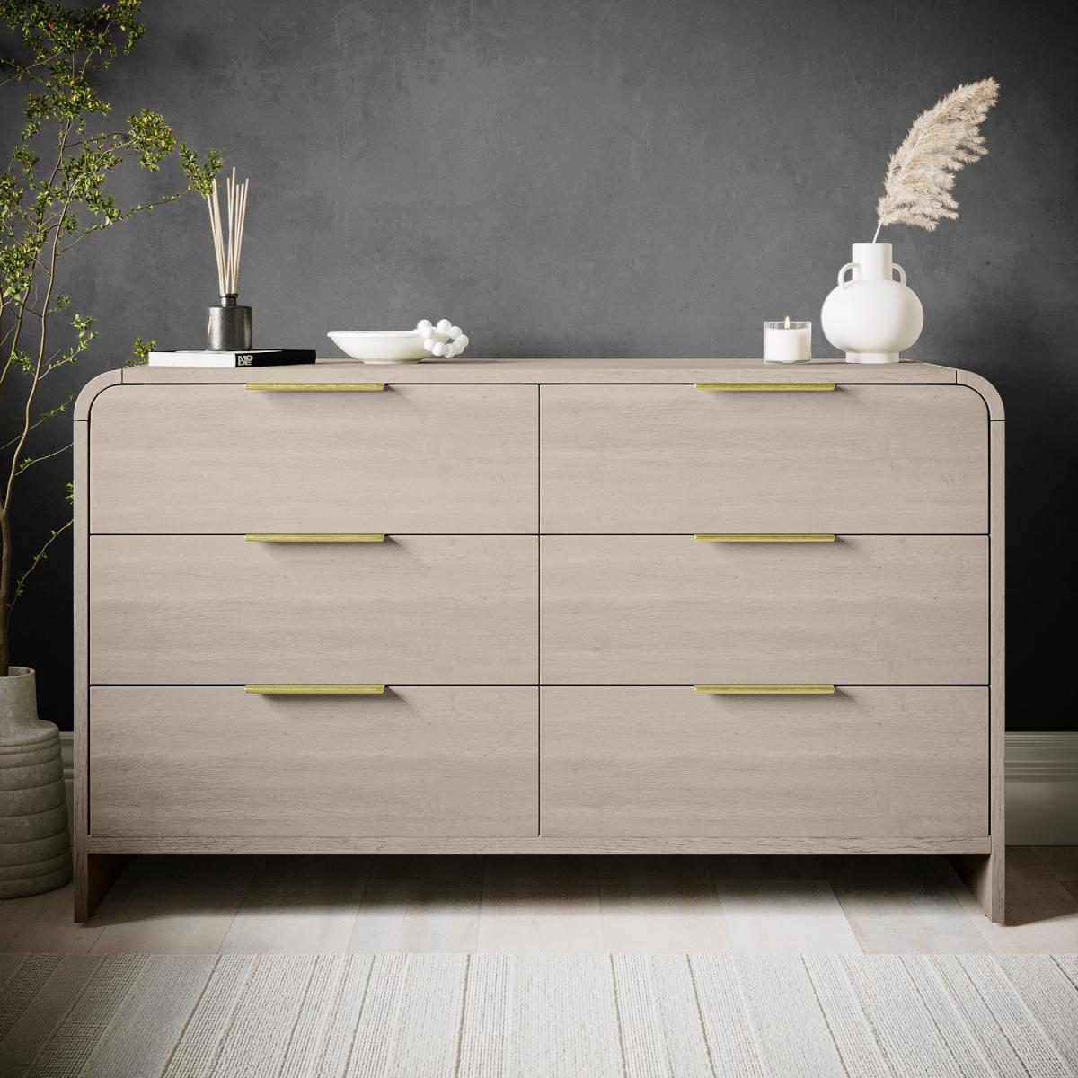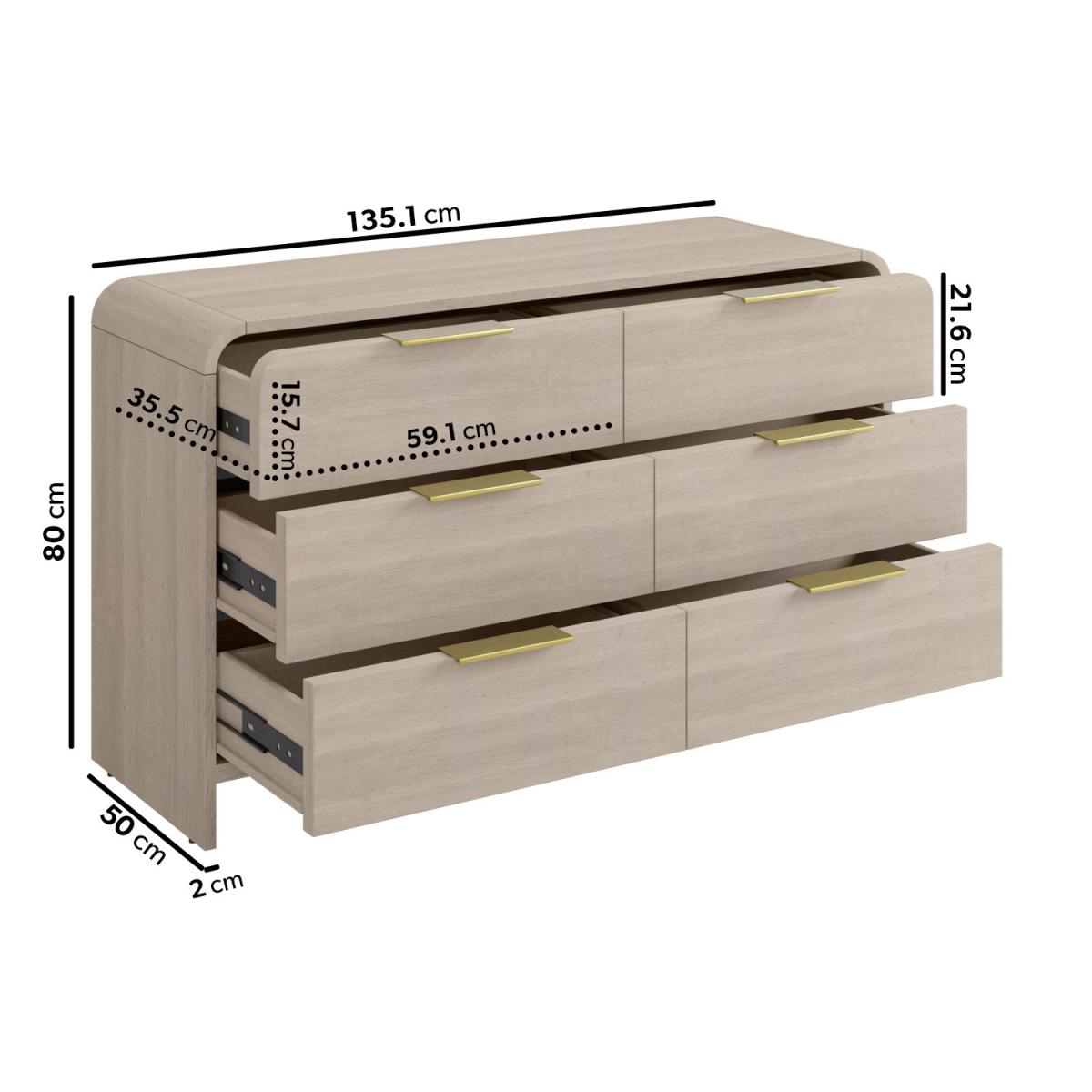 All about me Add an instant focal point in your bedroom with this stylish chest of six drawers. With clean lines, curved edges and a flawless smooth finish, it'll suit any décor. At 50cm deep and 135cm long, the chest offers plenty of storage, plus it's perfect for placing a large mirror or even a TV. Need to know Product dimensions: W135 x D50 x H80 cm Inner drawer dimensions:W59.1 x D33.5 x H15.7 cm Product weight: 38.8kg Number of drawers: 6 Colour: Natural and gold (handles) Finish: Natural and brushed gold (handles) Material: Solid pine wood, MDF (drawer base and back panel only), metal runners and metal (handle) Wall straps included: Yes Assembly required: Yes Packaging dimensions: Box 1:W66.2 x D51.6 x H13.6 cm / Box 2: W141.7 x D55.6 x H10.6 cm Packaging weights:Box 1: 27.1kg / Box 2: 18.4kg
