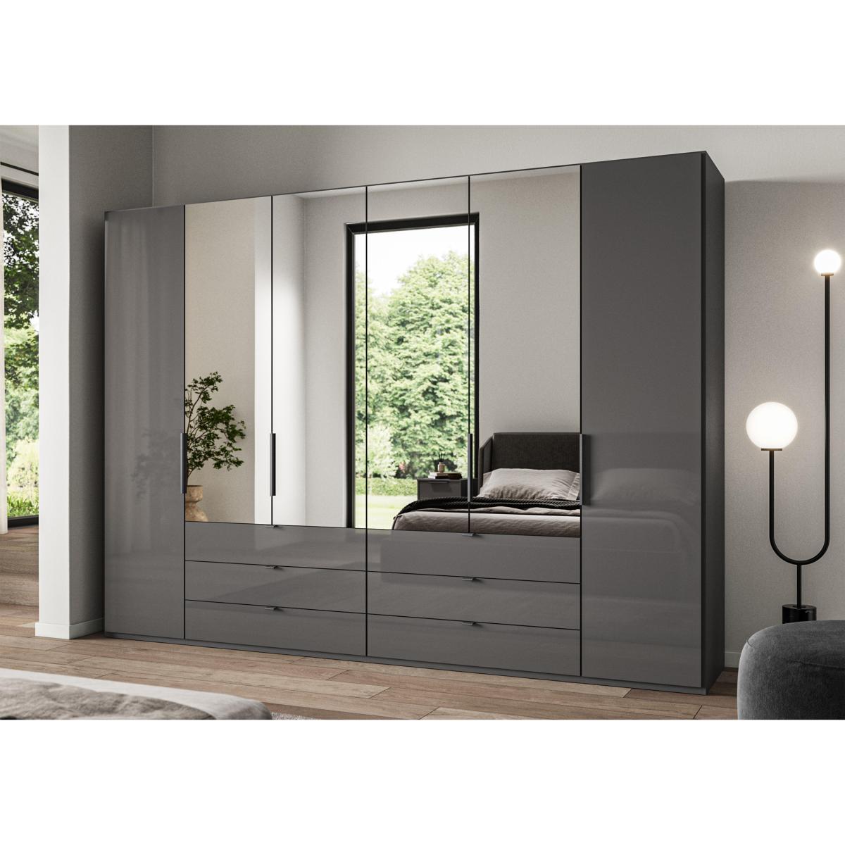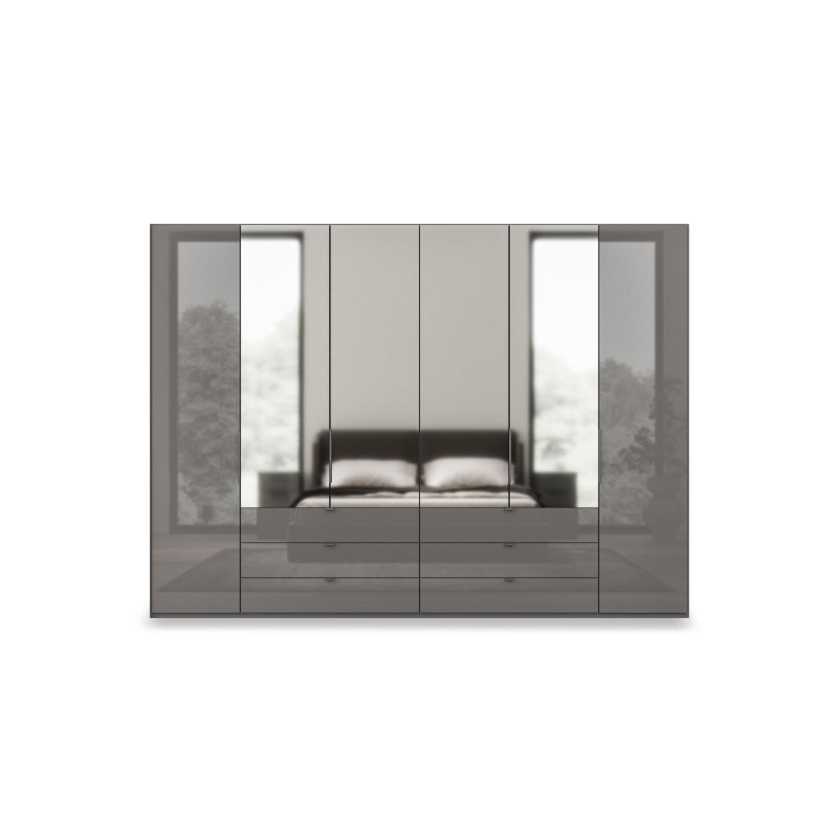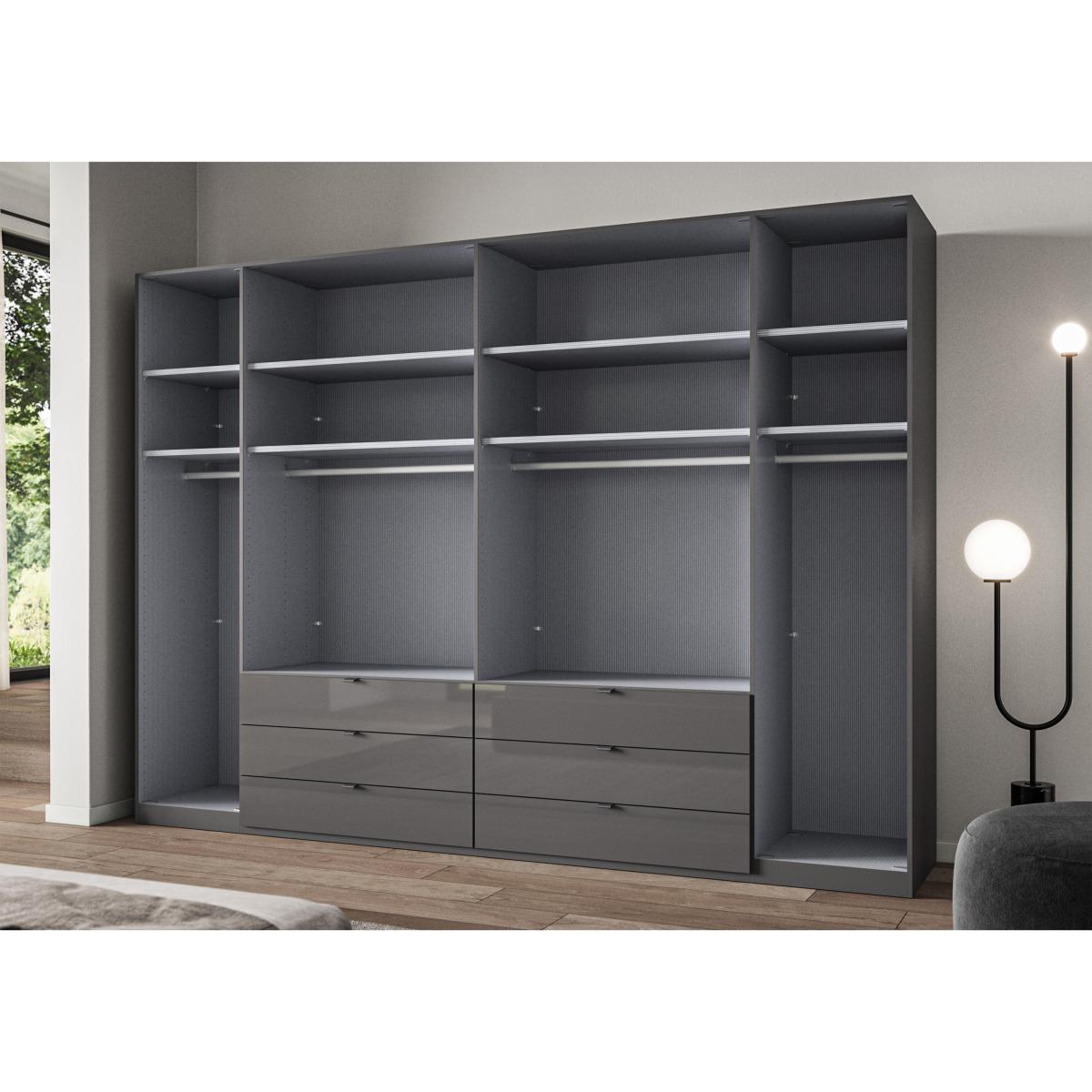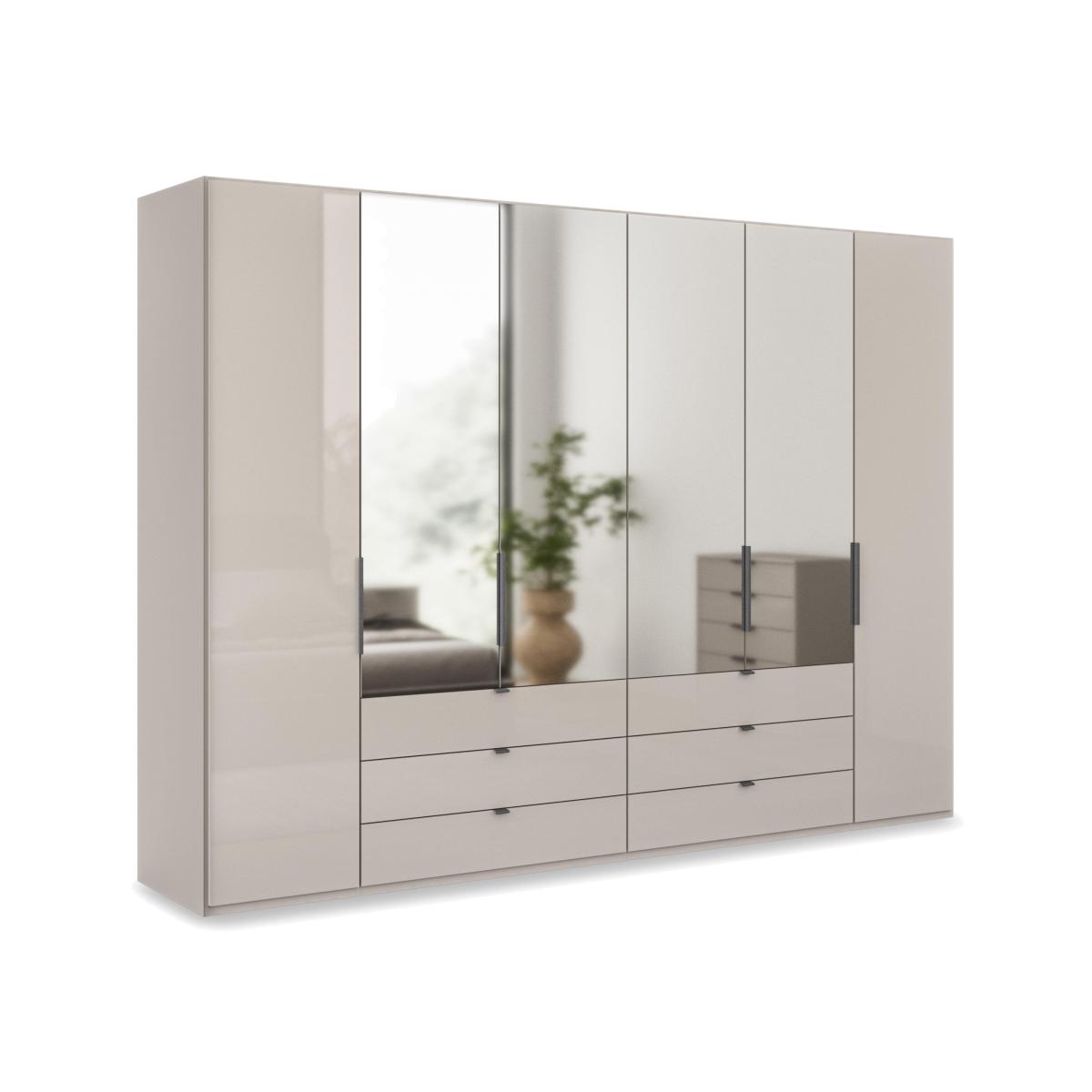 Sleek on the outside, spacious on the inside. Whichever way you look at it, the bedroom furniture in our Wiemann Amara range is absolutely stunning. With their glass doors, the range’s large-scale wardrobes have a finish that brings a high-end modern look to any bedroom. And with a choice of wardrobe configurations – hinged door, bifold door, combo with built-in drawers and even bifold combo – there’s a style that works for your space. Inside each wardrobe, you’ll find adjustable shelves and hanging rails, and you can even add extra fittings like drawer units, LED lights and more. Sustainably made in Germany, the Wiemann Amara range of glass wardrobes and chests of drawers is exclusive to Furniture Village. Simply stunning inside and out, this six-door combi wardrobe has elegant glass doors and drawers, two mirror doors and spacious and well-designed bedroom storage. In a choice of sophisticated colour finishes. Why you'll love it Enjoy sleek style and spacious storage with this stunning 6-door combi wardrobe. Grand in scale, this combi wardrobe suits larger bedrooms. Glass doors, glass drawers and wardrobe frame in a choice of colours. With 4 crystal mirror doors and 6 built-in drawers. Soft-closing doors and drawers have coordinating slate-coloured handles. There are 2 adjustable shelves and an adjustable hanging rail in each compartment. Customise this wardrobe with additional fixtures and fittings, available separately. This wardrobe is sustainably made in Germany by Wiemann. A Furniture Village exclusive design. This 300 cm 6-door combi wardrobe with a glass and mirror finish is part of our Wiemann Amara range. What you need to know Delivered, assembled and installed for you free of charge. Standard internal storage comprises 2 adjustable shelves and 1 adjustable hanging rail per compartment. Compatible interior and exterior fittings are available for this wardrobe at an additional cost. Dust with a lint-free cloth. Do not use silicone-based furniture polishes. Our exclusive Wiemann Amara range includes bifold and hinged wardrobes and chests of drawers. WARNING! Item code: AMRA4687PGRY-001