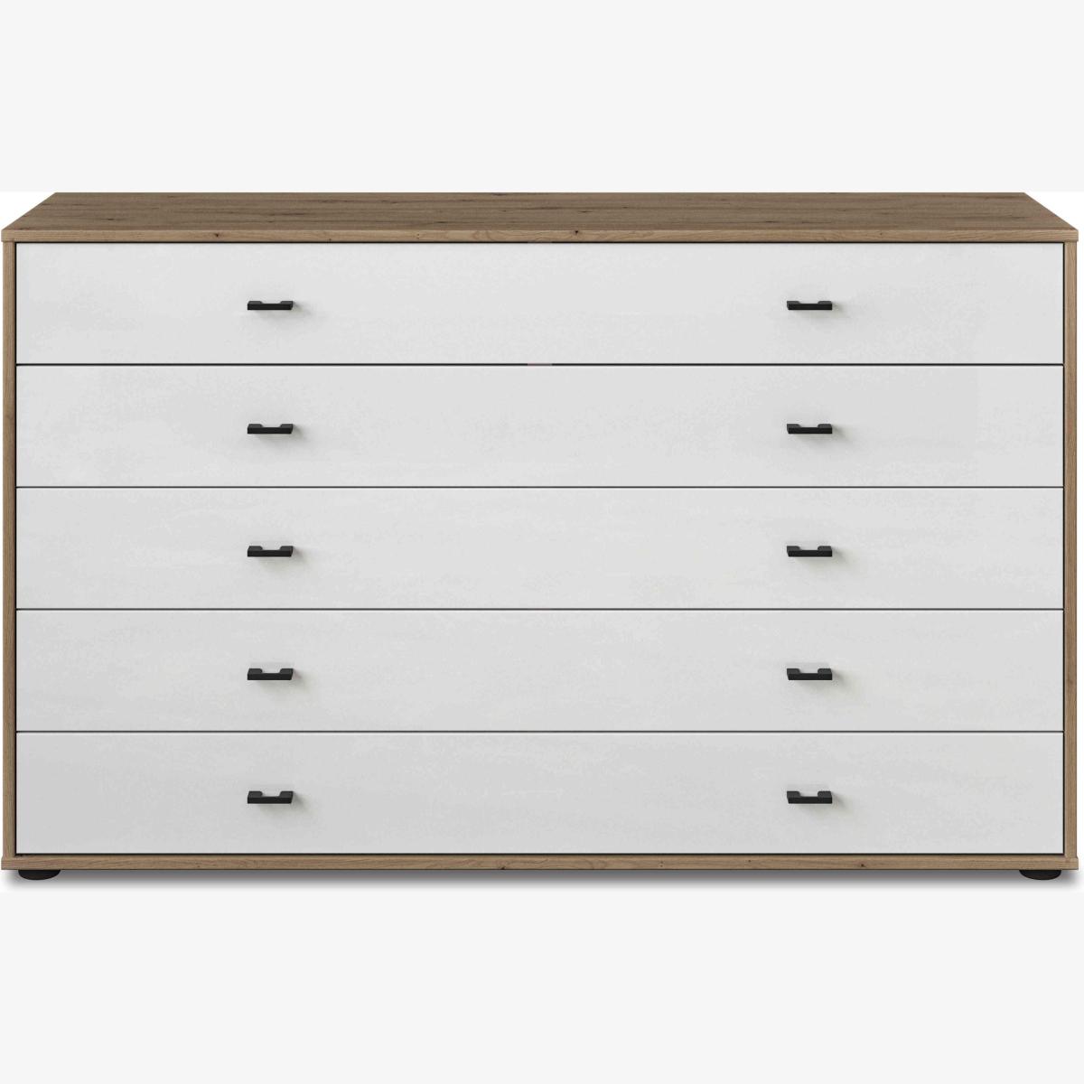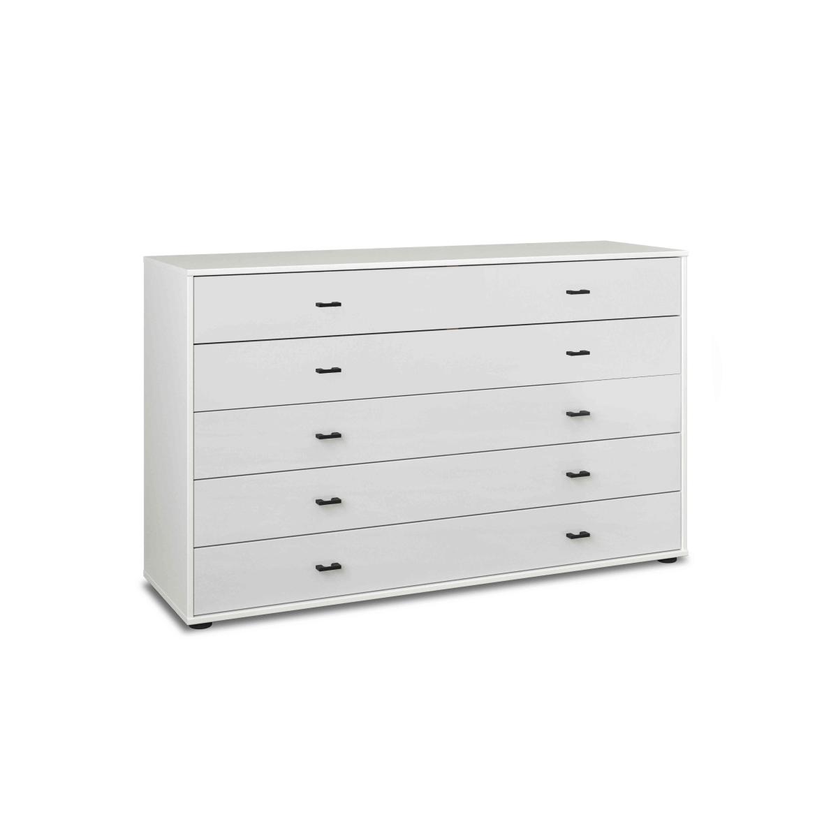 Designed and made for us by Wiemann, our Dallas range of bedroom furniture offers a dazzling array of stylish options for bedrooms large and small. Sliding door and hinged door wardrobes come in all sizes and in a choice of wood-effect and glass colours, and many also have useful full-height mirrored doors. Complete the look with matching chests of drawers and bedside cabinets. The German-made craftsmanship is exceptional and includes high-end touches like soft-close doors and drawers and a wide range of extra wardrobe fittings. Superb storage, on-trend style and incredible value – that’s the Wiemann Dallas range. We love this very wide five drawer chest of drawers. It has plenty of drawer space for clothing, plenty of surface space for decoration and display, and plenty of sleek modern bedroom style. Why you'll love it Super-size your storage with this fabulous 5-drawer glass chest. Contemporary style that’s so well-designed. High-quality German craftsmanship at an exceptional price. Bright white finish with striking white glass drawer fronts. Soft-close drawers with slate-coloured handles. Assembled in your home free of charge. Made by Wiemann exclusively for Furniture Village. This 141 cm 5-drawer glass chest is part of our Wiemann Dallas range. What you need to know This finish may show surface scratches under certain lighting. Do not place in direct sunlight. Do not use abrasive cleaning products. Wipe clean with a damp cloth, and dry with a soft duster. We recommend using coasters and placemats at all times. This range includes a huge choice of hinged and sliding wardrobes, and chests of drawers. WARNING!