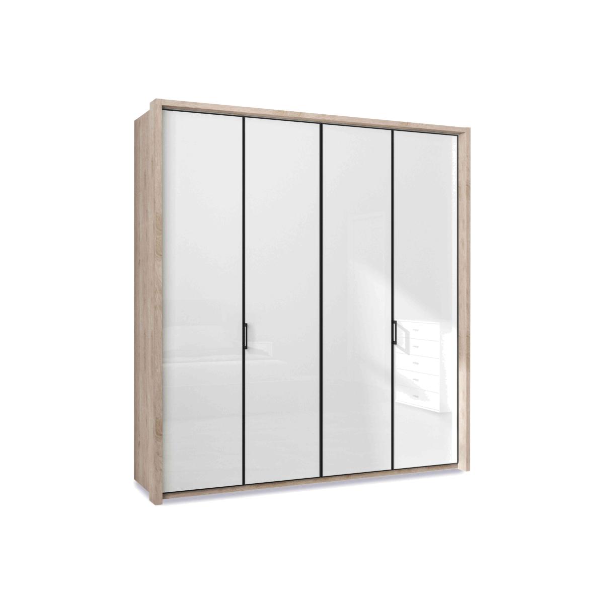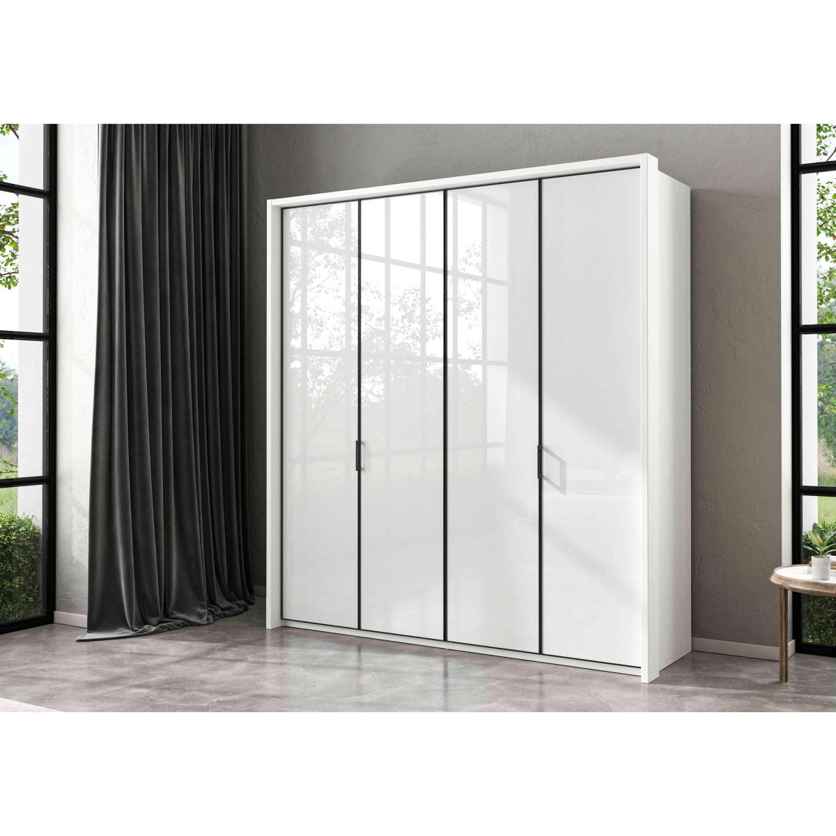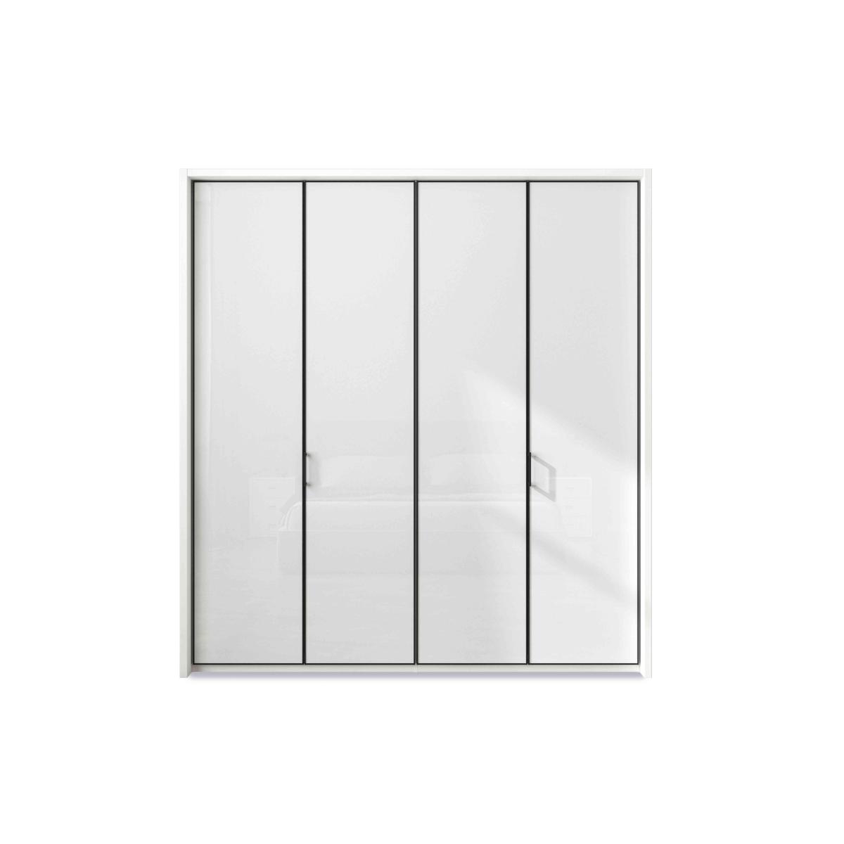 Designed and made for us by Wiemann, our Dallas range of bedroom furniture offers a dazzling array of stylish options for bedrooms large and small. Sliding door and hinged door wardrobes come in all sizes and in a choice of wood-effect and glass colours, and many also have useful full-height mirrored doors. Complete the look with matching chests of drawers and bedside cabinets. The German-made craftsmanship is exceptional and includes high-end touches like soft-close doors and drawers and a wide range of extra wardrobe fittings. Superb storage, on-trend style and incredible value – that’s the Wiemann Dallas range. Create the stylish clutter-free bedroom you’ve always wanted with this Wiemann four-door wardrobe. With its glass doors and generous proportions, you’ll enjoy sleek style at a great-value price. Why you'll love it This 4-door glass-fronted hinged wardrobe is the perfect mix of style and storage. Contemporary style on a grand scale with superb interior storage. High-quality German craftsmanship at an exceptional price. Bright white finish with striking white glass doors. Soft-close doors, slate-coloured handles and stylish edge profiles. Assembled in your home free of charge. Made by Wiemann exclusively for Furniture Village. This 207 cm 4-door hinged glass wardrobe is part of our Wiemann Dallas range. What you need to know 2 shelves and 1 hanging rail in each wardrobe compartment. This finish may show surface scratches under certain lighting. Do not place in direct sunlight. Do not use abrasive cleaning products. Wipe clean with a damp cloth, and dry with a soft duster. This range includes a huge choice of hinged and sliding wardrobes, and chests of drawers. WARNING!