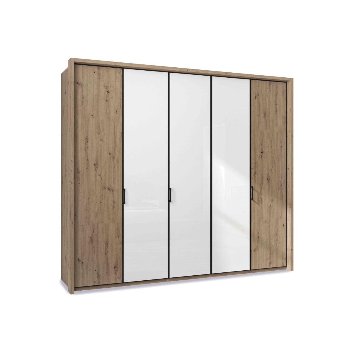Designed and made for us by Wiemann, our Dallas range of bedroom furniture offers a dazzling array of stylish options for bedrooms large and small. Sliding door and hinged door wardrobes come in all sizes and in a choice of wood-effect and glass colours, and many also have useful full-height mirrored doors. Complete the look with matching chests of drawers and bedside cabinets. The German-made craftsmanship is exceptional and includes high-end touches like soft-close doors and drawers and a wide range of extra wardrobe fittings. Superb storage, on-trend style and incredible value – that’s the Wiemann Dallas range. Large bedroom? Here’s a roomy five-door hinged wardrobe that’ll fit perfectly. Made by Wiemann, it has three glass doors and a sleek finish so it’ll never overwhelm your space. Why you'll love it Size, space and style – this 5-door hinged wardrobe with 3 glass doors has it all. Contemporary style on a grand scale with superb interior storage. High-quality German craftsmanship at an exceptional price. In a choice of colours with 3 matching central glass doors. Soft-close doors, slate-coloured handles and stylish edge profiles. Assembled in your home free of charge. Made by Wiemann exclusively for Furniture Village. This 257 cm 5-door hinged wardrobe with 3 glass doors is part of our Wiemann Dallas range. What you need to know 2 shelves and 1 hanging rail in each wardrobe compartment. This finish may show surface scratches under certain lighting. Do not place in direct sunlight. Do not use abrasive cleaning products. Wipe clean with a damp cloth, and dry with a soft duster. This range includes a huge choice of hinged and sliding wardrobes, and chests of drawers. WARNING!
