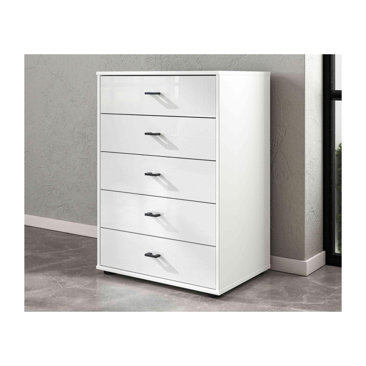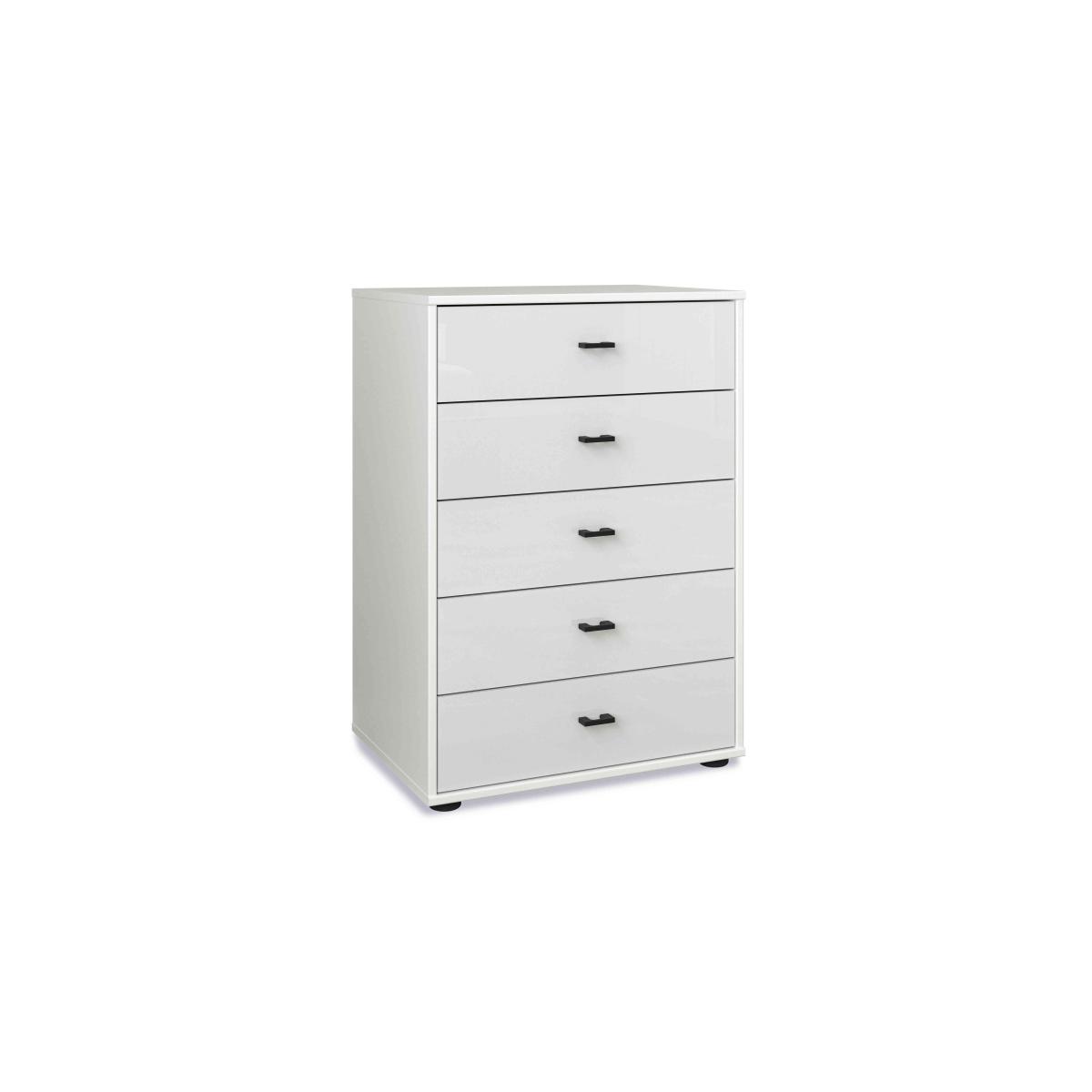 Designed and made for us by Wiemann, our Dallas range of bedroom furniture offers a dazzling array of stylish options for bedrooms large and small. Sliding door and hinged door wardrobes come in all sizes and in a choice of wood-effect and glass colours, and many also have useful full-height mirrored doors. Complete the look with matching chests of drawers and bedside cabinets. The German-made craftsmanship is exceptional and includes high-end touches like soft-close doors and drawers and a wide range of extra wardrobe fittings. Superb storage, on-trend style and incredible value – that’s the Wiemann Dallas range. Complete your bedroom with this glass-fronted chest of drawers and enjoy roomy clothes storage and an altogether on-trend modern look. Why you'll love it With its sleek glass drawer fronts, this 5-drawer glass chest is so stylish. Contemporary style that’s so well-designed. High-quality German craftsmanship at an exceptional price. Bright white finish with striking white glass drawer fronts. Soft-close drawers with slate-coloured handles. Assembled in your home free of charge. Made by Wiemann exclusively for Furniture Village. This 60 cm 5-drawer glass chest is part of our Wiemann Dallas range. What you need to know This finish may show surface scratches under certain lighting. Do not place in direct sunlight. Do not use abrasive cleaning products. Wipe clean with a damp cloth, and dry with a soft duster. We recommend using coasters and placemats at all times. This range includes a huge choice of hinged and sliding wardrobes, and chests of drawers. WARNING!