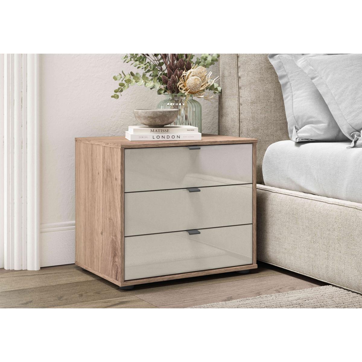 Elegant and contemporary, the Wiemann Hong Kong bedroom furniture collection brings home sophisticated style as well as spacious storage. Hinged-door wardrobes and chest of drawers have beautiful glass doors and drawers in a choice of colours, a beautiful finish that's accentuated by the slim Nordic oak-effect frames. Pieces are generously proportioned and offer well-designed storage capabilities. Wardrobes come equipped with shelves and hanging rails and additional internal fittings – drawer units, mirrors, LED lighting and more – can be added. The Hong Kong range is crafted in Germany by the furniture excerpts at Wiemann. Showcasing a contemporary high-end look, this glass-fronted bedside cabinet with three drawers is a practical piece that’s also effortlessly stylish. Why you'll love it Elegant and contemporary bedroom furniture from Wiemann. This 3-drawer bedside chest has beautiful glass drawers. Choice of sophisticated colours. Stunning design with contrasting slimline Nordic oak-effect frame. Pinstripe-effect interior for a premium look. Drawers are soft closing. Expertly crafted in Germany. This 3-drawer bedside cabinet is part of the Wiemann Hong Kong range. What you need to know Arrives assembled. Dust with a lint-free cloth. Do not use silicone based furniture polishes.