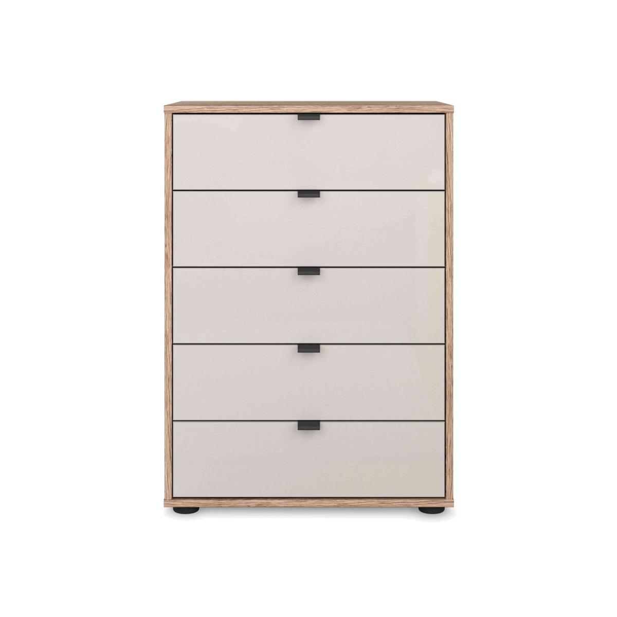 Elegant and contemporary, the Wiemann Hong Kong bedroom furniture collection brings home sophisticated style as well as spacious storage. Hinged-door wardrobes and chest of drawers have beautiful glass doors and drawers in a choice of colours, a beautiful finish that's accentuated by the slim Nordic oak-effect frames. Pieces are generously proportioned and offer well-designed storage capabilities. Wardrobes come equipped with shelves and hanging rails and additional internal fittings – drawer units, mirrors, LED lighting and more – can be added. The Hong Kong range is crafted in Germany by the furniture excerpts at Wiemann. Elegantly narrow and ideal for a smaller bedroom, this beautiful glass-fronted chest of drawers has a slender oak-effect frame and plenty of contemporary style. Why you'll love it Elegant and contemporary bedroom furniture from Wiemann. This 5-drawer chest of drawers has beautiful glass drawers. Choice of sophisticated colours. Stunning design with contrasting slimline Nordic oak-effect frame. Pinstripe-effect interior for a premium look. Drawers are soft closing. Expertly crafted in Germany. This 5-drawer chest of drawers is part of the Wiemann Hong Kong range. What you need to know Arrives assembled. Dust with a lint-free cloth. Do not use silicone based furniture polishes. WARNING!