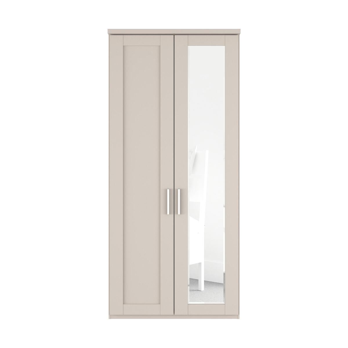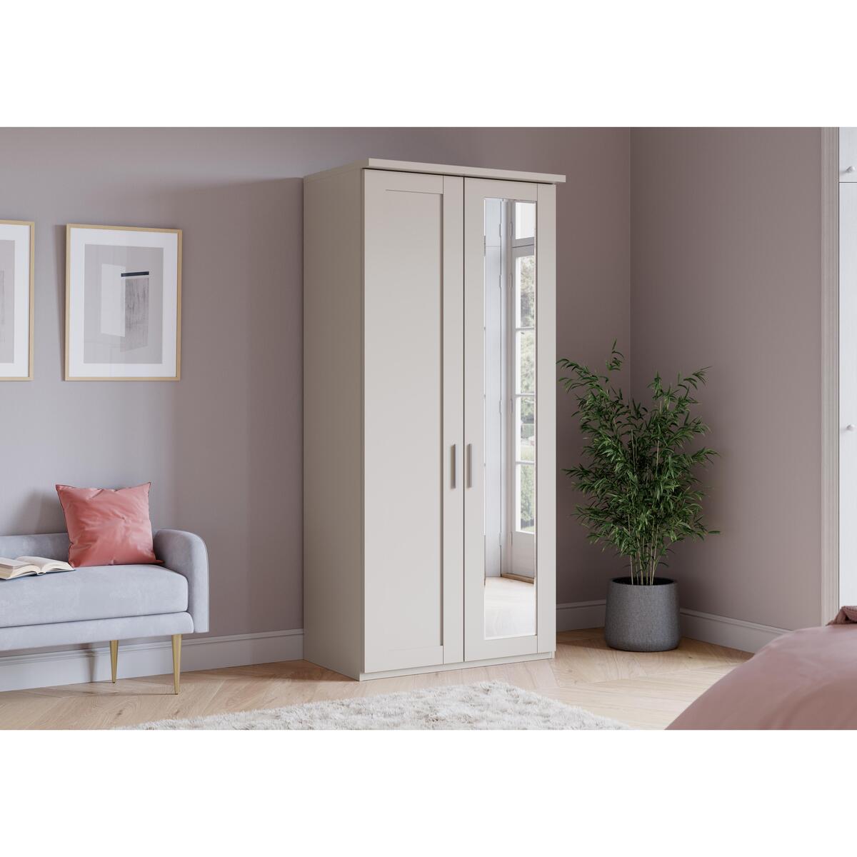 Transform your bedroom with the stylish contemporary Wiemann Kempton bedroom furniture collection. Designed to look like fitted furniture, the range’s semi-fitted wardrobes have clean angular lines, Shaker-style door panelling and simple corniced tops, and are available with mirrored doors. The coordinating chests of drawers, minimalist in style, have roomy drawers and, like the wardrobes, matt silver metallic handles. Choose white or Furniture Village-exclusive champagne. The range includes a wide choice of wardrobes from two-door to five door and both narrow and wide chests of drawers. It’s a very practical choice whatever the size and shape of your bedroom. Designed and built in Germany by Wiemann. The perfect small-space wardrobe, this semi-fitted wardrobe looks like sleek fitted furniture, and its simple contemporary lines complement any style of decor. Outstanding quality and value plus free in-home assembly. Why you’ll love it. Semi-fitted wardrobe functionality, sleek fitted furniture appearance. A contemporary interpretation of Shaker style. Full-height mirrored right-hand door. Assembled in your home free of charge. Choose white or Furniture Village-exclusive champagne. Additional shelves, hanging rails and internal fittings are available. Upgrade to soft-close doors and LED lighting. Exceptional quality and outstanding value for money. Made to order in Germany by Wiemann. What you need to know. Metal door handles have a matt silver finish. There are two shelves and a hanging rail in each internal compartment. Shelves and hanging rails are height adjustable. The Wiemann Kempton range includes a huge choice of wardrobe sizes. Complete the look with a Wiemann Kempton chest of drawers. WARNING!. Furniture can tip over unexpectedly and cause injury. This item shall be fixed to a wall using the anti-tip kit provided with the furniture. Be sure to use the correct wall fixings suitable for the walls in your home.