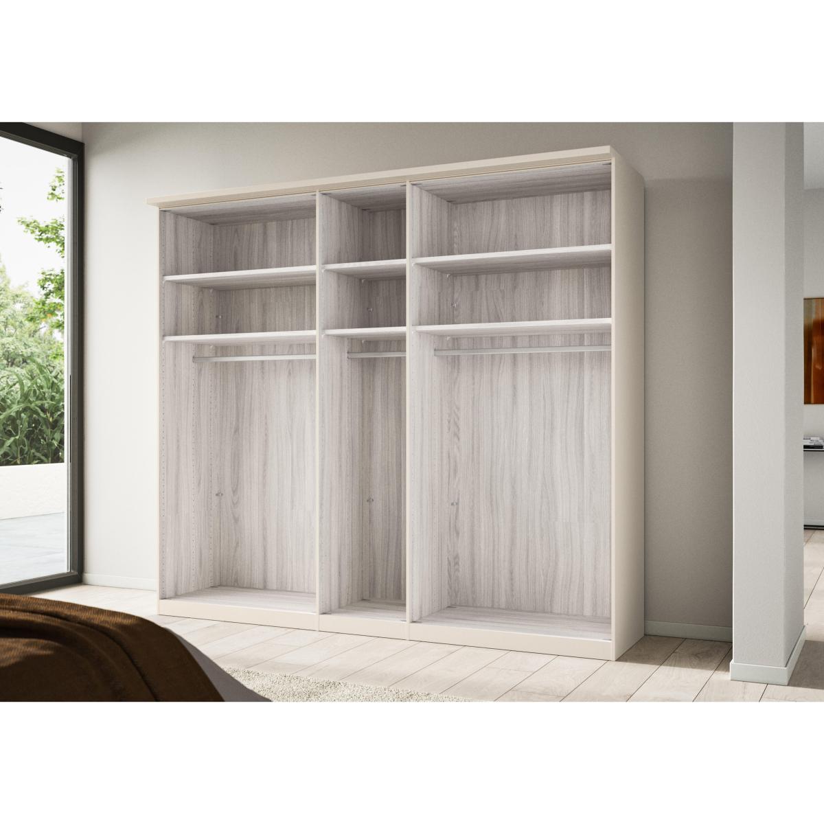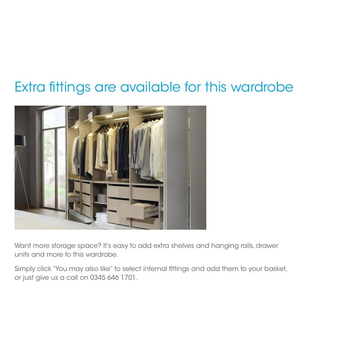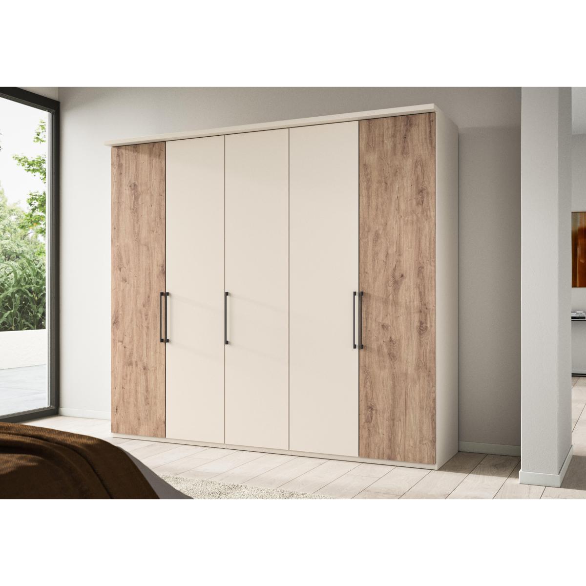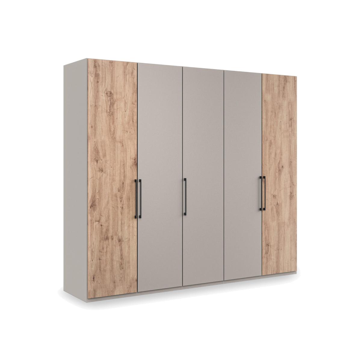 Bring modern sophistication and gently rustic style to your bedroom with the beautifully crafted Wiemann Tullio range of bedroom furniture. Hinged door wardrobes and sliding door wardrobes are available in a choice of colours and feature slate-toned door handles, Nordic oak-effect accents, mirror doors and, of course, well-designed and versatile storage with shelves and hanging rails. You can even customise your wardrobe with extra fittings like a drawer unit, extra shelves and rails, lighting and more. Matching chests of drawers make it easy to complete a bedroom décor scheme that’s warm, inviting and fashionable. The Wiemann Tullio range is sustainably made in Germany. Modern elegance meets rustic warmth in this five-door hinged wardrobe. Showcasing Wiemann’s signature high-quality craftsmanship and well-designed storage, it comes in a choice of colours. Why you'll love it Bring elevated rustic style to your bedroom with this 5-door hinged wardrobe. In a choice of colours for the frame and 3 middle doors. Left-hand and right-hand doors have a contrasting Nordic oak-effect finish. Soft-close doors with slate handles. Roomy and flexible storage space with 2 shelves and a hanging rail in each compartment. Extra fittings – including shelves, rails, drawer units and more – can be purchased separately. You can also customise this hinged wardrobe with a decorative cornice and LED lighting. Sustainably made in Germany. This 250 cm 5-door hinged wardrobe is part of the Wiemann Tullio range. What you need to know Delivered, assembled and installed for you free of charge. Standard internal storage comprises 2 adjustable shelves and 1 adjustable hanging rail per compartment. Compatible interior and exterior fittings are available for this wardrobe at an additional cost. Dust with a lint-free cloth. Do not use silicone-based furniture polishes. Complete your sophisticated bedroom look with chests of drawers from the Wiemann Tullio range. WARNING! Item code: TULL6405NOPG-001