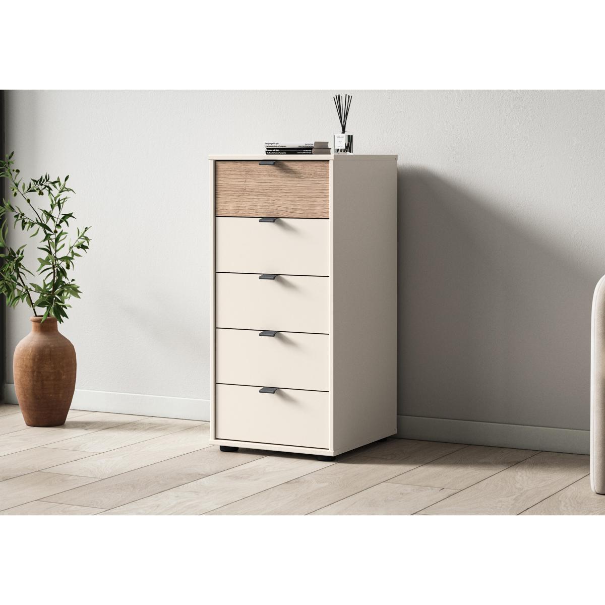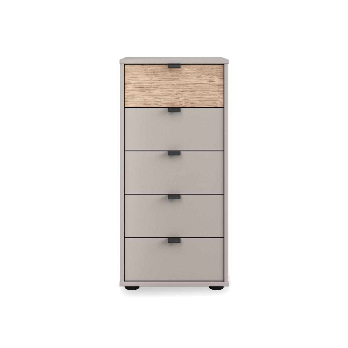 Bring modern sophistication and gently rustic style to your bedroom with the beautifully crafted Wiemann Tullio range of bedroom furniture. Hinged door wardrobes and sliding door wardrobes are available in a choice of colours and feature slate-toned door handles, Nordic oak-effect accents, mirror doors and, of course, well-designed and versatile storage with shelves and hanging rails. You can even customise your wardrobe with extra fittings like a drawer unit, extra shelves and rails, lighting and more. Matching chests of drawers make it easy to complete a bedroom décor scheme that’s warm, inviting and fashionable. The Wiemann Tullio range is sustainably made in Germany. Showcasing Wiemann’s signature high-quality craftsmanship and well-designed storage, this five-drawer chest of drawers comes in a choice of colours with an optional Nordic oak-effect drawer front. Why you'll love it Bring elevated style to your bedroom with this 5-drawer chest. Smaller footprint means spacious storage that takes up less room. In a choice of colours. Optional Nordic oak-effect finish for the top drawer. Soft-close drawers with slate handles. Sustainably made in Germany. This narrow 5-drawer chest is part of the Wiemann Tullio range. What you need to know Delivered, assembled and installed for you free of charge. Dust with a lint-free cloth. Do not use silicone-based furniture polishes. Complete your sophisticated bedroom look with wardrobes from the Wiemann Tullio range. WARNING! Item code: TULL5D08PGNO-001