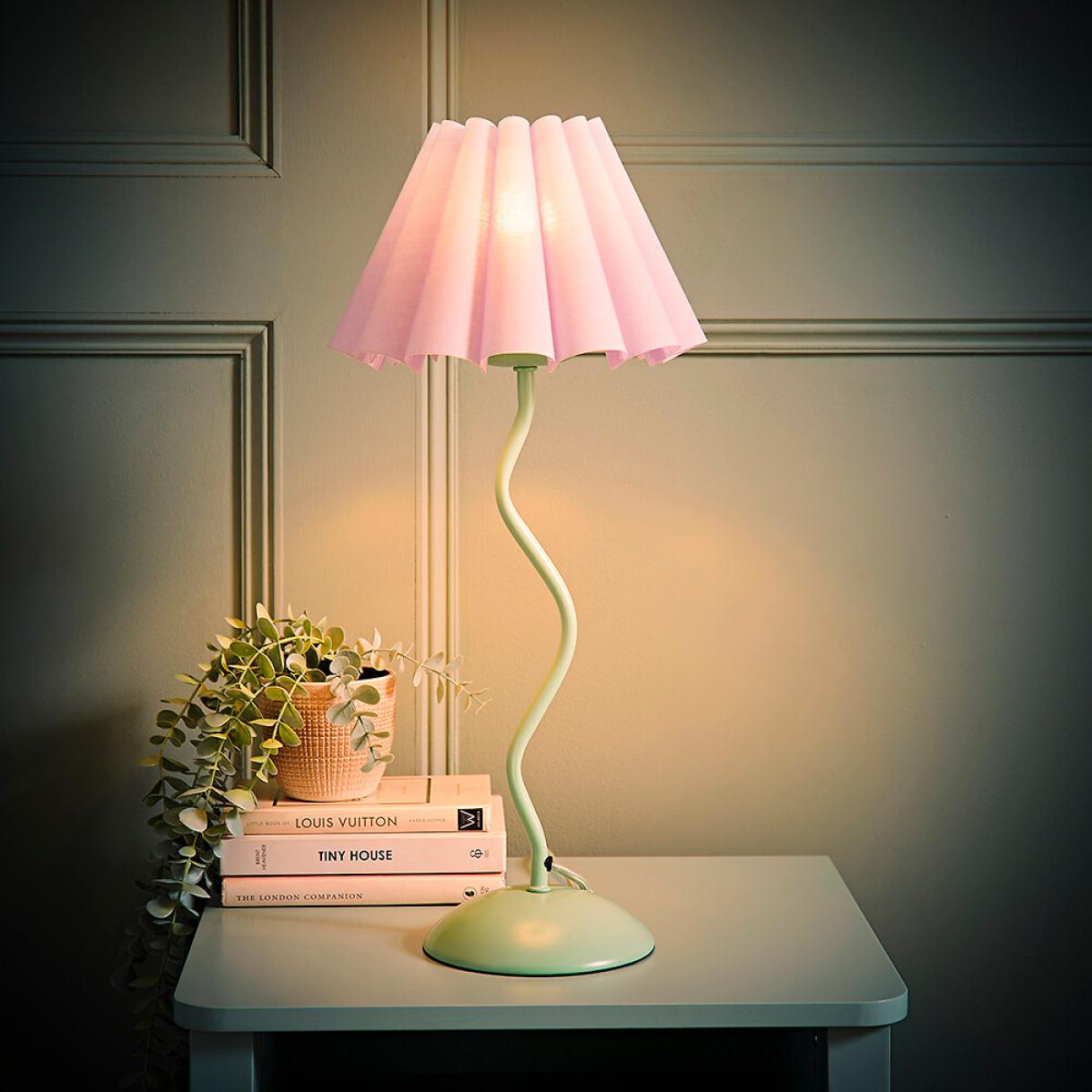 I love this lamp for its playful yet sophisticated design, especially with the wiggly metal base that adds a touch of whimsy. It works really well in eclectic or modern interiors where statement pieces are key, but it can also bring a fresh touch to more pared-back, minimal spaces. The pleated scallop shade offers a soft, diffused light, making it ideal for cosy corners or bedside tables. For styling, consider pairing it with simple, contrasting surfaces to let its quirky shape stand out, or use it to add a dash of colour and texture to a neutral scheme. It's a versatile piece that adds personality without overwhelming the space.