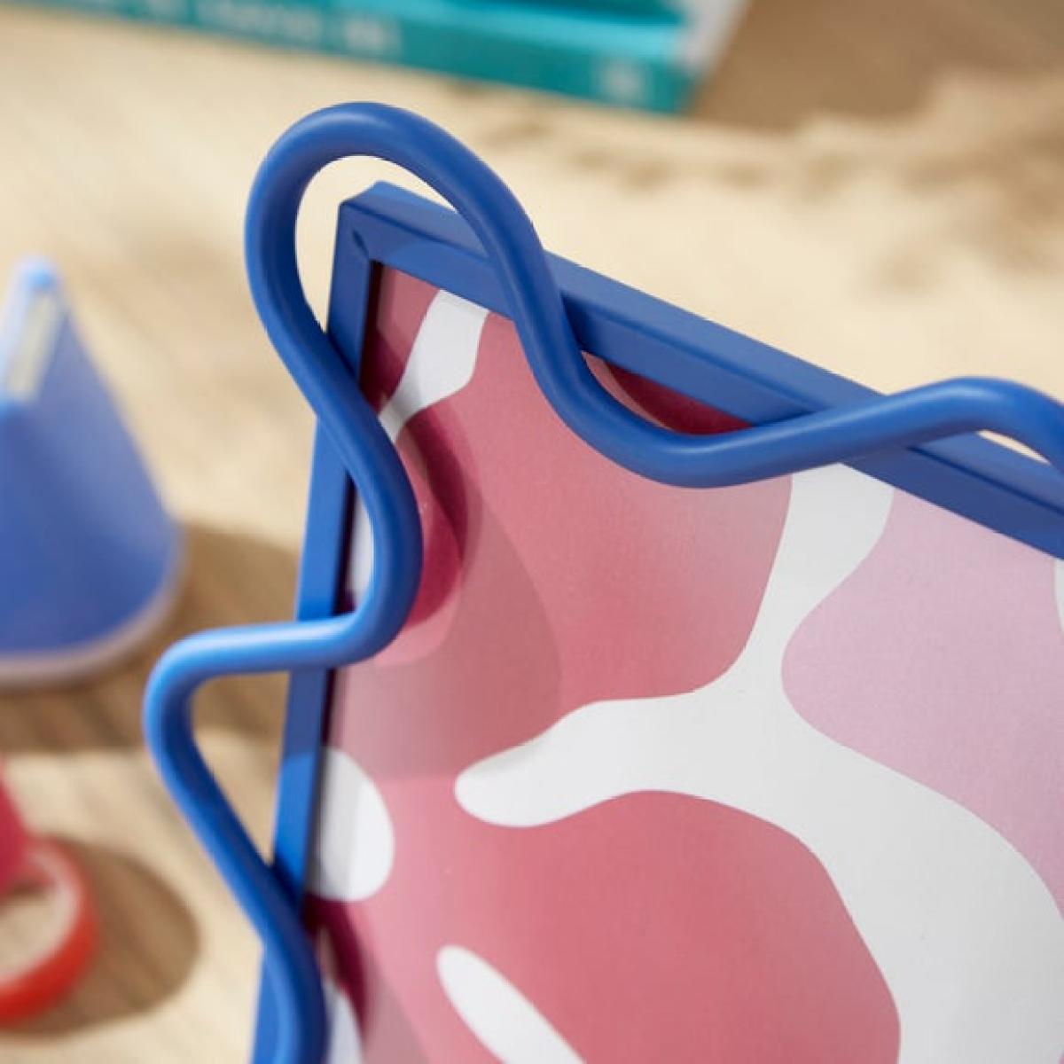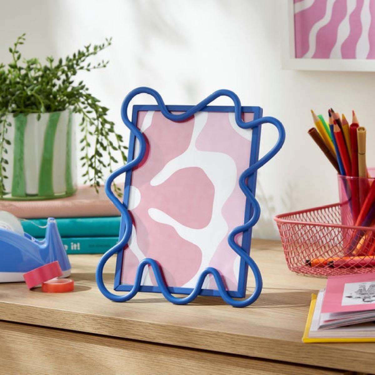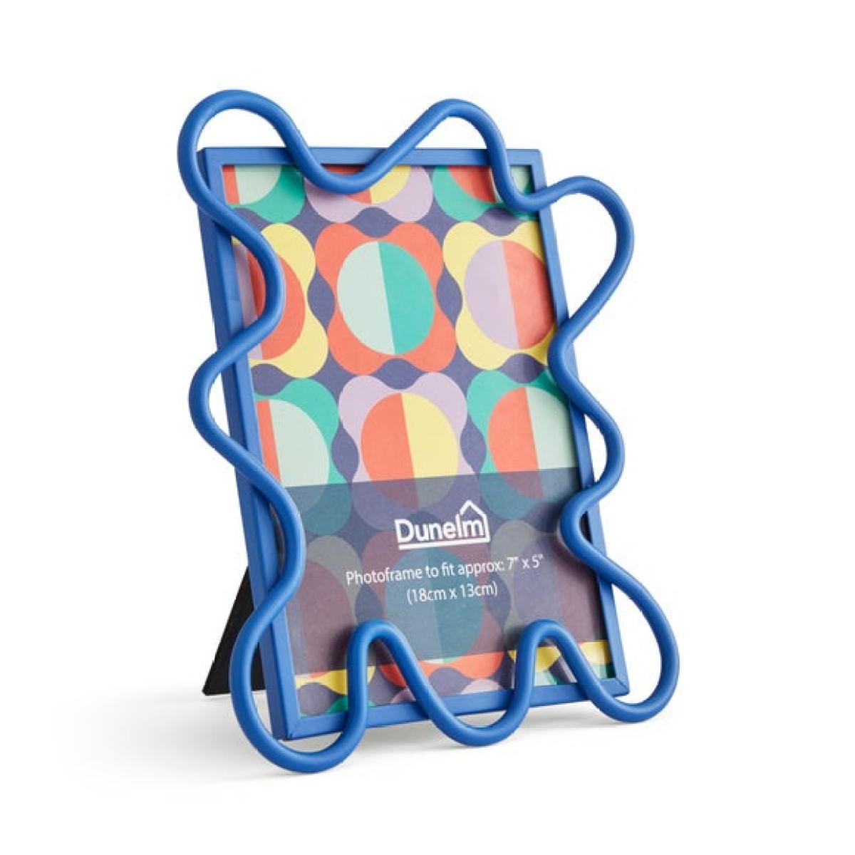 * Wire wiggle design * Choice of colours * 7" x 5" frame * Freestanding This photo frame is a great way to introduce a pop of colour whilst displaying your favourite photos. Designed to be freestanding, it's suitable for 7" x 5" photos - the perfect size for desks, shelves or side tables. Choose from classic blue or warm sand colours to suit your decor.
