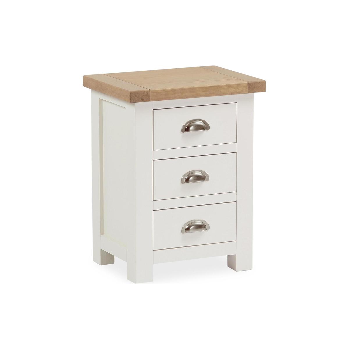 Boasting three drawers with cupped metal handles, this fully assembled bedside table offers a cream painted finish and light oak veneer top.
