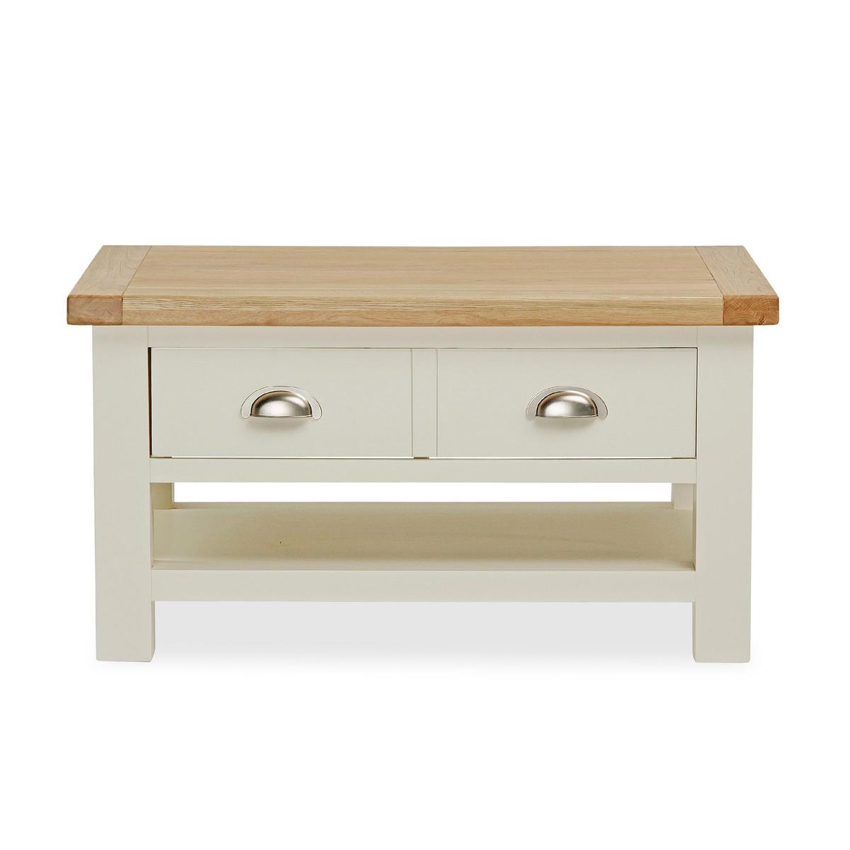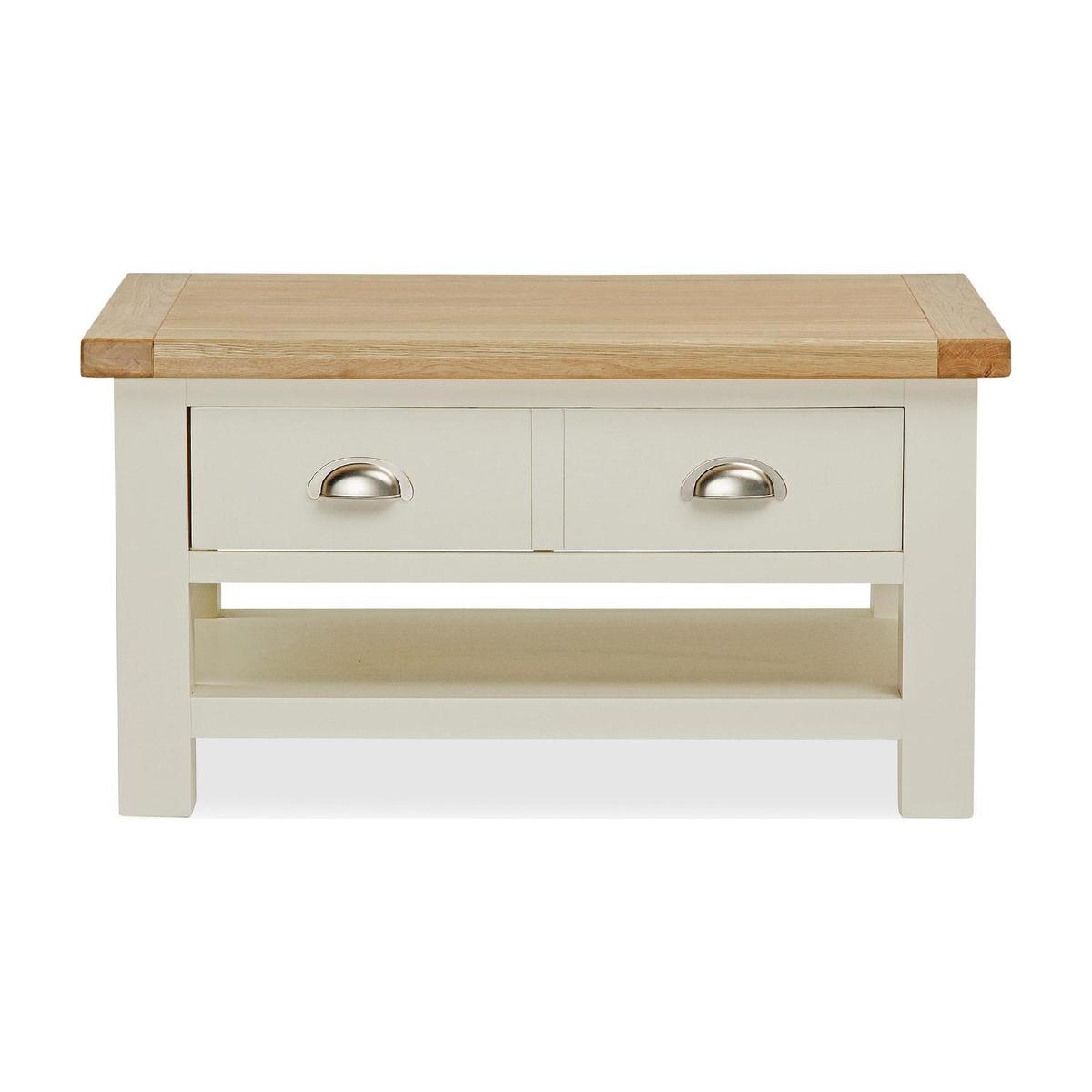 Designed with one and two drawers with silver satin finished handles, this fully assembled coffee table features an oiled oak veneer top with a cream painted finish.