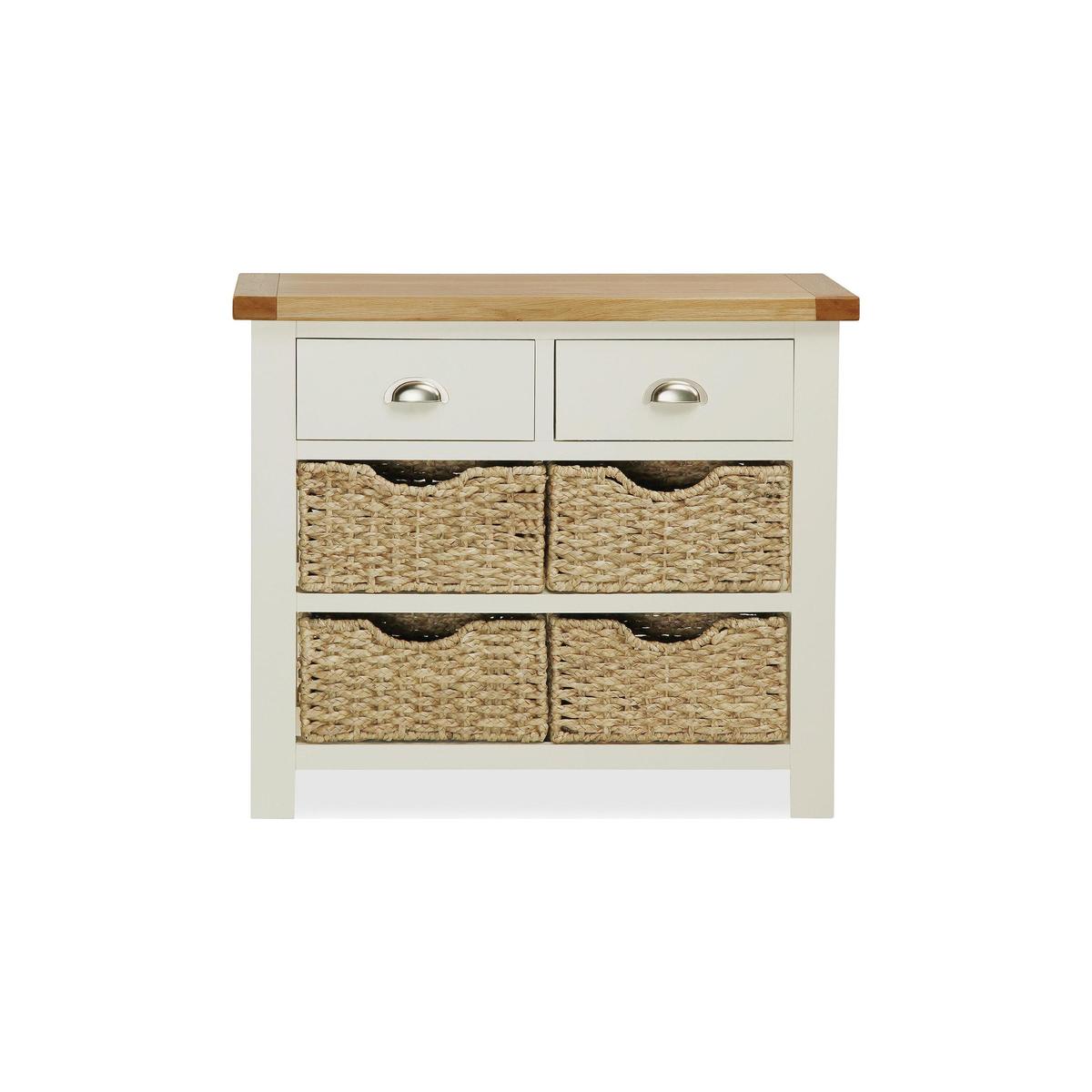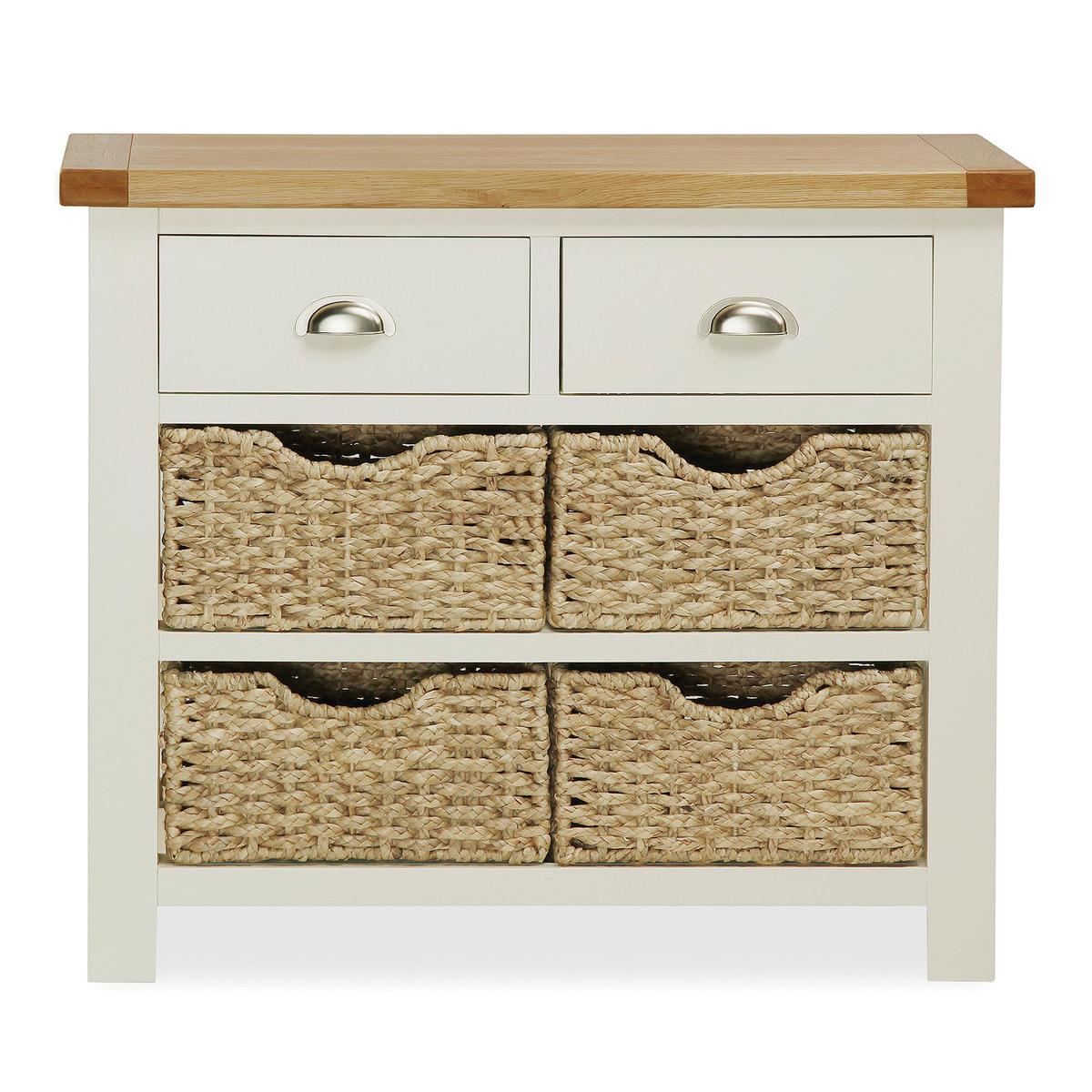 Boasting four woven water hyacinth baskets and two drawers with silver satin finished handles, this fully assembled console table is crafted with an oiled oak veneer top and a cream painted body.