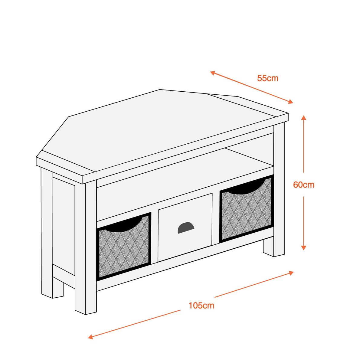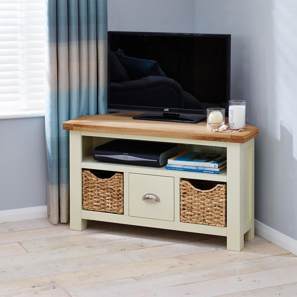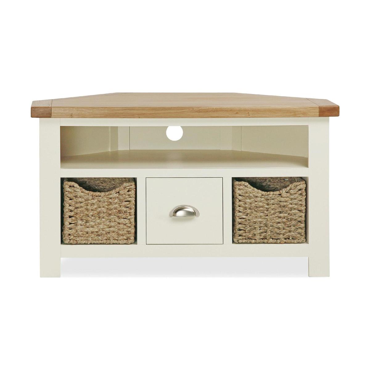 Crafted with an oiled oak top and cream painted finish, this fully assembled corner TV stand features one shelf, two woven water hyacinth baskets and one drawer with a cupped metal handle.