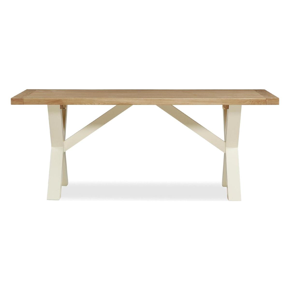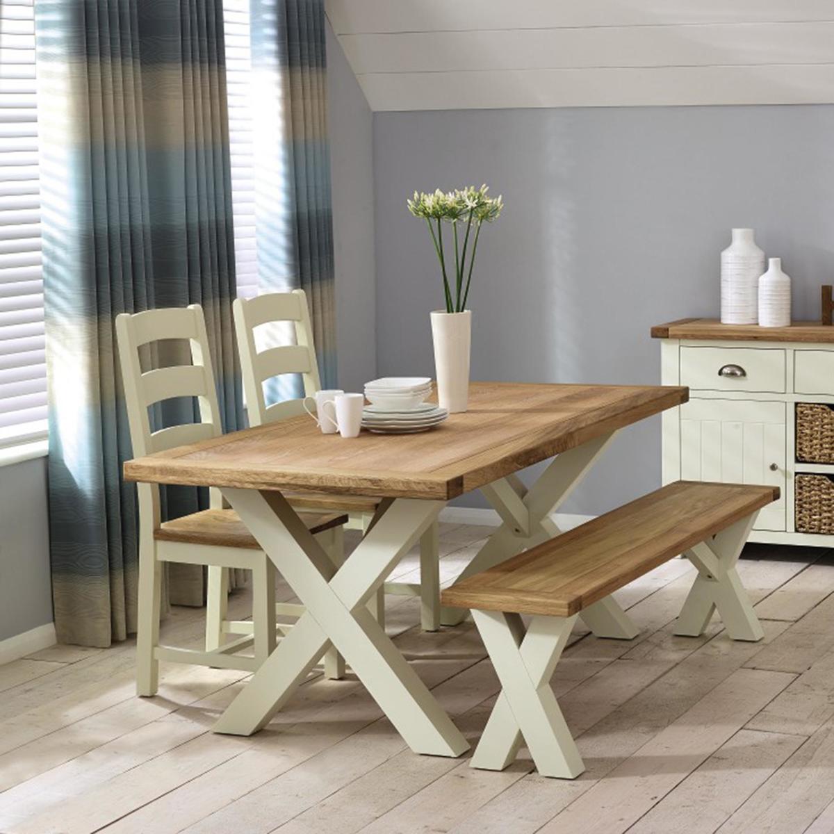 Constructed with an oiled oak veneer top and a cream painted finish, this dining table features a cross leg design and is easy to assemble.