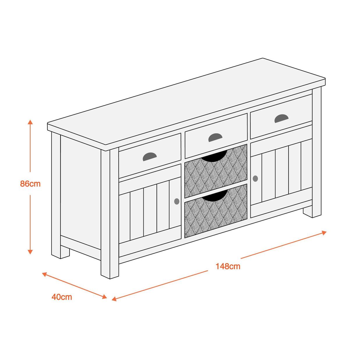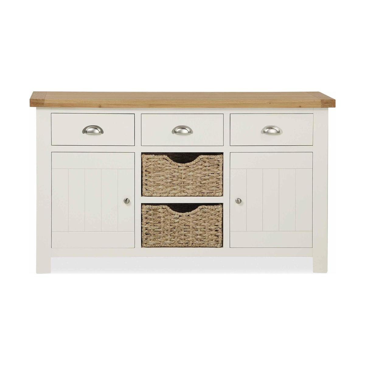 Boasting generous storage space with two cupboards, three drawers and two woven water hyacinth baskets, this fully assembled sideboard features an oiled oak veneer top, silver satin finished handles and a cream painted finish.