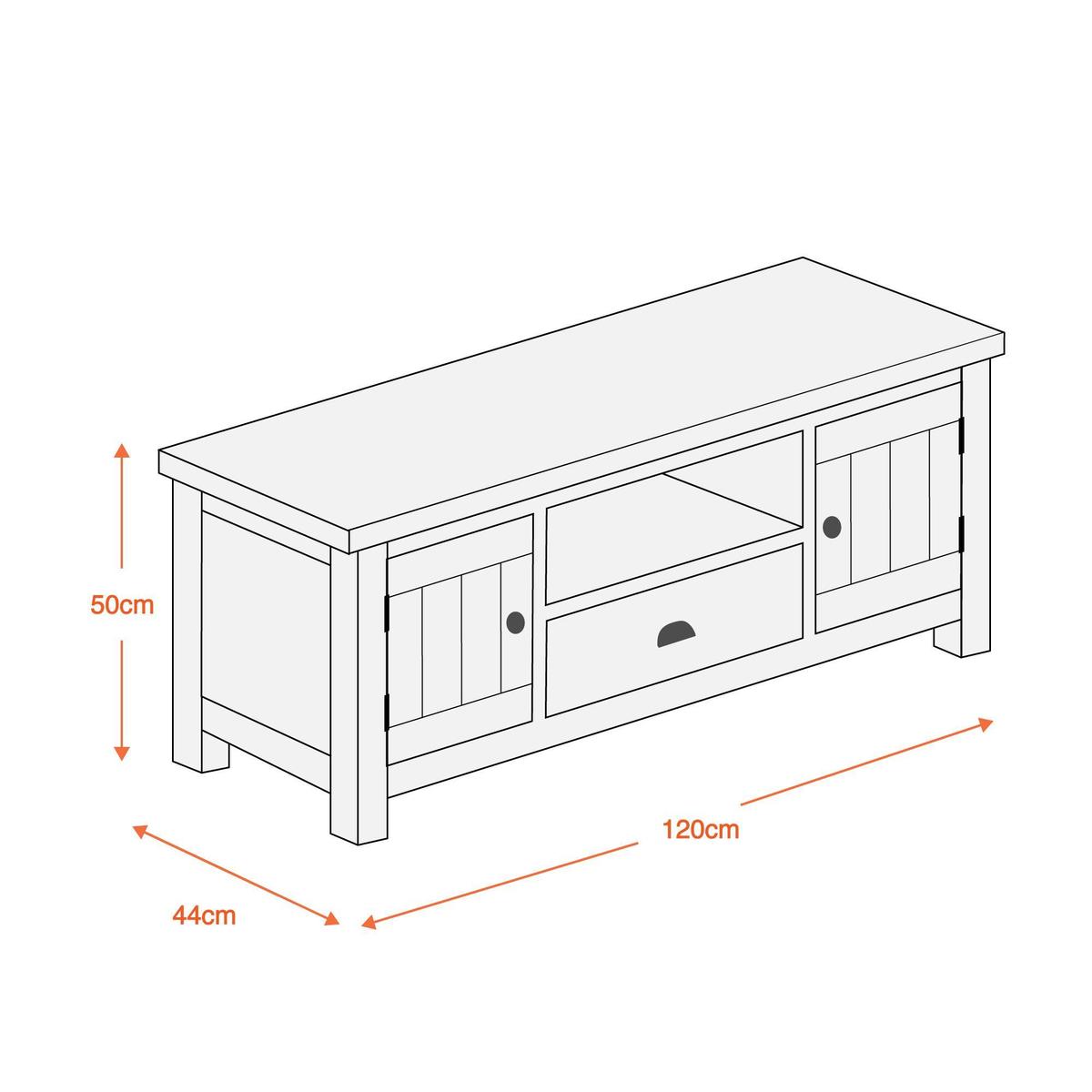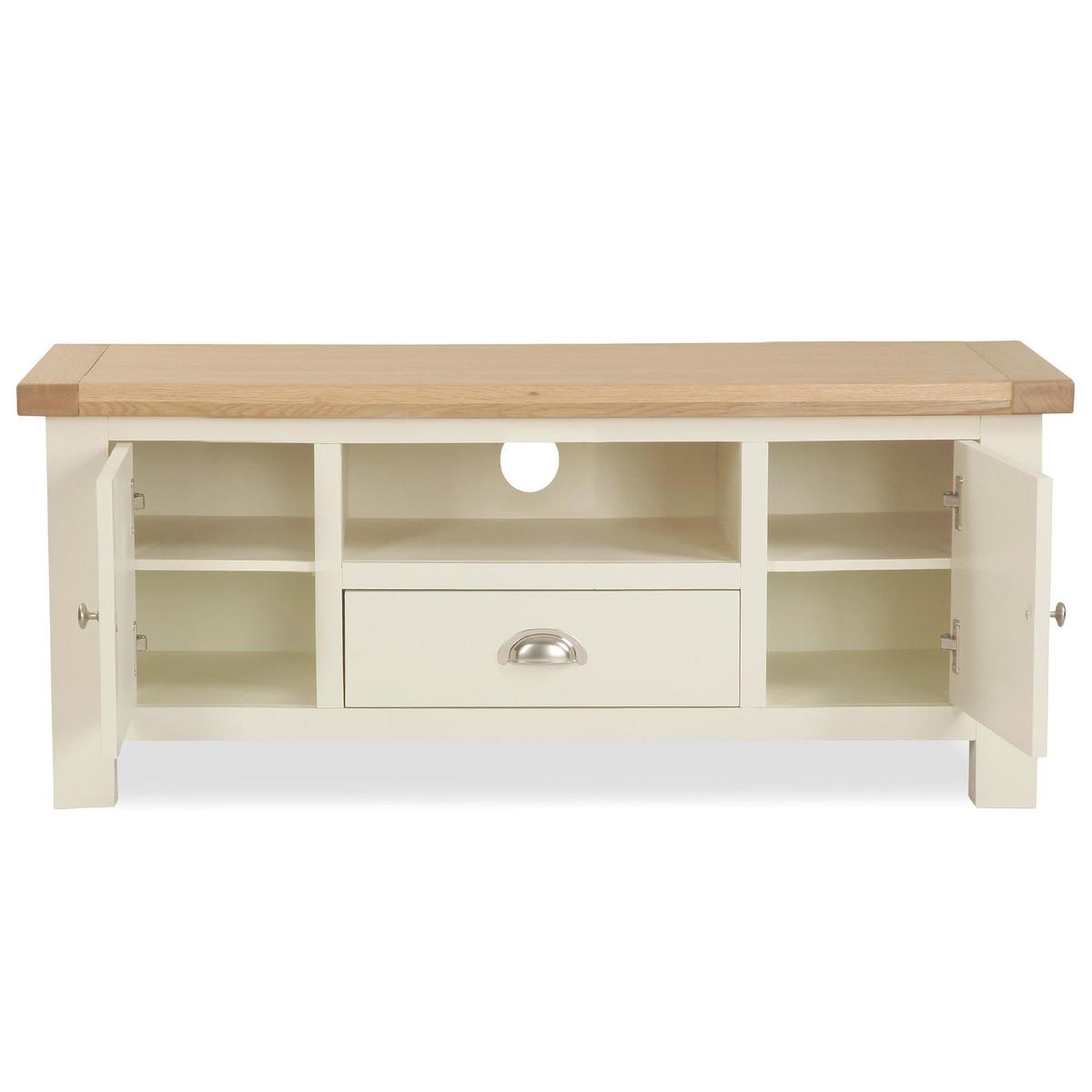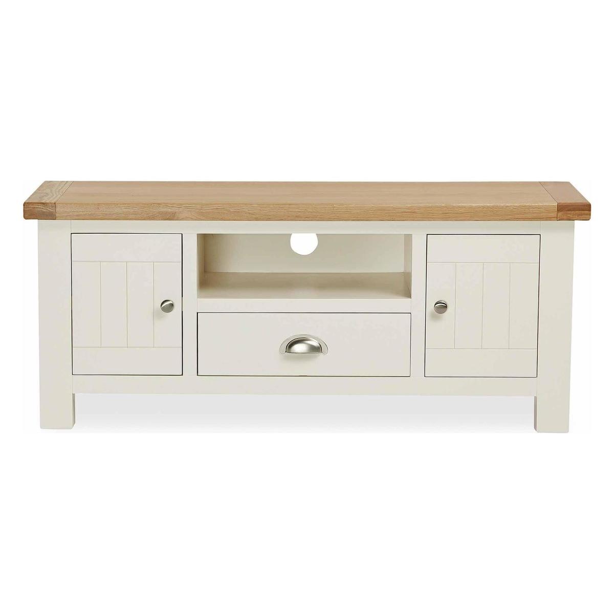 Offering two cupboards, one shelf and one drawer with silver satin finished handles, this fully assembled TV stand boasts an oiled oak veneer top and a cream painted finish.