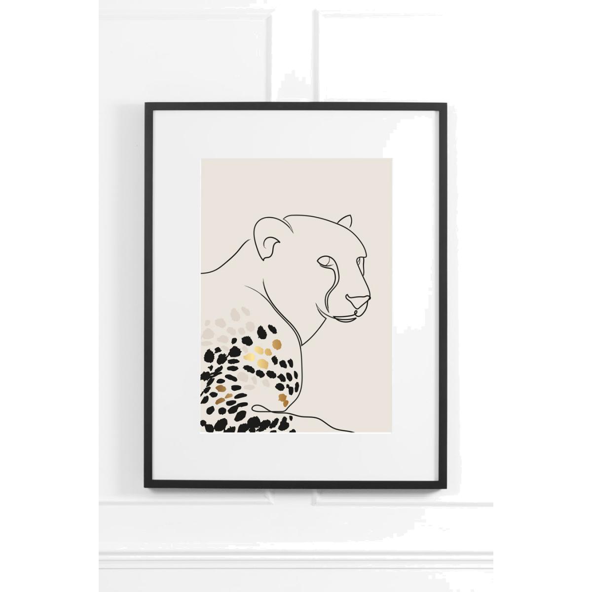 Soft line drawings mixed with bold animal prints hand finished with gold metallic ink. 250gsm paper with a satin finish complete with an elegant matte black wooden frame.