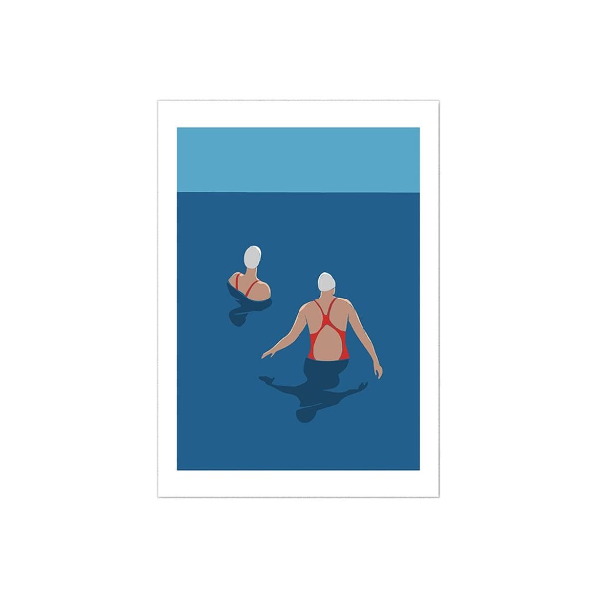 Summer is a state of mind and you can bring it into your home all year round with this classic print of two swimmers braving the sea. The blue tones with the touch of red popping up from the blue will add holiday vibes, whatever the season. Only giclée printing processes are used for this print resulting in the highest quality museum-level colours and sharpness. Choose between a number of different coloured frames and two sizes for the perfect print for your space.