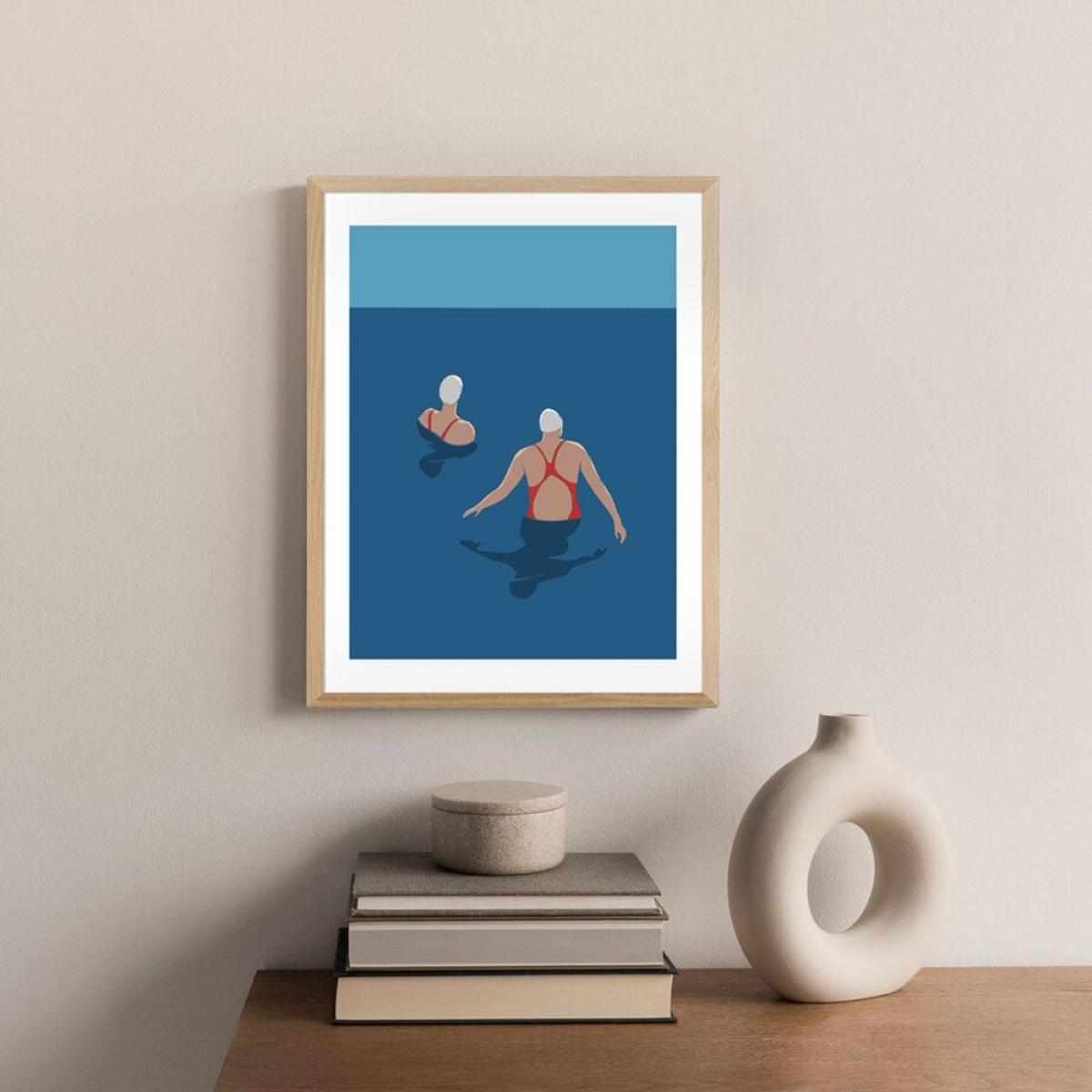 Summer is a state of mind and you can bring it into your home all year round with this classic print of two swimmers braving the sea. The blue tones with the touch of red popping up from the blue will add holiday vibes, whatever the season. Only giclée printing processes are used for this print resulting in the highest quality museum-level colours and sharpness. Choose between a number of different coloured frames and two sizes for the perfect print for your space.