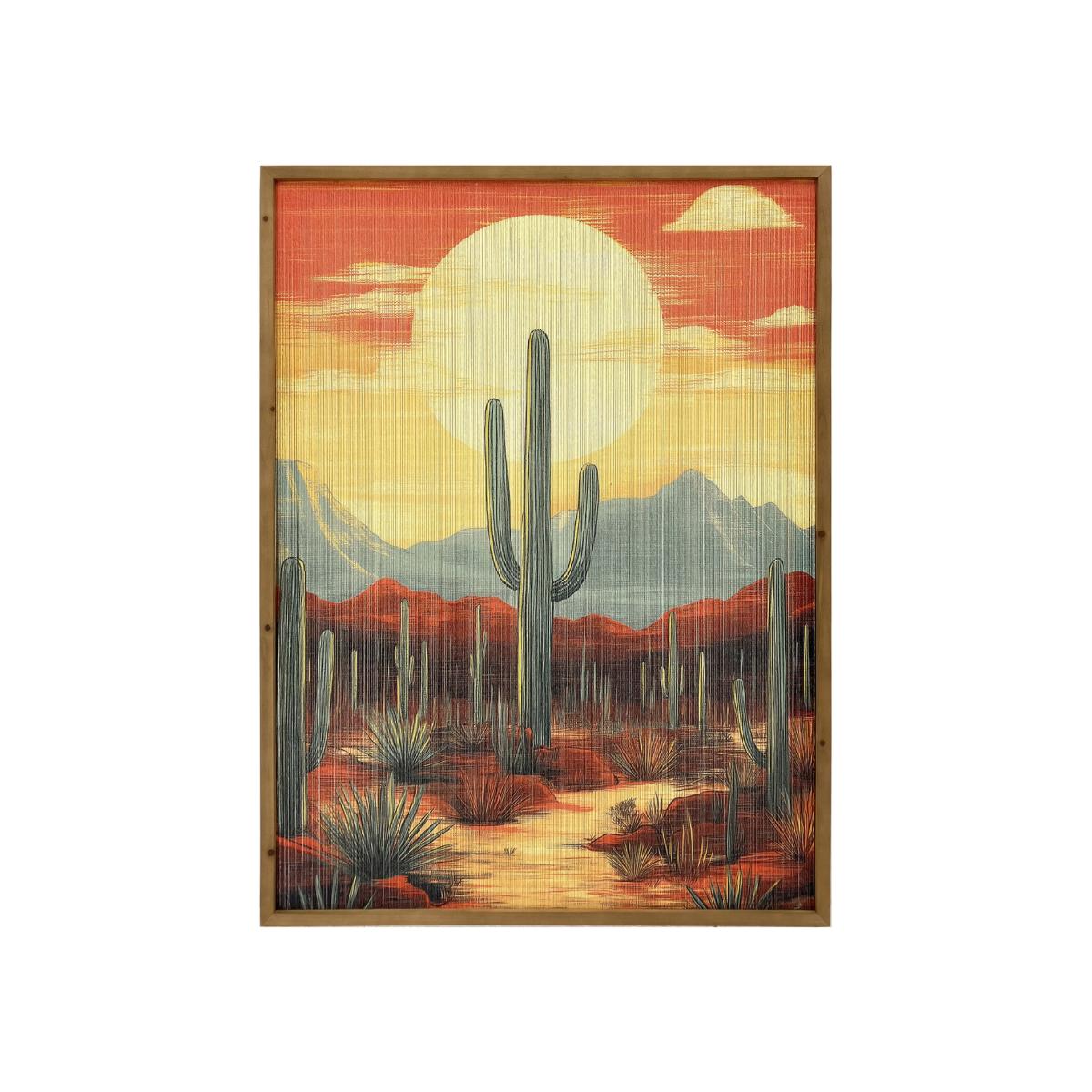 Add rustic charm to your walls with this beautifully textured Wild West Sunset Woven Wall Art. Featuring a scenic blend of cacti, mountains, and a glowing sunset, this piece brings warmth and desert vibes to any space. Ready to hang with the built-in hooks, it makes a fantastic addition to living rooms and bedrooms.