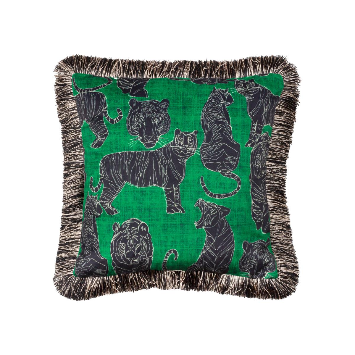 Take a walk on the wild side with this amazingly designed cushion, which blends natural textures and bold graphics to create a unique tribal jungle design. Featuring artistic monochrome depictions of jungle wildcats, who pose against a rich, jewel-toned green background, and are printed on a soft velvet face. Finished with a luxurious mixed yarn fringe for extra gravitas, this cushion is a statement piece in its own right!