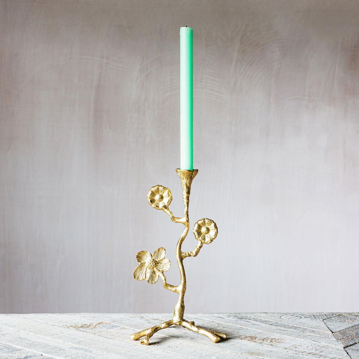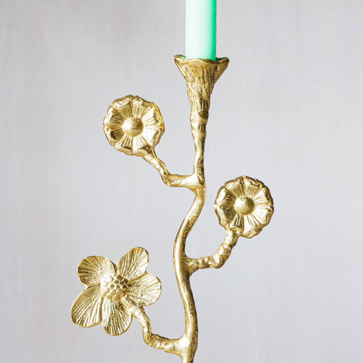 Blooming in bright gold, create a whimsical dinner table setting with this golden candlestick.