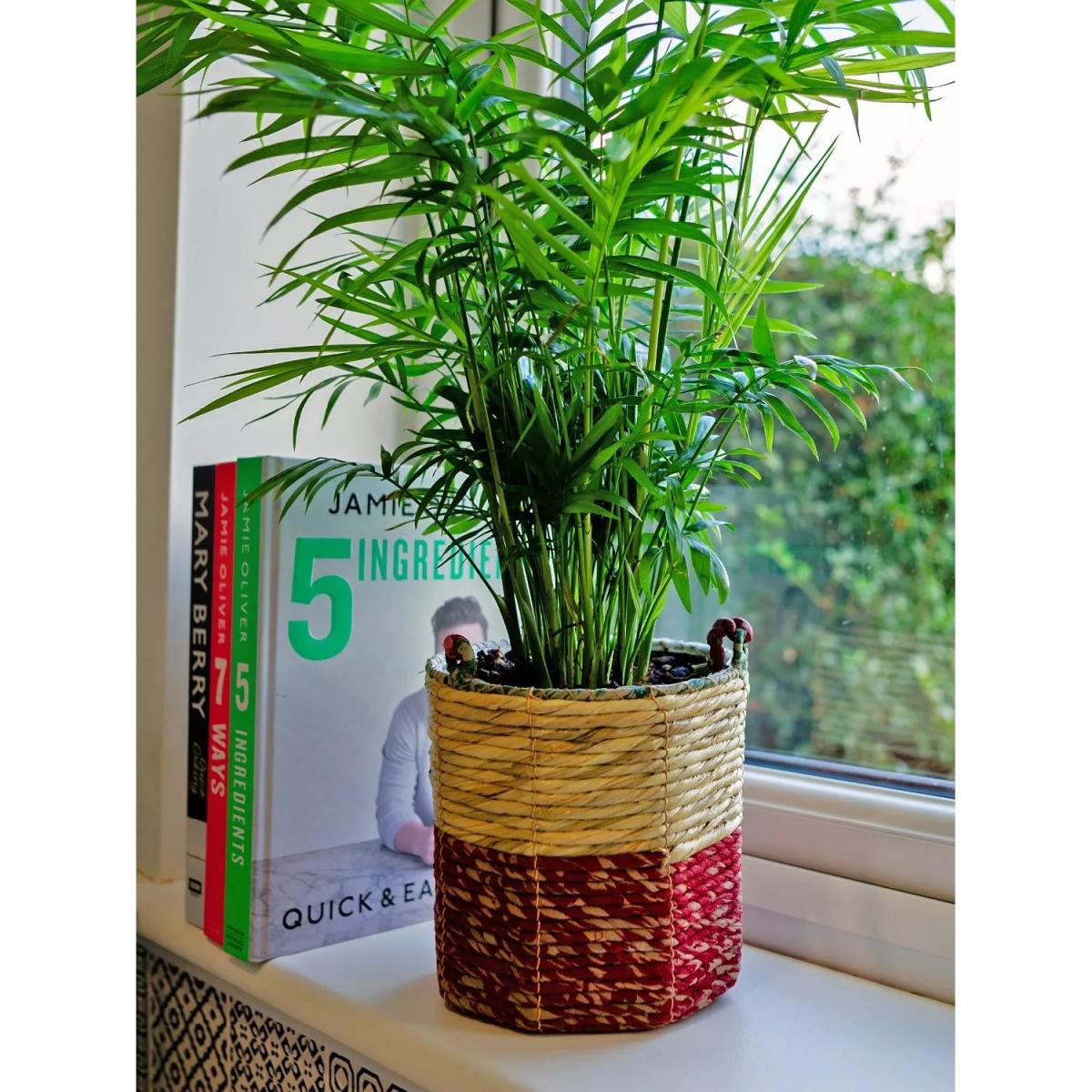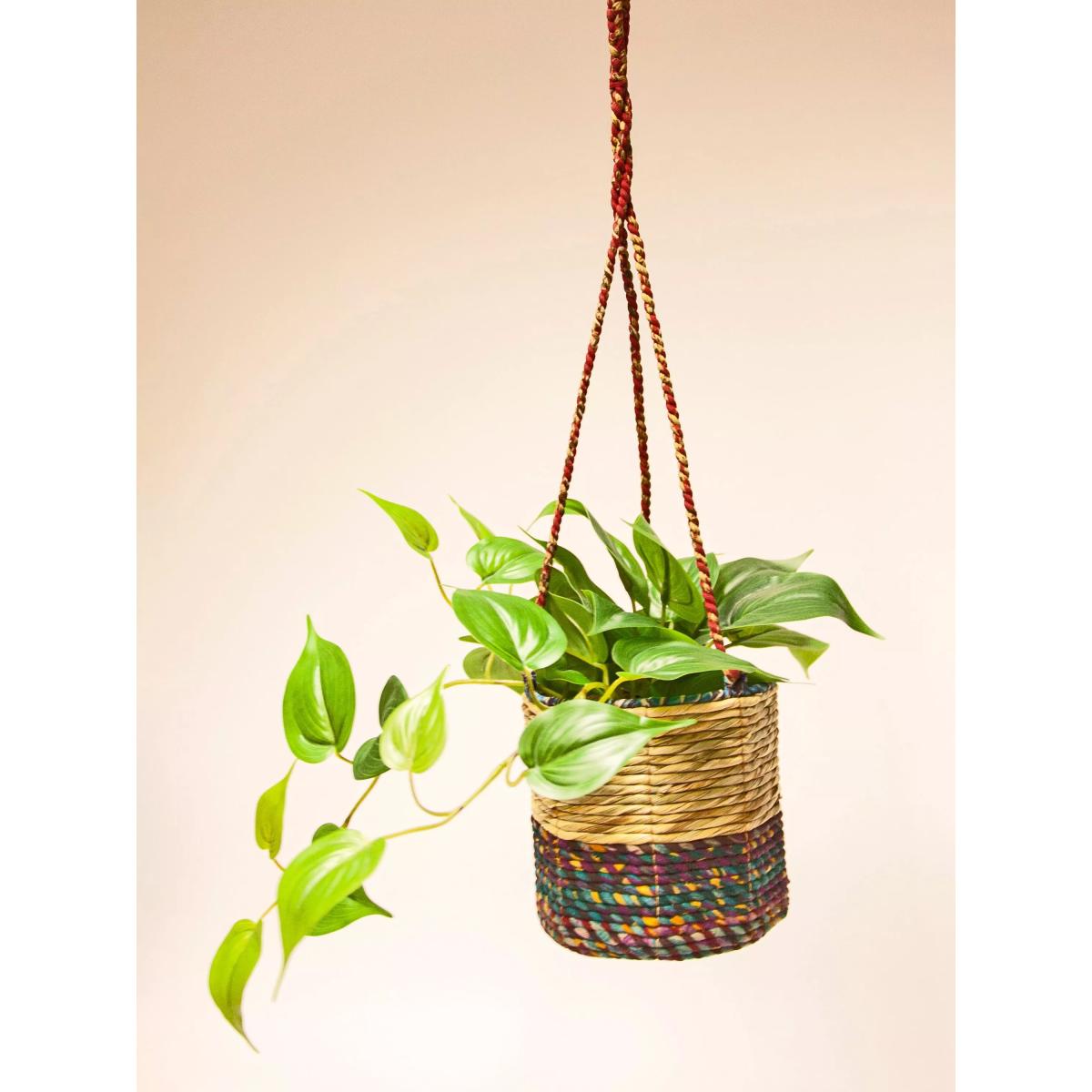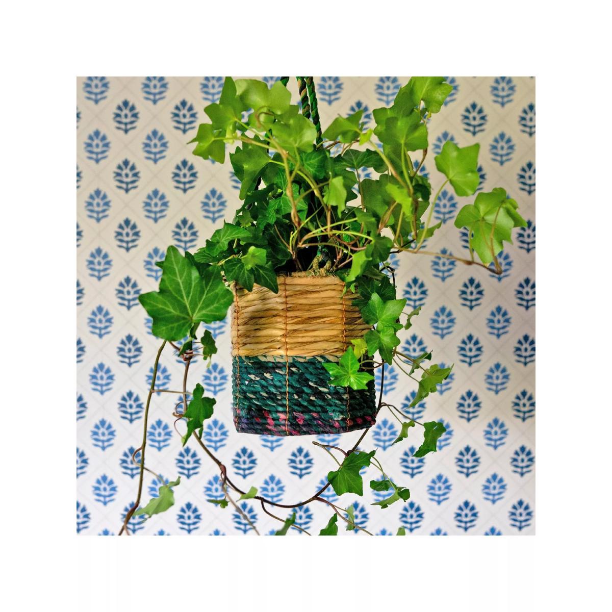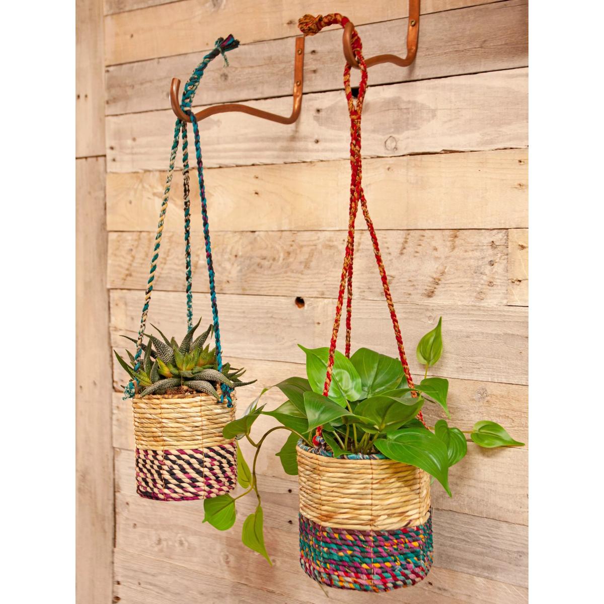 A pair of Fairtrade Artisan Plant Baskets from Wildlife World. The two different sizes, small and medium, can be stacked into each other. Handmade from hogla grass and recycled saris, handwoven over a sturdy steel frame by skilled artisans from Bangladesh. The design with a recycled plastic insert and its tight weave ensures they're watertight so plants can be watered without worry or can be planted directly into the planter. The sari availability and preference of each artisan determines the colourway of each product, making every piece unique. These colourful planters can also be hung outside however the colours will fade slightly in the sun and the product will have a decreased life span if used outside. Purchasing Wildlife World's Fairtrade products supports the artisan workers in Southern Bangladesh who make them, helping to fund the survival of many women and their families from rural communities.