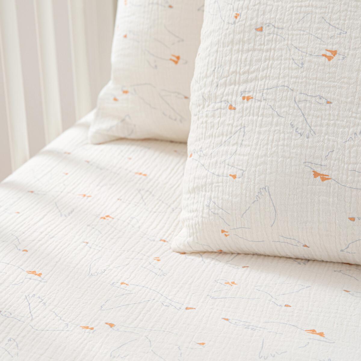 Cute little geese to help baby sleep soundly and dream sweet dreams. This fitted sheet in cotton muslin is designed by La Redoute Intérieurs. Cotton muslin is light, supple and super soft. Naturally textured, they do not require ironing and become more beautiful over time. Product Details • 100% cotton, 135g/m2 • Cotton muslin • Little geese print • For mattress height 17cm. As the seasons change, add your own personal touch by mixing the Wildoy range with our range of plain Scenario bed linen. Care Advice • Machine washable at 60°C • By washing your laundry at 40°C instead of 60°C, you limit energy consumption • Product will regain its texture after tumble drying • The cotton muslin may show slight marks due to packaging creases. We recommend that you wash the product as soon as you receive it, and then tumble dry it to restore its look and the beautiful waffle effect. Dimensions • 60 x 120cm: Cot bed • 70 x 140cm: Adjustable bed • OEKO-TEX® Standard 100. Standard 100 certification by OEKO-TEX® tests textile products for harmful substances via an independent, international label.