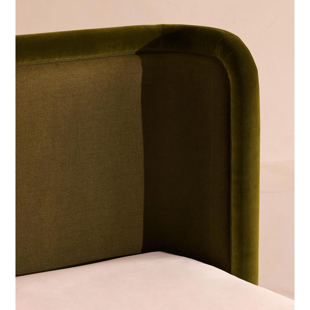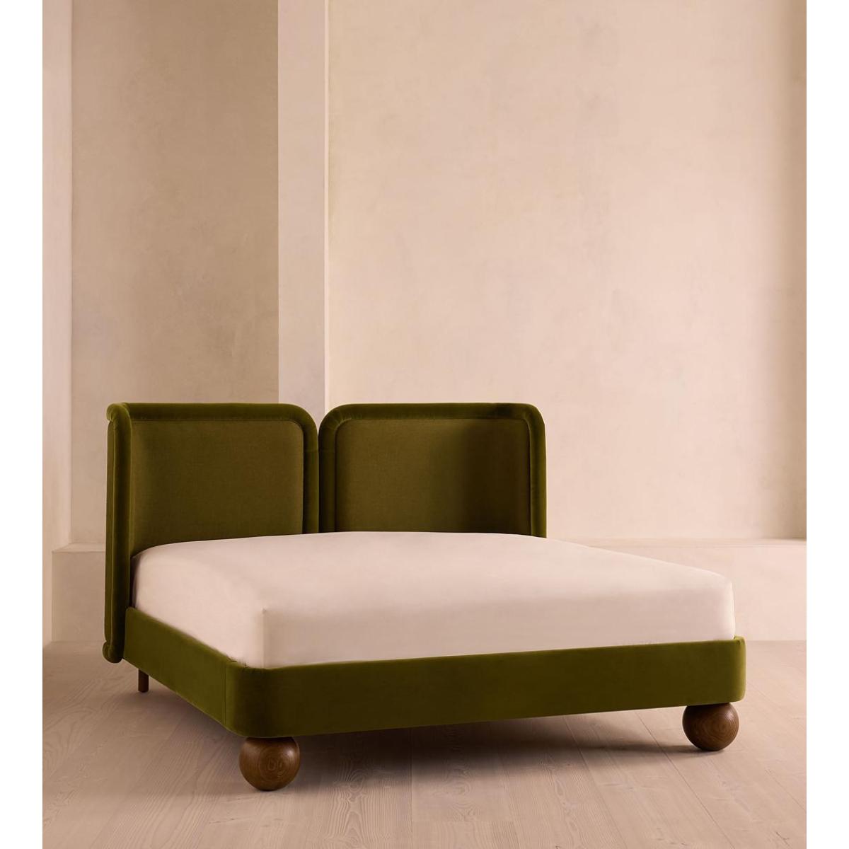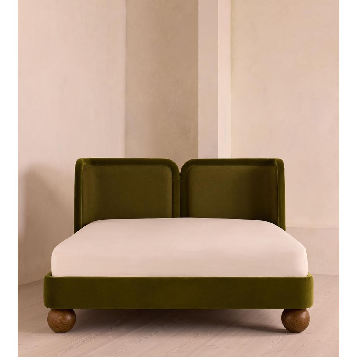 I love this bed for its versatile blend of luxe fabrics and streamlined design, making it a great statement piece in a range of interiors. It works particularly well in both modern and more traditional schemes, especially those that embrace rich textures and muted tones. The velvet and linen combination adds visual interest and a tactile element, perfect for creating a cosy yet sophisticated bedroom. For styling, consider pairing it with layered linens in complementary colours and a mix of textured cushions for a curated, inviting look. Its olive tone also lends itself well to earthy palettes, which can be accentuated with natural wood or brass accents to create a warm, welcoming space.