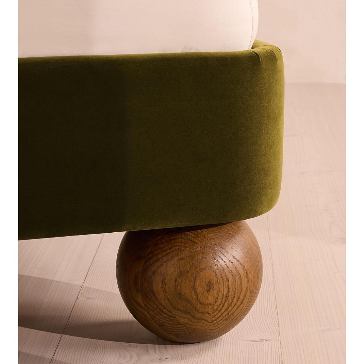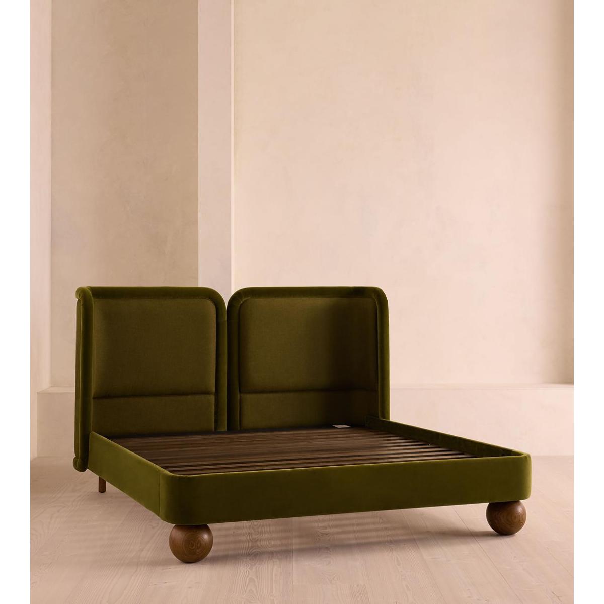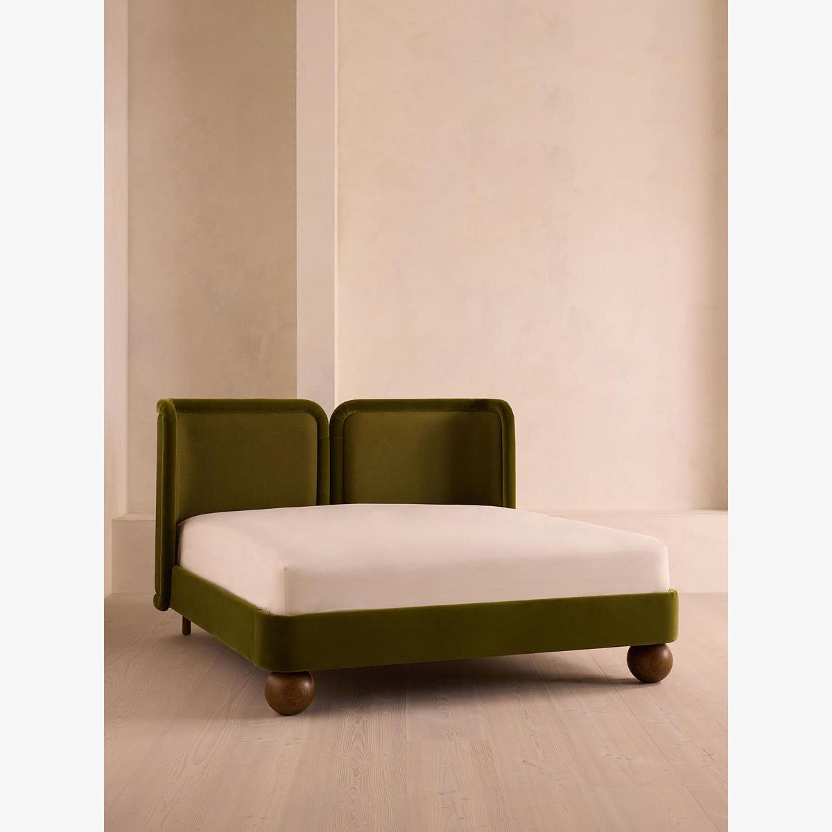 A vertically split headboard in velvet and linen upholstery curves in at either side to create a cosy, cocooning silhouette. Vertically split through the middle to create a balanced, symmetrical silhouette, the headboard of our Willem bed curves inwards at either side for an enveloping finish. The frame is grounded by large bun feet carved from solid oak, and finished in a mix of olive velvet and linen upholstery.