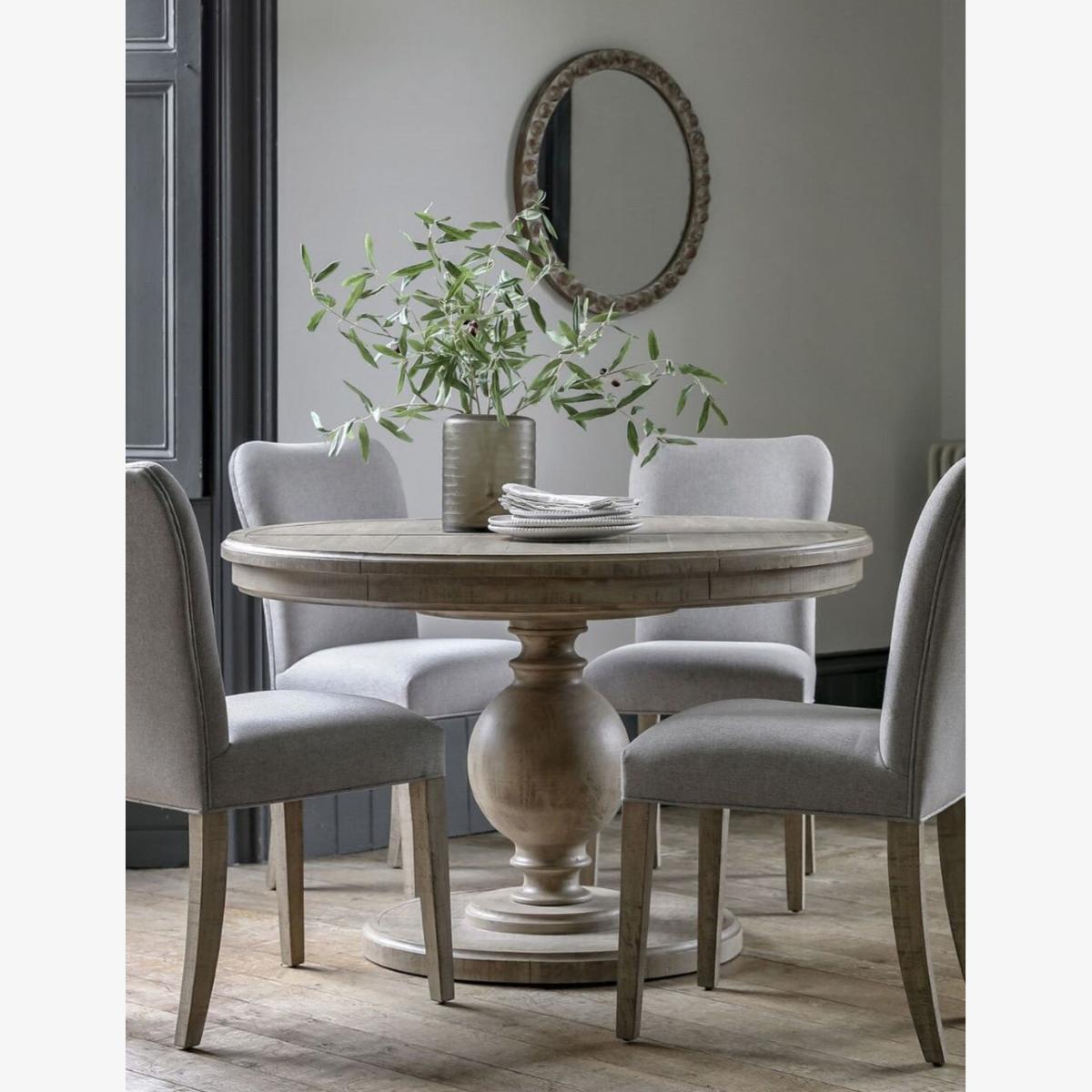 I love how the William dining table combines classic detailing with a clever extendable top - the single pedestal keeps the space feeling open and makes it easy to slide in extra chairs when you need them. The weathered oak finish works just as well in a laid-back coastal scheme as it does in a city apartment craving a hint of warmth. For styling, stick to simple, natural textures: pair with linen-upholstered chairs and centre a tall ceramic vase of greenery. If you want more contrast, switch to charcoal velvet seats and add a statement pendant light centred above. Keep tabletop accents minimal - a runner, a few candles and fresh foliage are all you need.