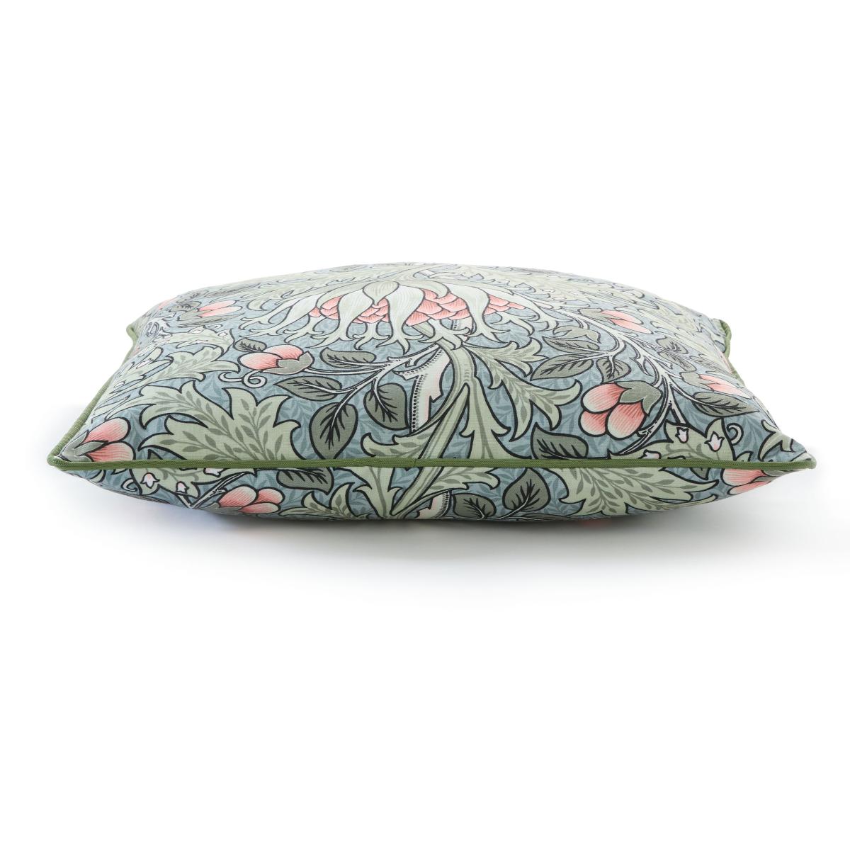* Made from polyester* Floral design* Removable cover* Polyester fibre filling* Zipper closure With a touch of 1898 artistry, the William Morris Artichoke Cushion brings an eye-catching burst of style in sage green, soft blue, and plaster pink. Inspired by Morris' bold wallpaper motif, this cushion's woodblock design feels both striking and fresh. Finished with smart piping and a plain dyed reverse, it’s a versatile piece that coordinates beautifully with any bed linen. Plus, it’s filled with a feather-soft, eco-friendly microfibre, giving it the luxury feel of feather without the feather – making it the perfect blend of elegance and sustainability.