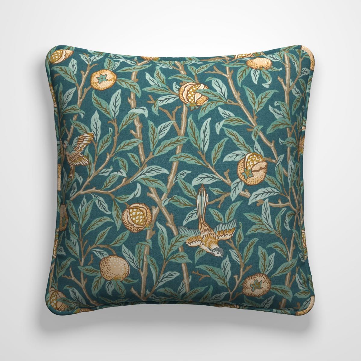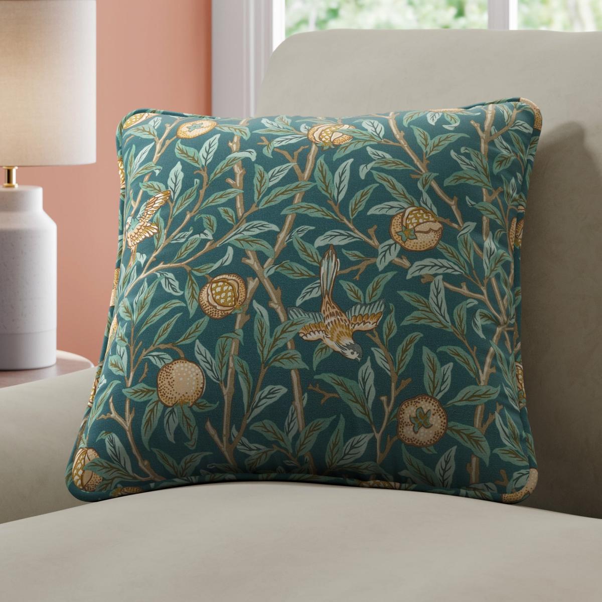 A beautiful and dynamic Morris design featuring perching and swooping birds against a network of foliage and an abundance of ripe pomegranates – some whole, some bursting open and others getting pecked at by diving birds. The inspiration for this piece was William Morris’s much earlier pattern, ‘Fruit’, which similarly depicts luscious pomegranates amongst branches, leaves and blooming pomegranate flowers. With nature as the focus, this vibrant and whimsical design is a fine example of Morris’s characteristic style. Pairing iconic William Morris patterns with excellent British manufacturing, our Made to Order service brings you a selection of beautiful William Morris At Home designs, with exclusive colourways to Dunelm, allowing you to create a uniquely individual look in your home. Available in both a plain and piped design, this cushion cover can be paired with our matching Made to Measure Curtains or Roman Blinds to give your home, office or commercial space a beautifully co-ordinated finish. Book an appointment with one of our expert consultants who will guide you through the process of creating your very own made to order cushion cover.