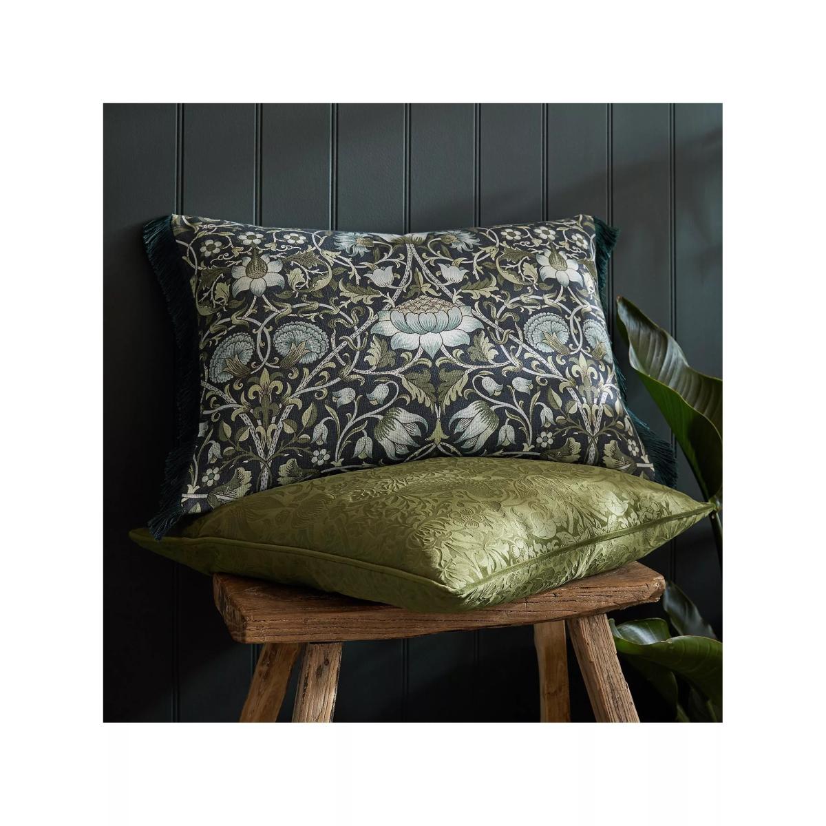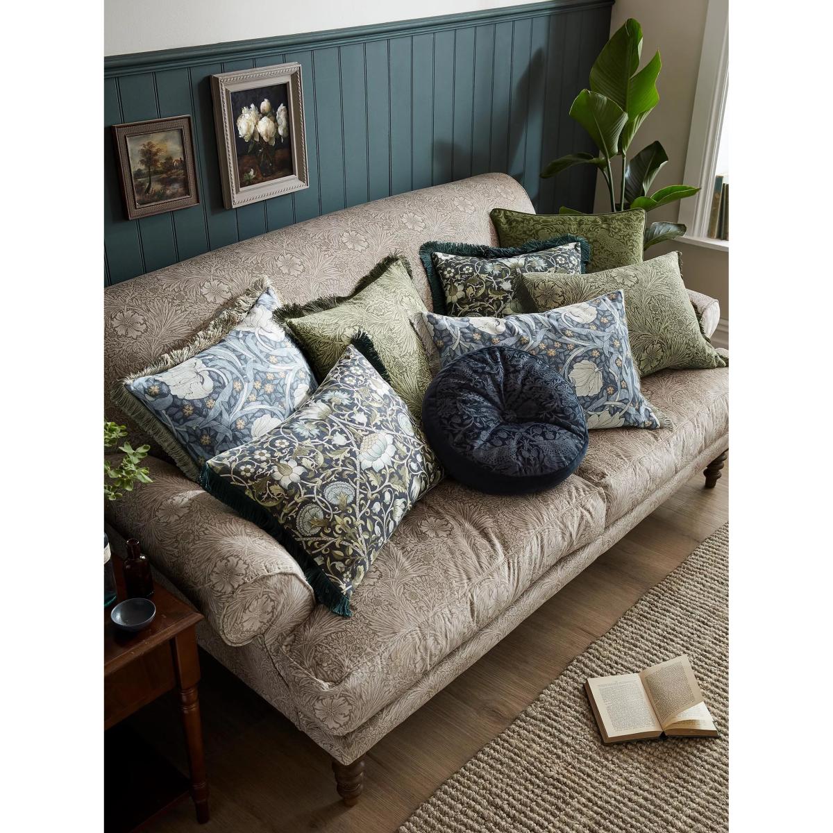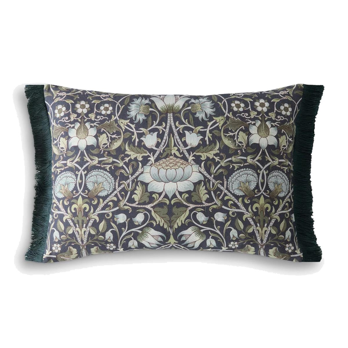 From 1883, Wiliam Morris began designing a series of gently flowing patterns named after tributaries of the river Thames. This pattern is part of this series, named after the river Lodden, that flows through Berkshire and Hampshire. In rich deep blue and olive-green tones, the Lodden design is digitally printed onto a sophisticated linen-look base and has a complementary plain, cotton-velvet reverse. This statement cushion is finished with a jewel-coloured blue fringing for a luxurious touch.