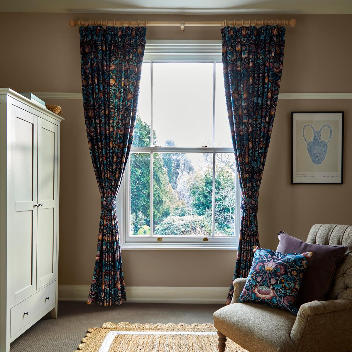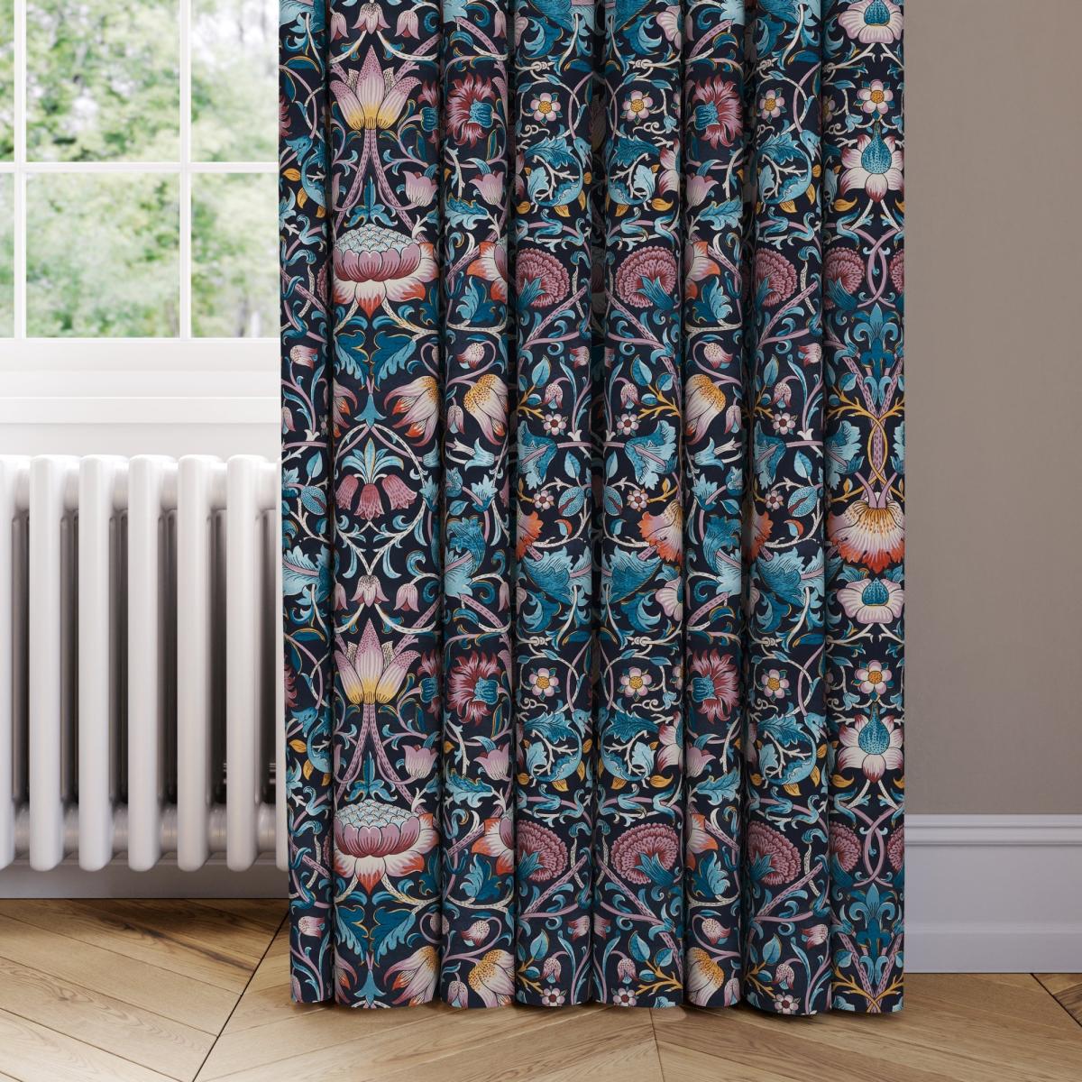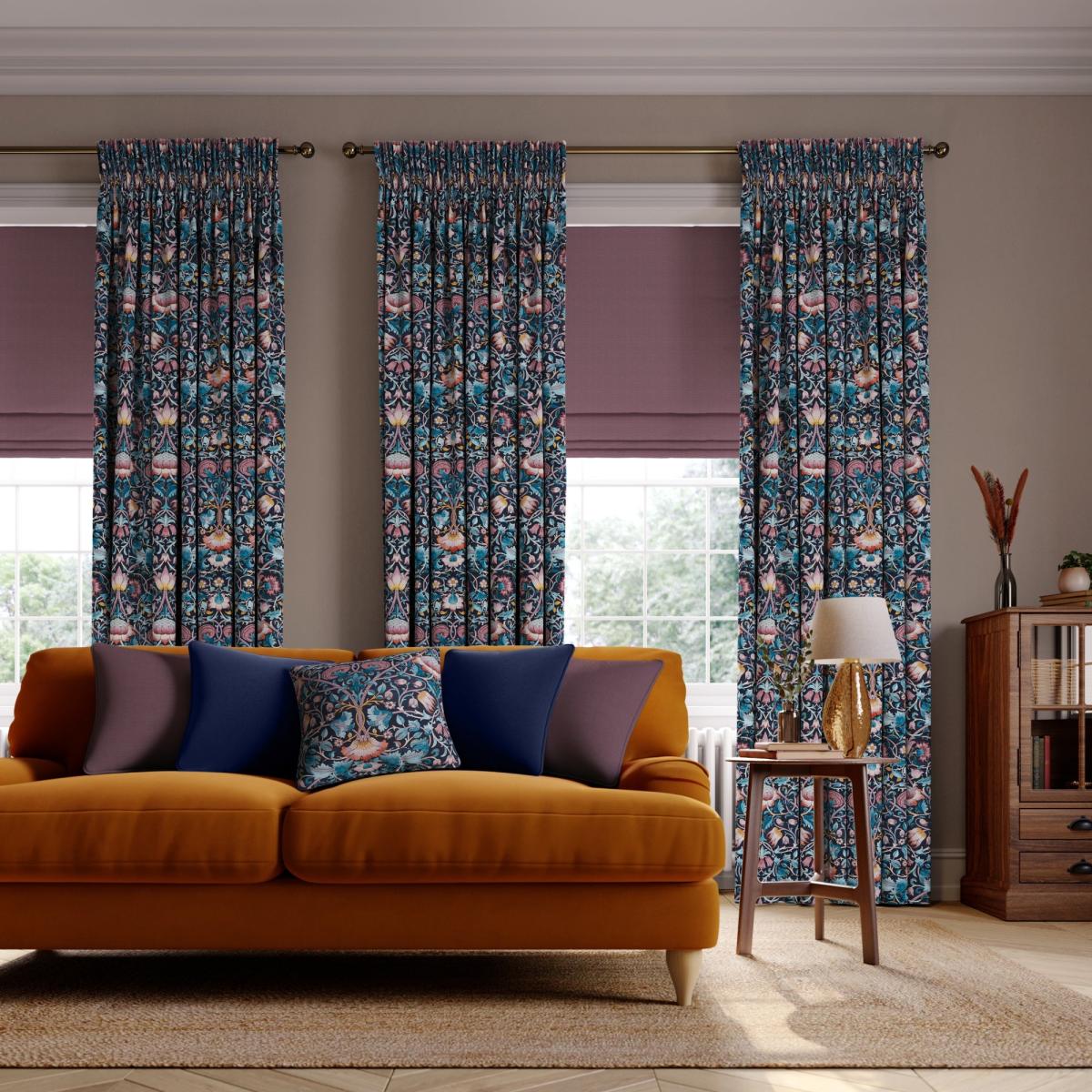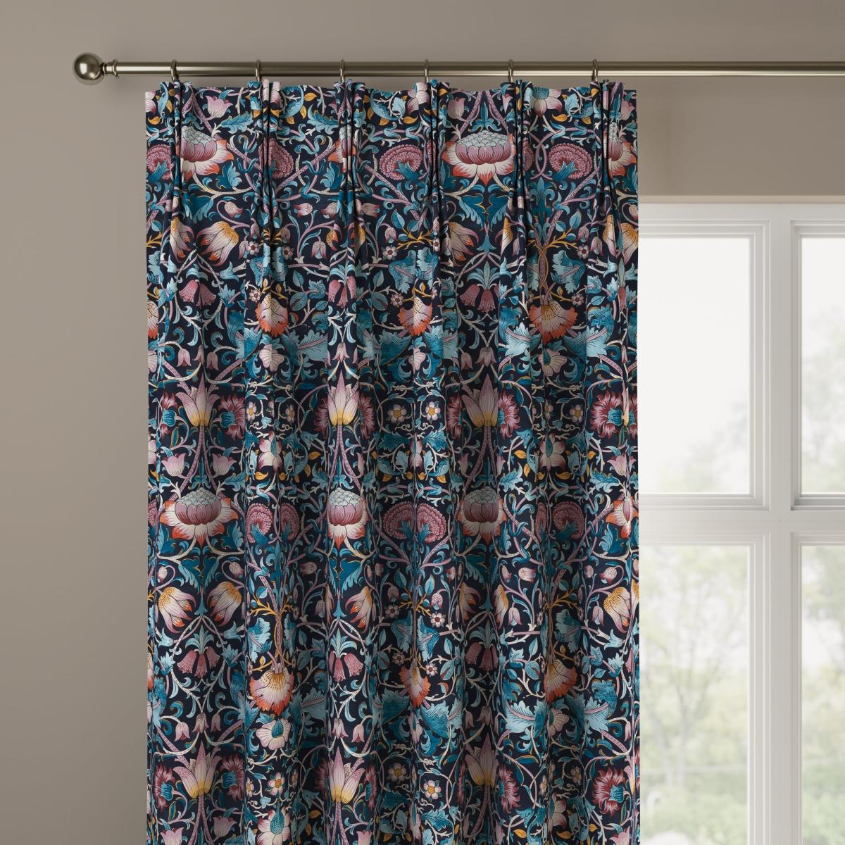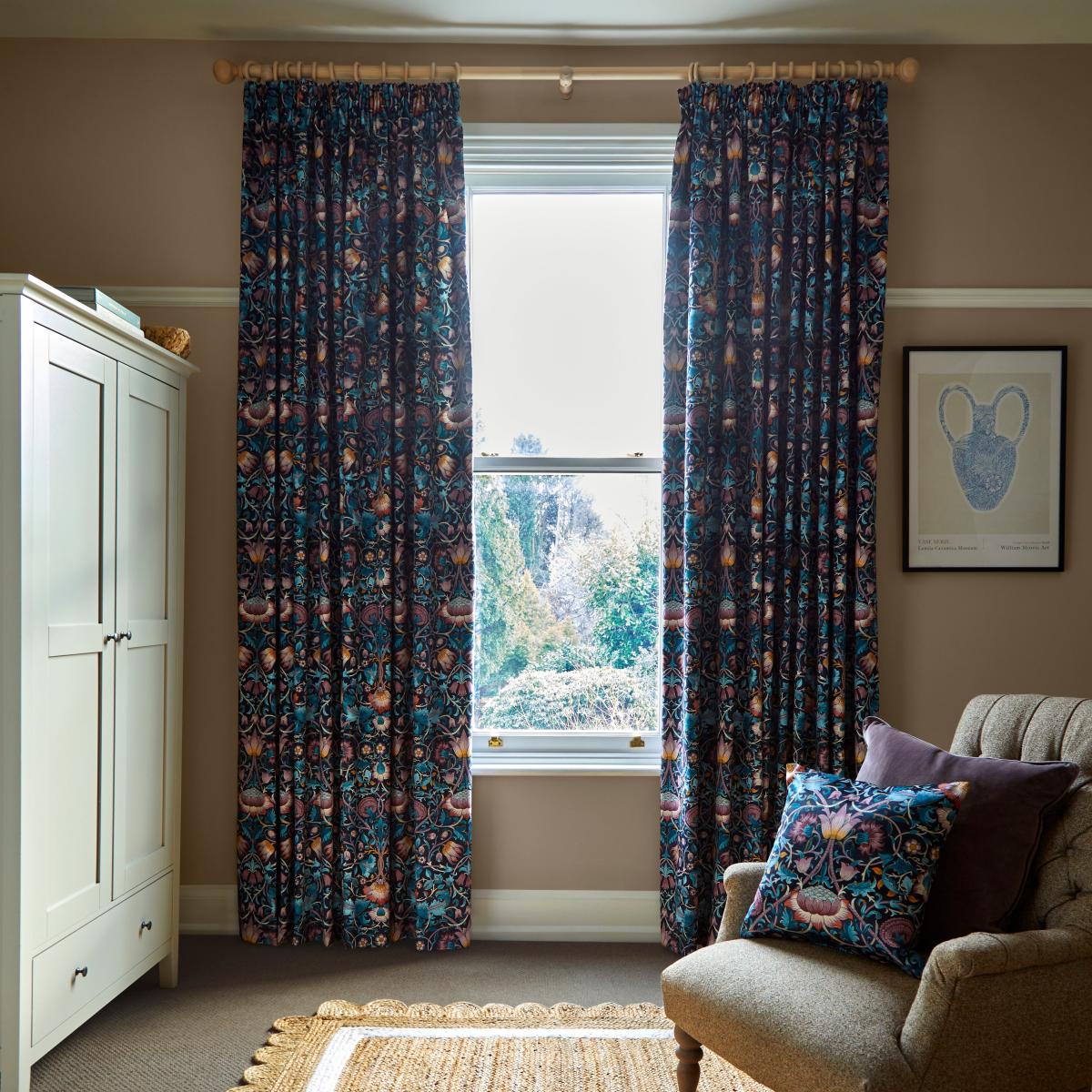 * Exclusive colourways to Dunelm* Selection of header types available* Available in a range of linings* Made to your individual measurements* Made in the UK* Made from recycled polyester William Morris had a great admiration for rivers, from the humble stream that passed by Kelmscott Manor to the great River Wandle that he used to dye his textiles at Merton Abbey. From 1883 Morris began designing a series of gently flowing patterns named after tributaries of the River Thames. The ‘Lodden’ pattern is part of this series, named after the River Loddon that flows through Berkshire and Hampshire. Pairing iconic William Morris patterns with excellent British manufacturing, our Made to Measure service brings you a selection of beautiful William Morris At Home designs, with exclusive colourways to Dunelm, allowing you to create a uniquely individual look in your home. Available in a range of headers, these curtains can be paired with matching Roman Blinds, or Made to Order Tiebacks and Cushion Covers to give your home a beautifully coordinated finish. Book an appointment with one of our expert consultants who will guide you through the process of creating your very own made to measure curtains. Please note: If your measured width is over 124cm your curtains will come with a fabric join to provide the full width required.