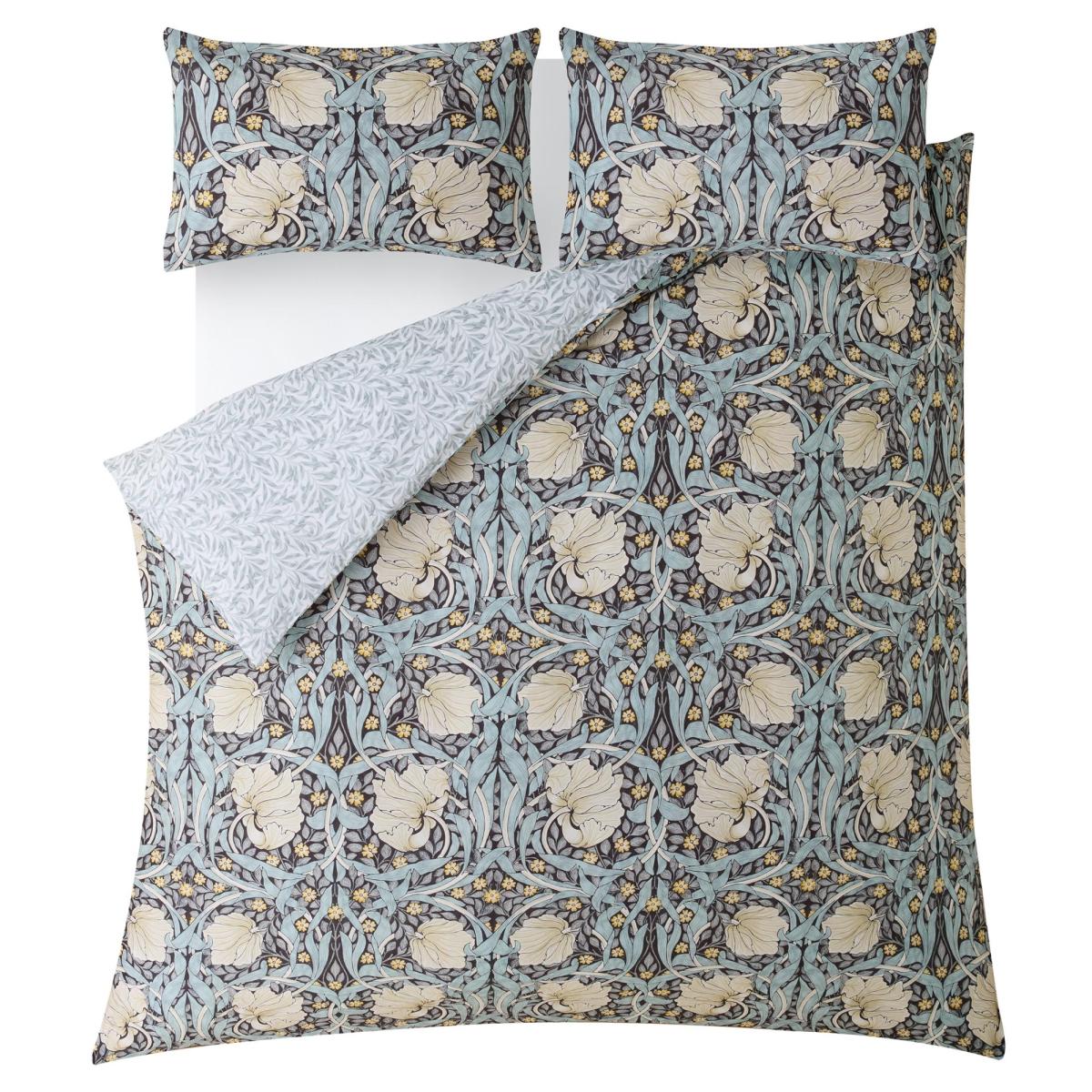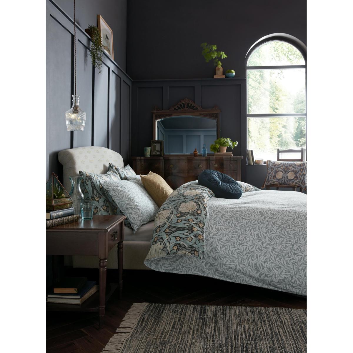 The William Morris At Home Pimpernel Duvet Set – Indigo features large tulips and curling leaves intertwined with delicate foliage and small pimpernel flowers, all inspired by a hand block-printed design from the William Morris Gallery archive. Originally hung at Kelmscott Manor, Morris’s summer home, this stunning design is now digitally printed onto luxurious 220-thread-count cotton sateen in rich indigo blue tones with bright yellow accents. The duvet set is paired with Morris’s signature Willow design on the reverse in a soft blue shade, making this bedding both impactful and elegantly timeless. Please note : Cushions not included 100% Cotton Sateen. 220 Thread Count Digitally Printed Bedding Reversible Bed Set Duvet Set includes 2 Standard Pillowcases. Standard Pillowcase Pair also available to purchase separately. Dimensions Double 200 x 200cm King 230 x 220cm Super King 260 x 220cm Pillowcases 50 x 75cm All screens vary in colour reproduction and whilst every effort has been made to display the colour as accurately as possible it is for guidance only.