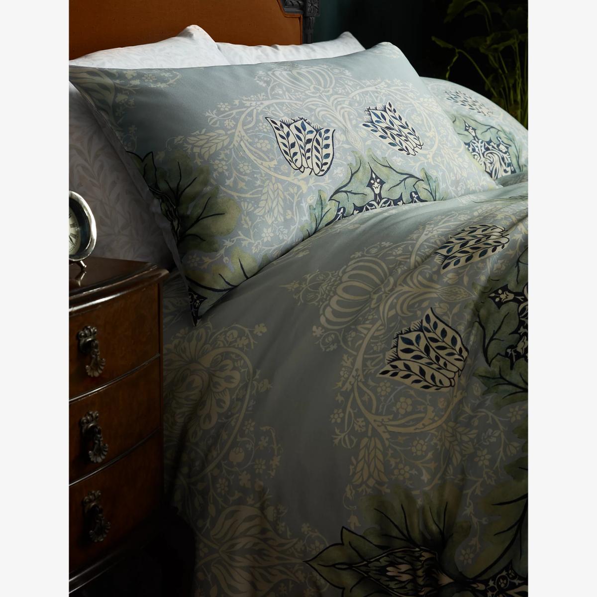 Complete your bedroom in striking style with this Avon Chintz bedding set from William Morris At Home. It's crafted from luxurious pure cotton with a premium 220 thread count so you can snooze in comfort. The print reworks an original William Morris pen, ink and watercolour painting in a rich colour palette for a contemporary feel. Offering two looks in one, the piece features the delicate Willow Bough in soft neutrals on the reverse.