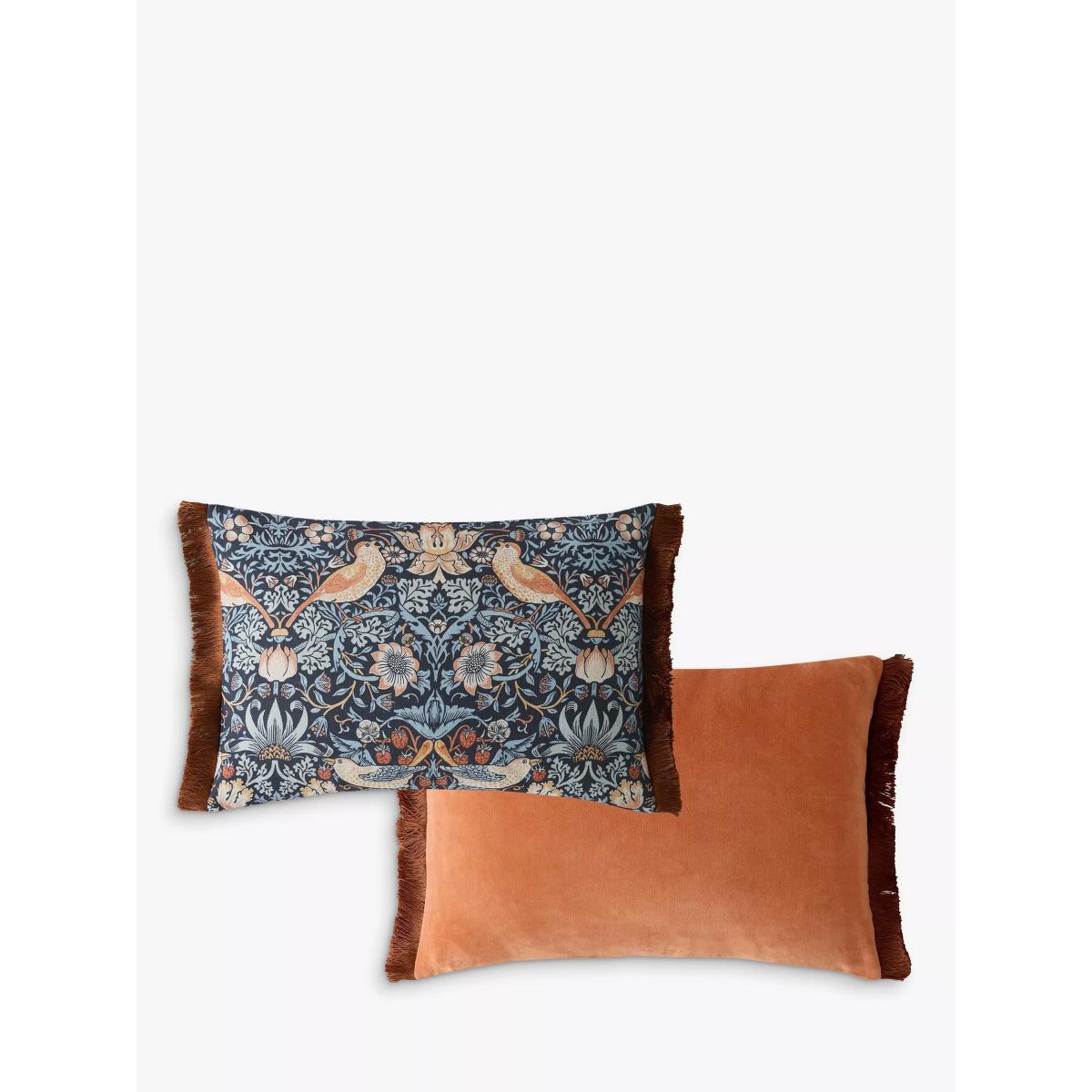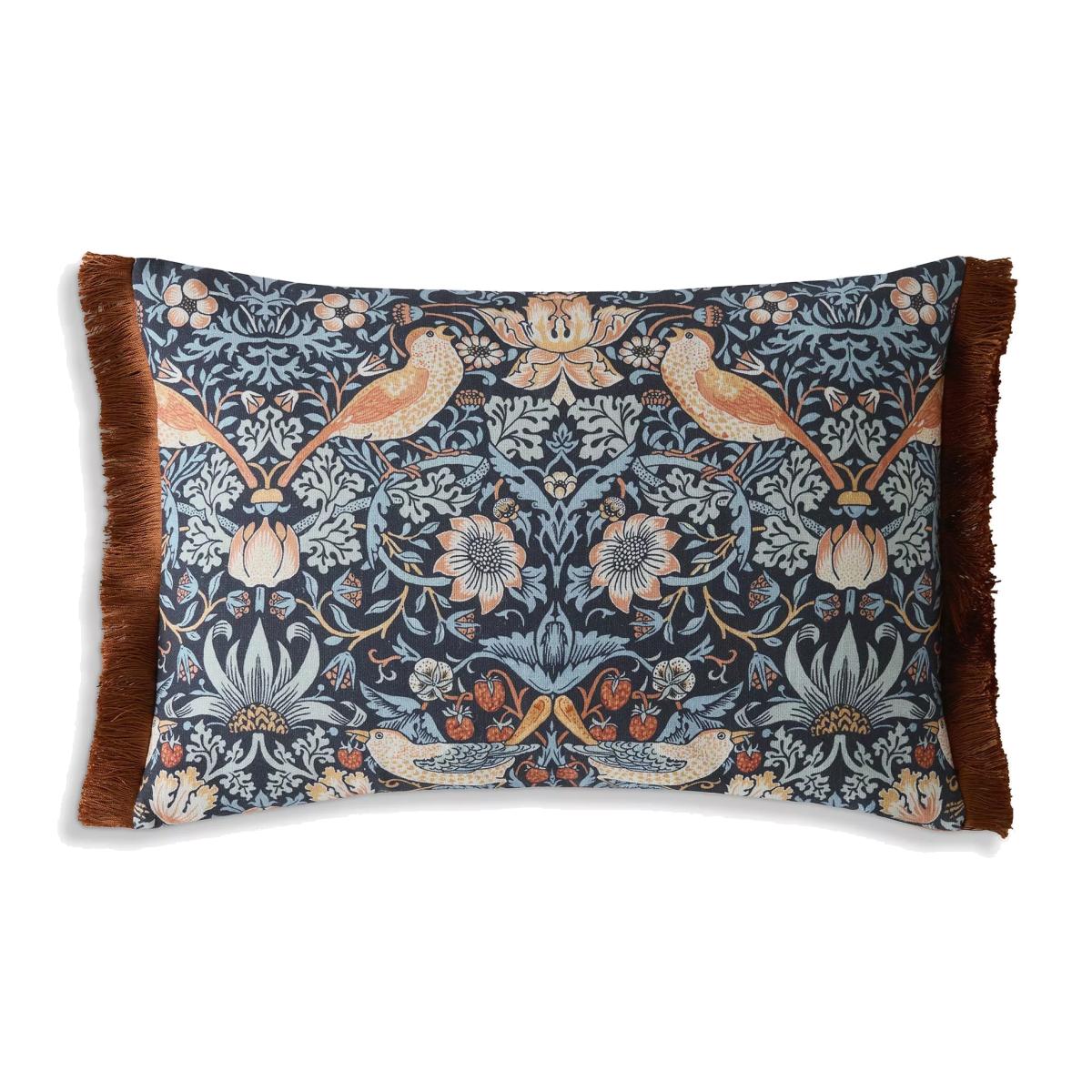 Inspired by the thrushes that crept under his strawberry nets in his garden at Kelmscott Manor, Oxfordshire, Strawberry Thief remains one of William Morris's most popular and iconic designs. Printed in sophisticated tones on a linen-look, cotton base and paired with a complementary, deep, cotton velvet back, the coordinating fringed trim adds luxurious detail.