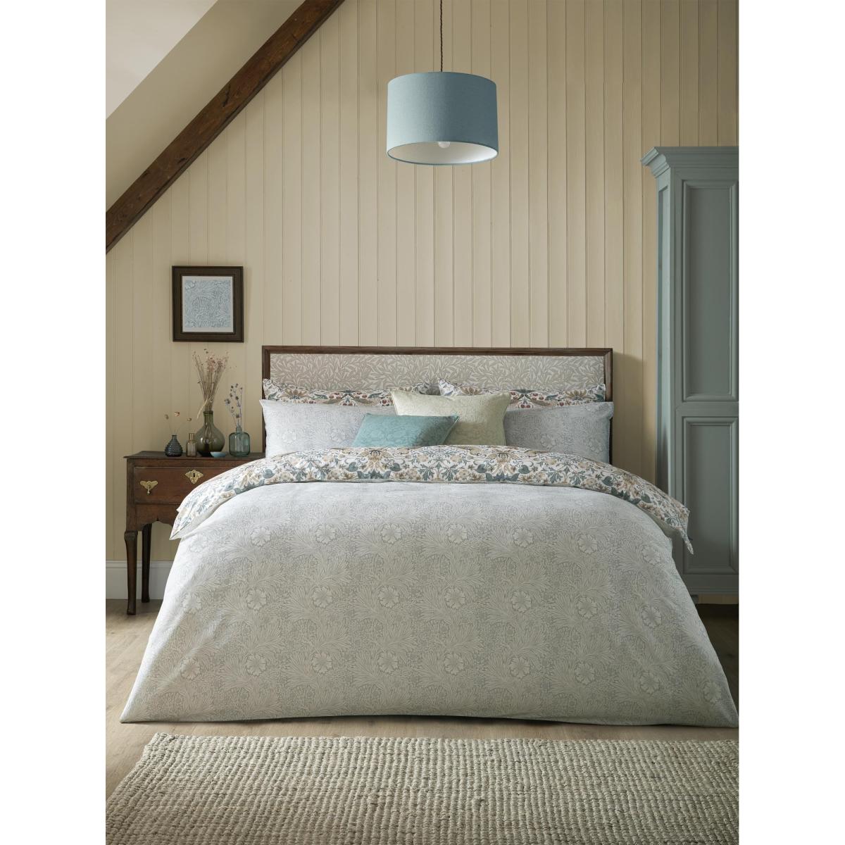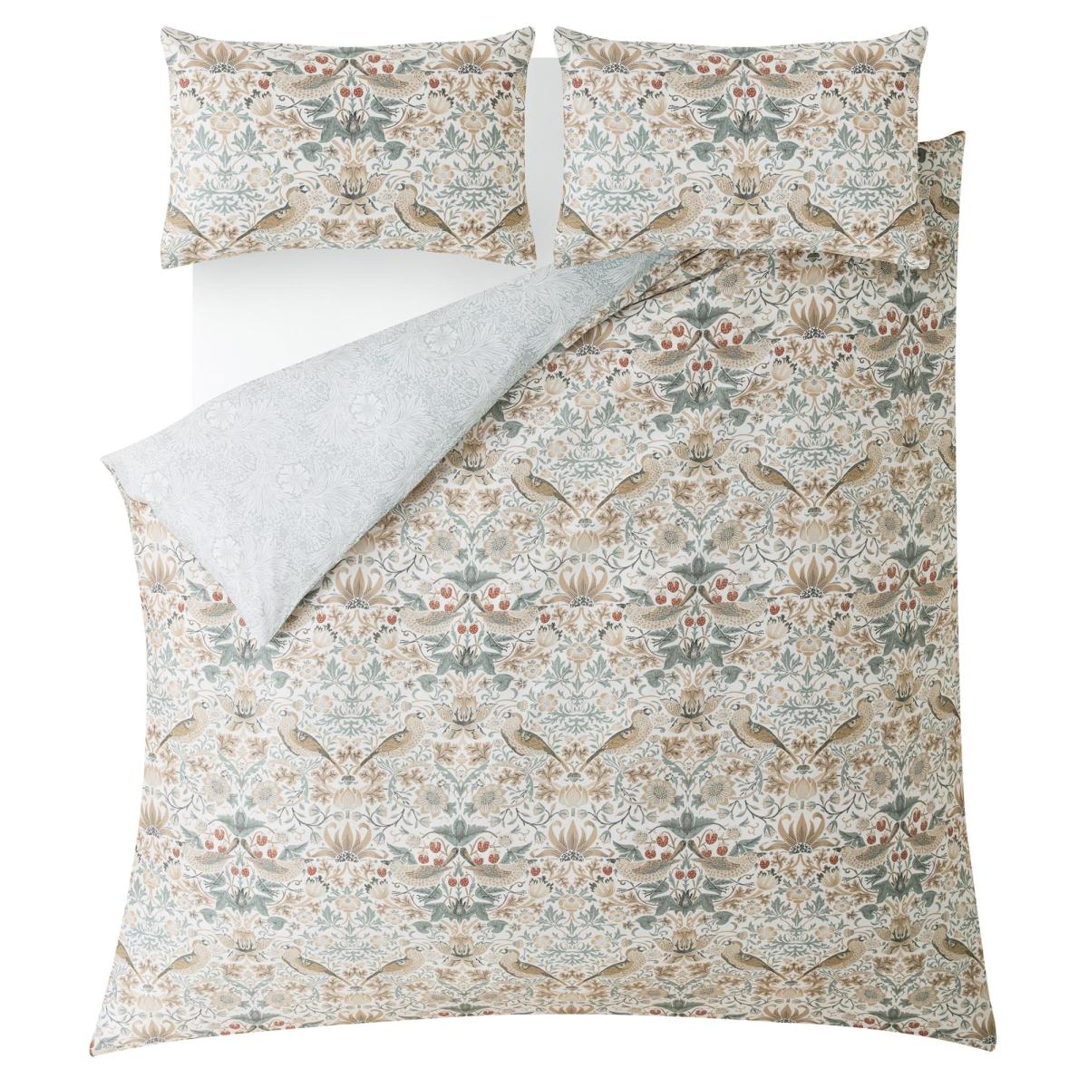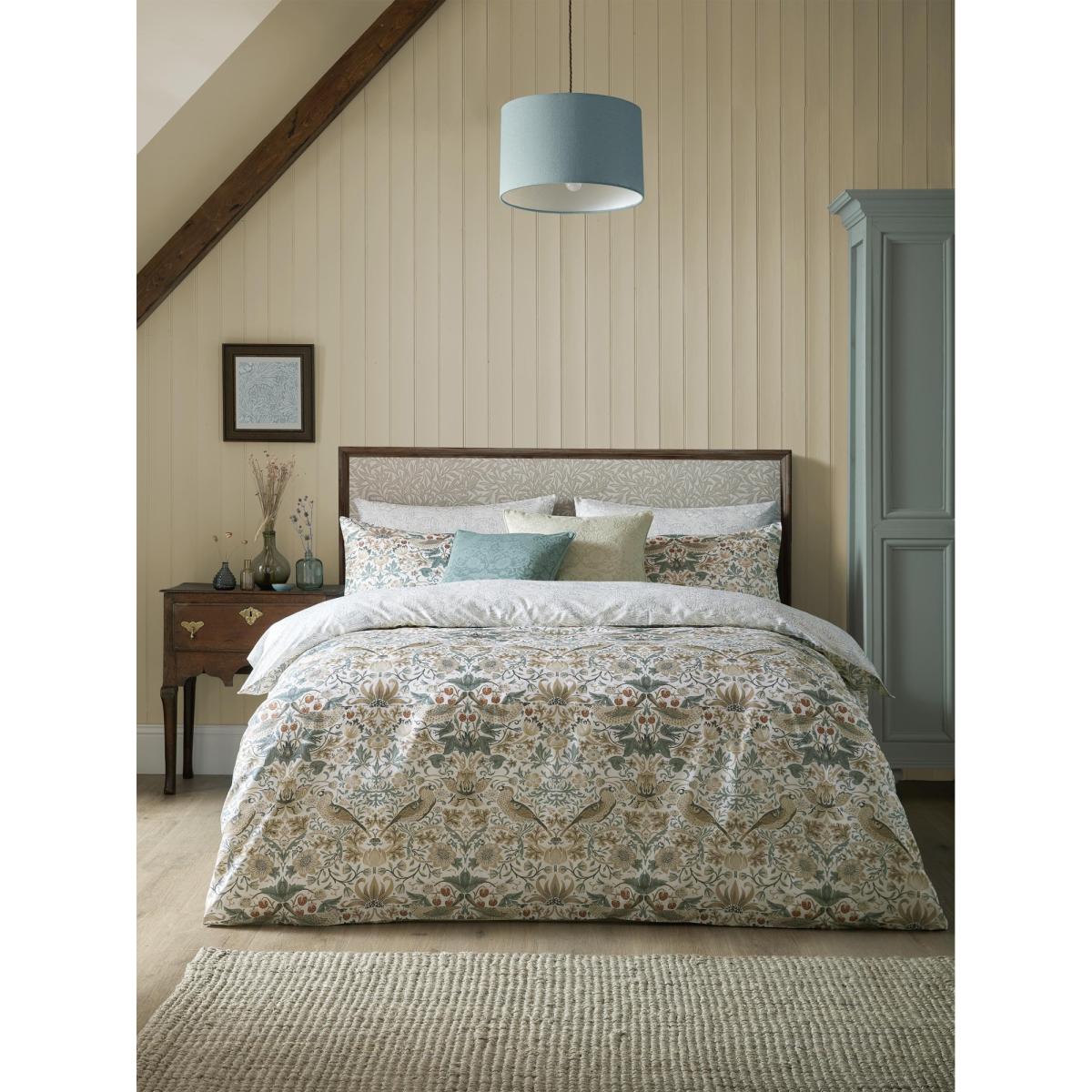 The **William Morris At Home Strawberry Thief Duvet Set – Hessian** features William Morris’s iconic *Strawberry Thief* print, designed in 1883 and inspired by the thrushes that snuck beneath his strawberry nets at Kelmscott Manor in Oxfordshire. This luxurious bedlinen set is digitally printed on a soft 220-thread-count cotton sateen base and is colored in a palette of dusky blues and warm naturals. The reverse showcases an intricate *Marigold* print in a soft blue shade, adding a touch of timeless elegance to your bedroom. Please note : Cushions not included 100% Cotton Sateen. 220 Thread Count Digitally Printed Bedding Reversible Bed Set Duvet Set includes 2 Standard Pillowcases. Standard Pillowcase Pair also available to purchase separately. Dimensions Double 200 x 200cm King 230 x 220cm Super King 260 x 220cm Pillowcases 50 x 75cm All screens vary in colour reproduction and whilst every effort has been made to display the colour as accurately as possible it is for guidance only.