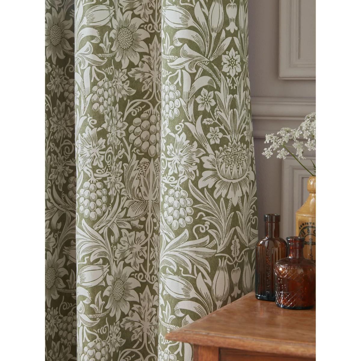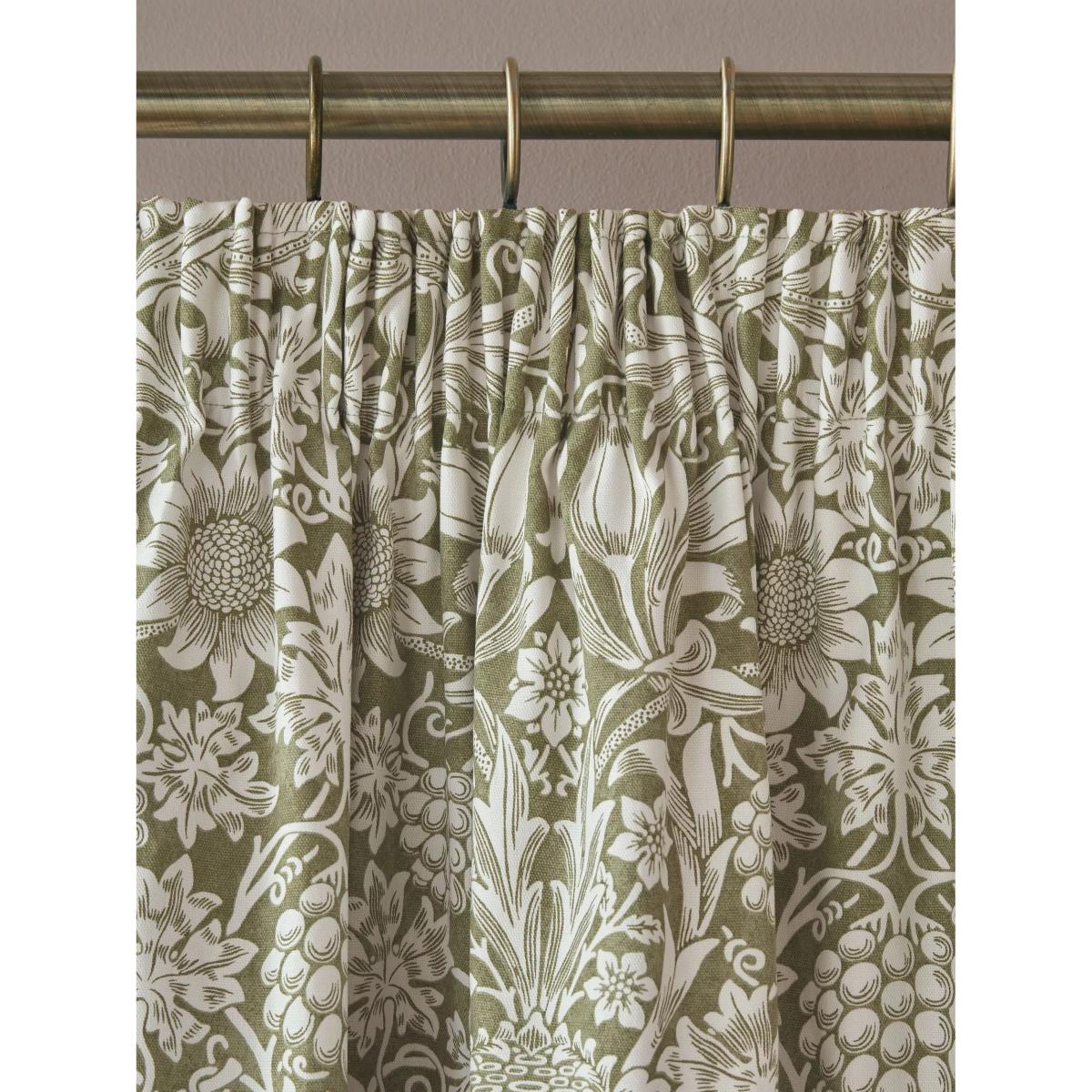William Morris filled his own garden at Kelmscott Manor with many of the kinds of flowers that he reproduced in his wallpaper patterns. Sunflowers were among his favourites. This elegant design, with colours inspired by the archives, brings a modern interpretation to this historic William Morris pattern. Warm in winter, cool in summer As the blackout lining on these curtains blocks out sunlight they help keep your room cool as well as dark. This lining also adds an extra layer of insulation to the curtains, giving them the added benefit of being thermal. They protect against both heat loss and heat gain, regulating the temperature of your room so you’re kept warm in winter and cool in summer. Choosing the right size These curtains can be hung with a pole or track using curtain hooks (not included). There are three hook positions on the heading, allowing you to choose how your curtains sit against the track or pole. For example, if you're using a track you may want to use the middle or lower row of hooks to cover the track, whereas if you're using a pole you may want to use the top row of hooks so the curtains hang below the rings. The specified drop is taken from the top row of hook pockets to the bottom edge of the curtain. The width stated indicates the size of one curtain panel when laid completely flat. This pack contains two panels, and the track/pole length we've recommended allows for the two panels to be gathered when the curtains are drawn. For a fuller look, increase the curtain width. One pair of 162cm width curtains will fit a curtain track/pole size of 133-162cm One pair of 223cm width curtains will fit a curtain track/pole size of 182-223cm Do you need a curtain pole/track and accessories? Shop here.