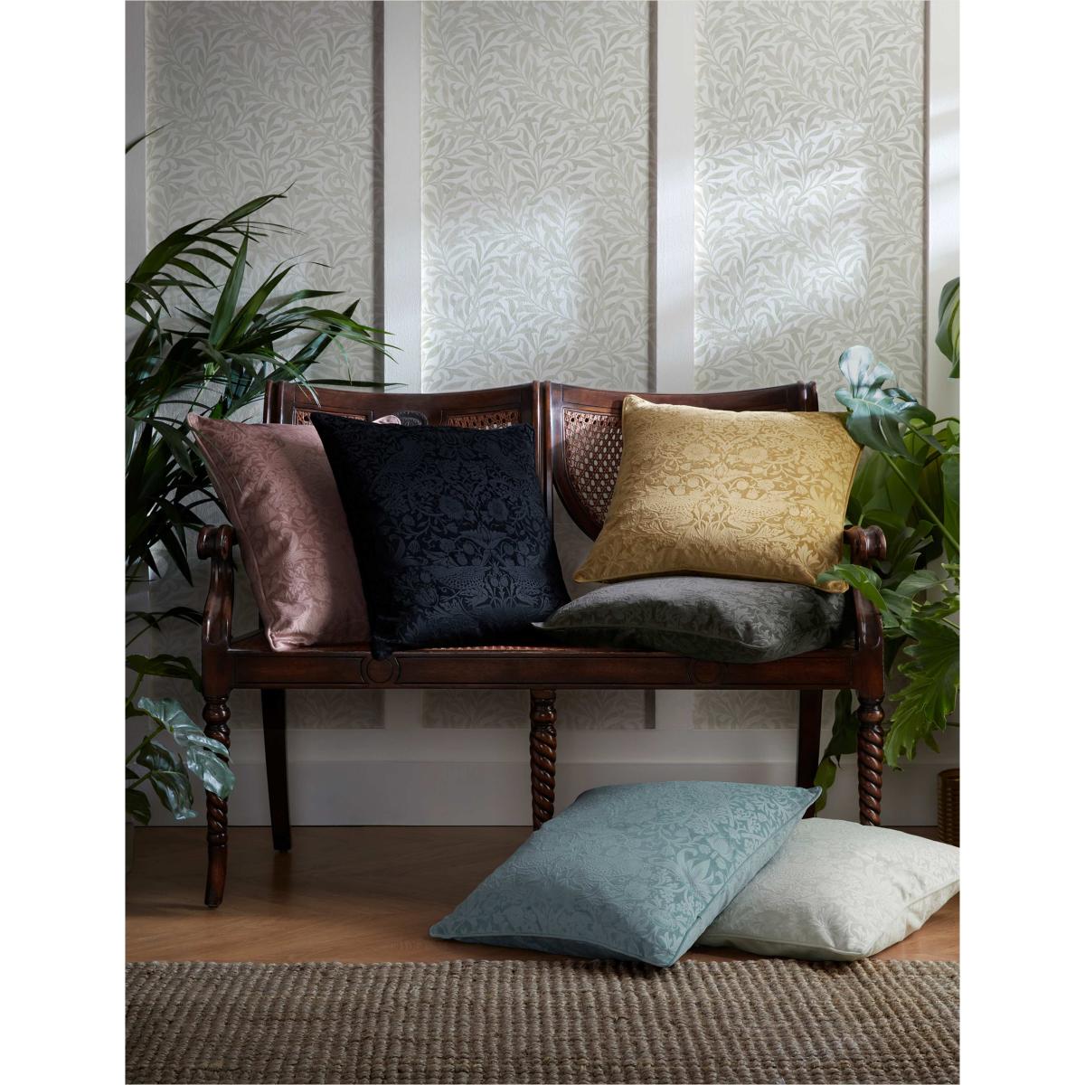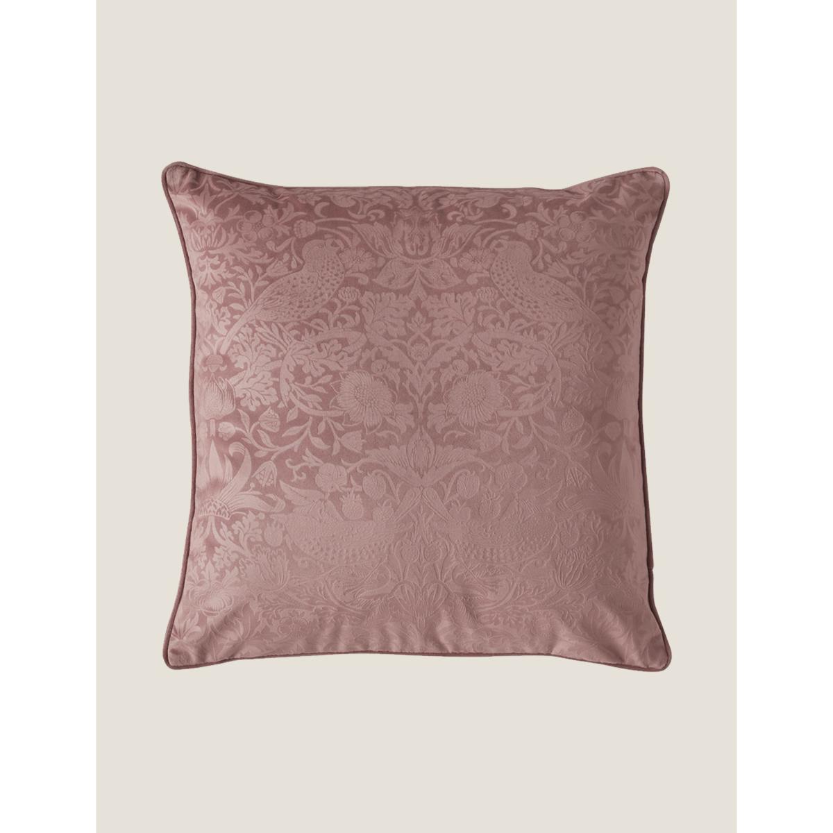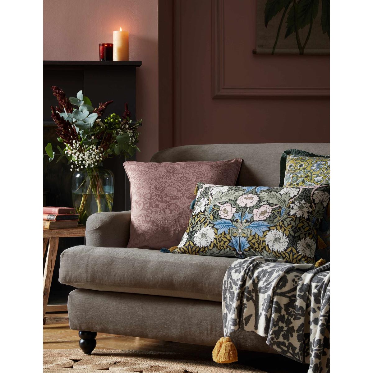 This velvet scatter cushion from William Morris At Home features the iconic Strawberry Thief design. The square-shaped piece is made in a practical medium size, and is filled with feathers for a luxurious sink-in feeling. A piped trim around the edge adds neat finishing detail.